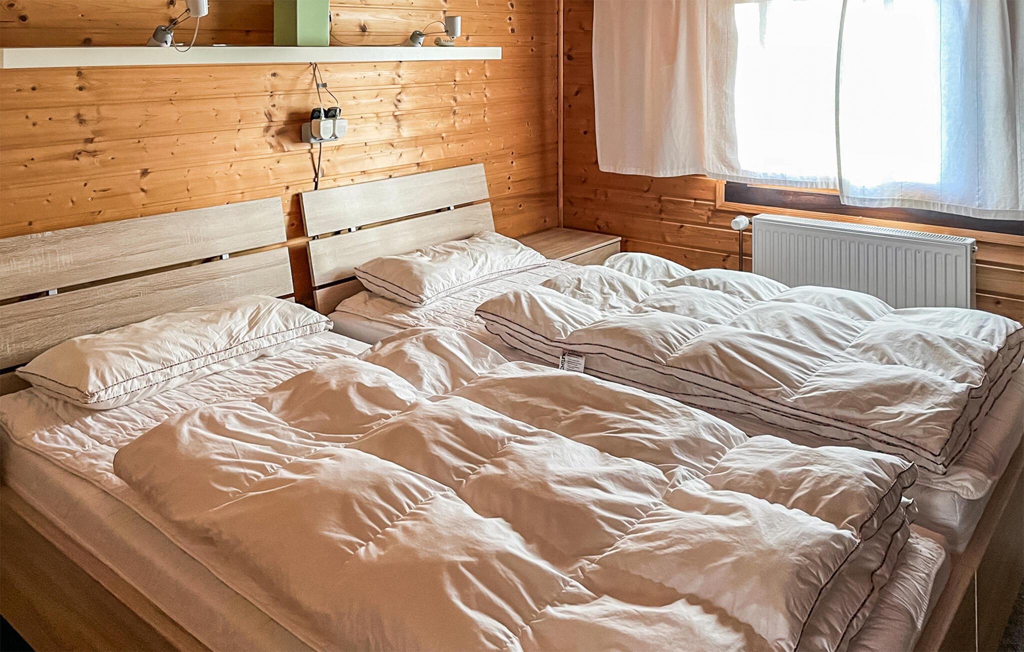 Børneværelset har en køjeseng, og soveværelset har en dobbeltseng med tv, hvor en barneseng også kan placeres efter anmodning.