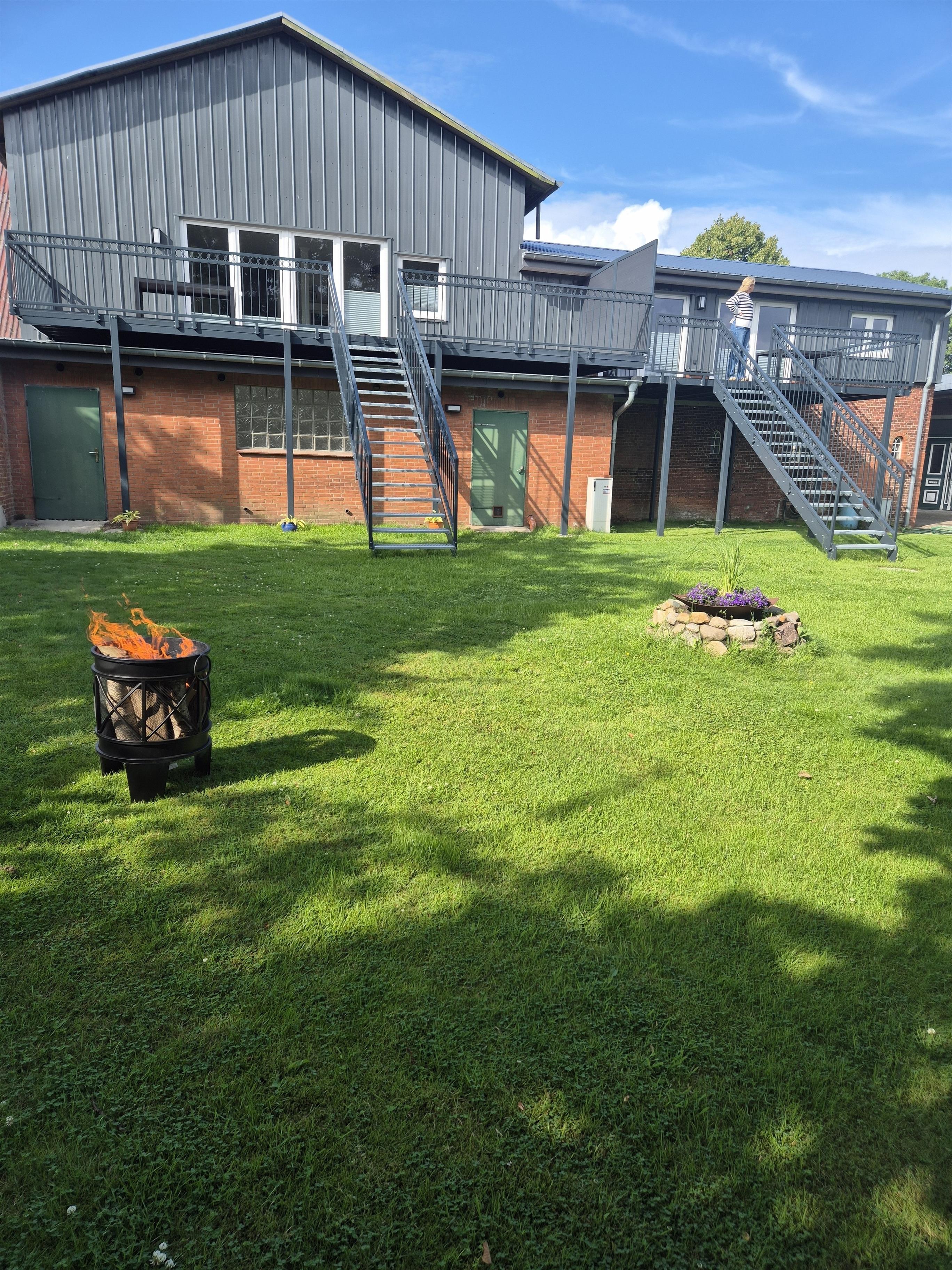 Küche und Wohnbereich befinden sich in einem großen Raum mit 4 Terrassentüren, die auf die Dachterrasse führen. Von dort gelangen Sie über eine eigene Treppe in den angrenzenden Garten. Es sind ausreichend Sonnenliegen, Sitzgelegenheiten, ein Kugelgrill und eine Feuerstelle vorhanden.