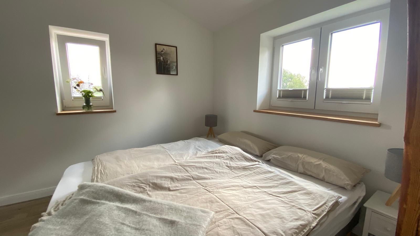 Es befinden sich 2 Schlafzimmer in der Wohnung , ein Doppelbett mit 160 cm x 200 cm und 2 Einzelbetten.