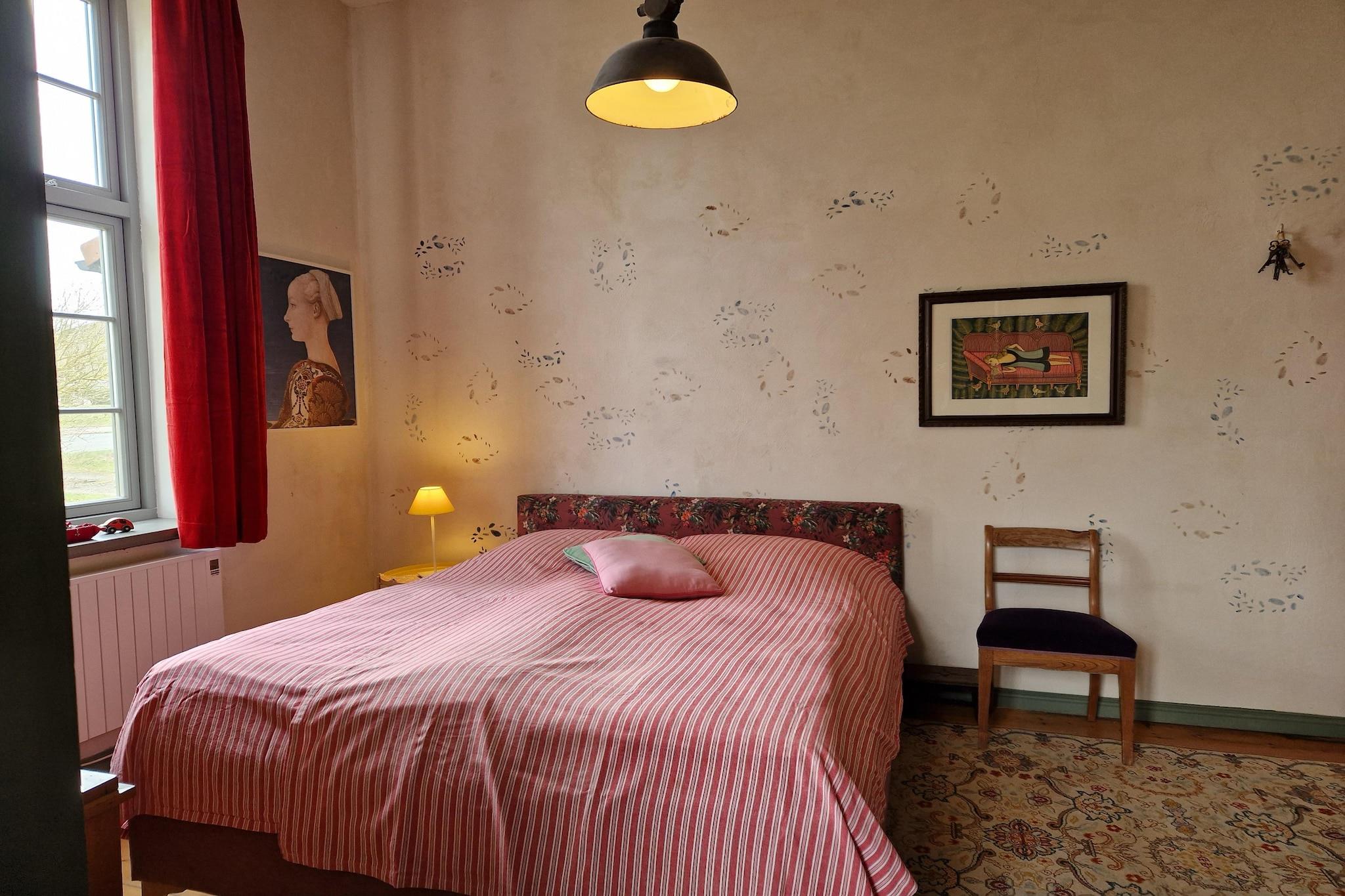 Stueetage: (entre(deles med andre gæster, fælles indgang)(spisebord(4 personer), pejs, kakkelovn(træ)), Stue(dobbeltseng(180 x 200 cm), Fjernsyn(kabel, fladskærm), sofahjørne(6 personer)), køkken-alrum(spisebord, kakkelovn(træ), elkedel, brødrister, komfur(Komfur med fire kogeplader, induktion), kaffemaskine, ovn, køleskab(+ fryser)), soveværelse(dobbeltseng(180 x 200 cm)), soveværelse(dobbeltseng(120 x 200 cm)), soveværelse med gennemgang(enkeltseng), badeværelse(badekar, bruser, håndvask, toilet, føntørrer), varme) terrasse, have(deles med andre gæster), havemøbler, grill, parkering, sandkasse, legeredskaber