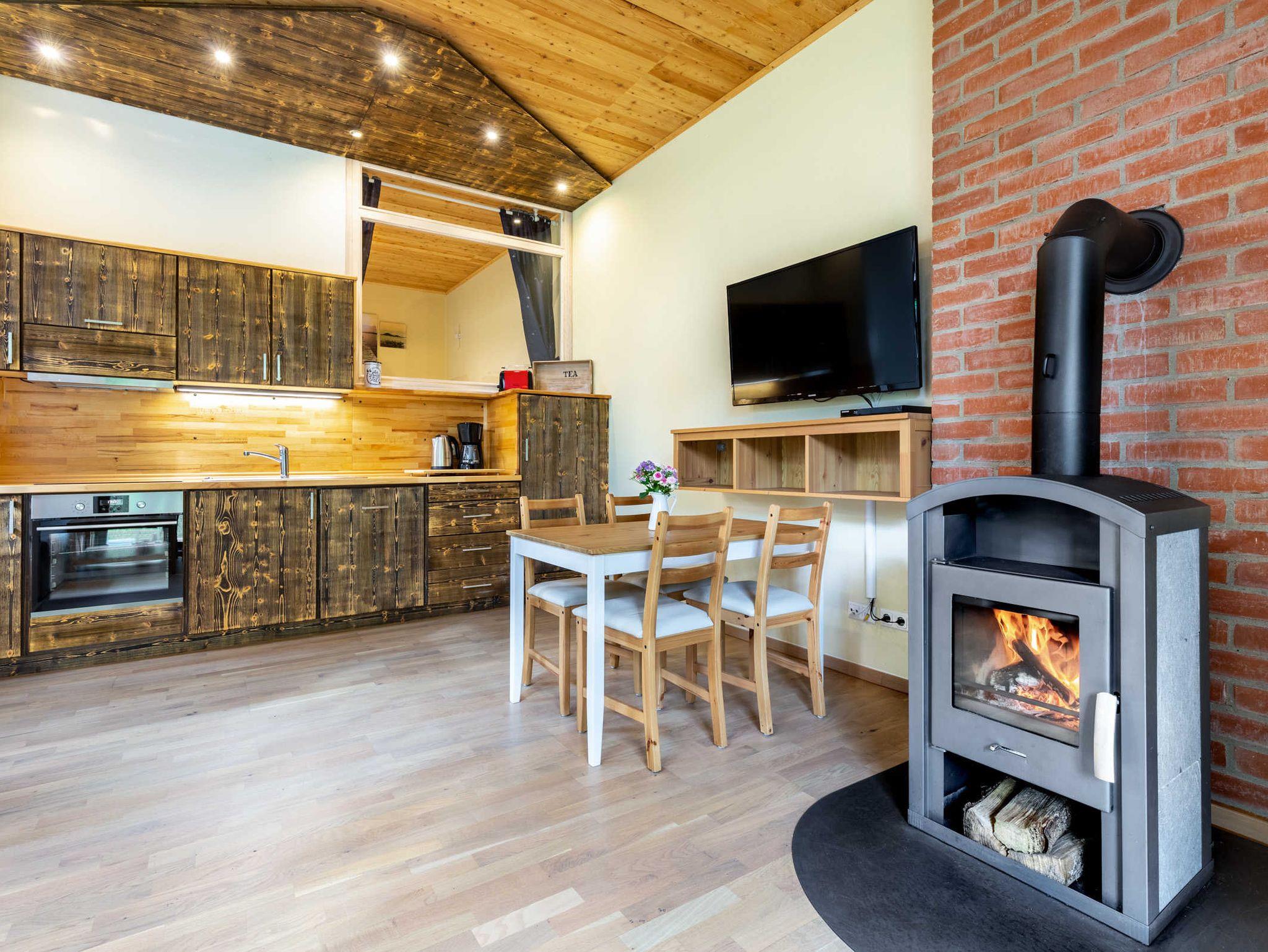 Aus den Wohnzimmern gelangt man direkt auf die gemeinsam genutzte Holzterrasse mit Grill und in den Garten. Der urige Kamin sorgt für warme und stimmungsvolle Abende an kühleren Tagen. Für ausreichend Kaminholz ist gesorgt.