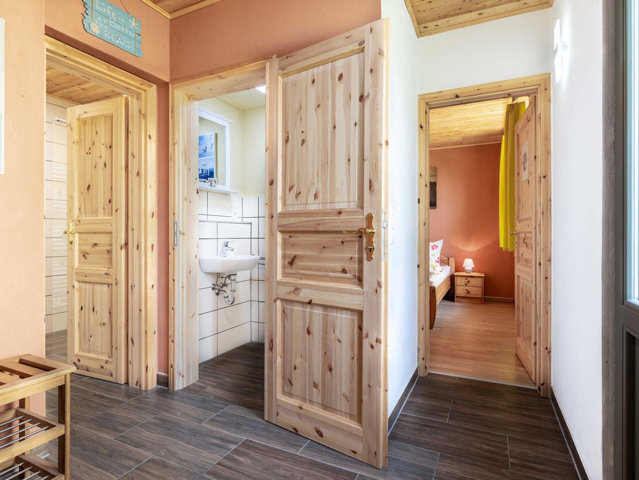 Die vier separaten Schlafzimmer sind für je 2 Personen ausgelegt. Je Ferienwohnung ein Schlafzimmer 1 mit Doppelbett, Kinderreisebett und Kleiderschrank. Schlafzimmer 2 als Galerieschlafzimmer mit 2 Einzelbetten sowie Kleiderkommode.