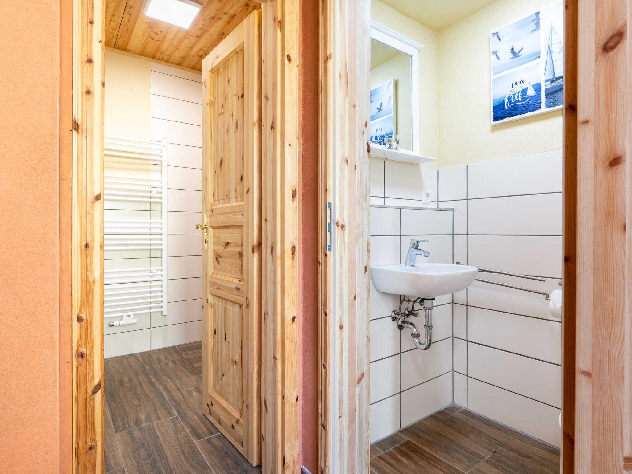 Bad mit Dusche, Waschbecken und Waschmaschine. Separates WC mit Waschbecken.