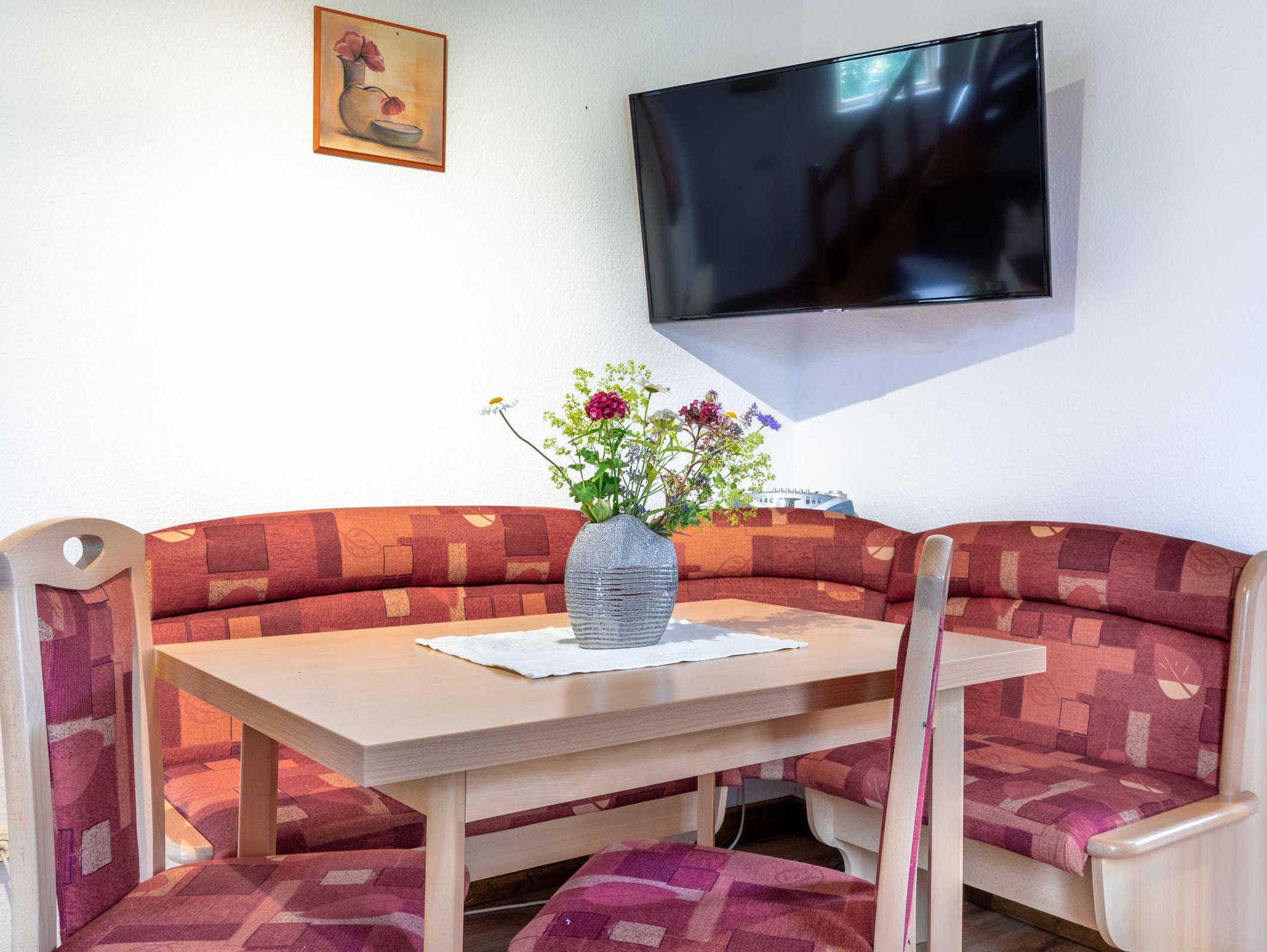 Unterer Bereich: Wohnzimmer mit gemütlichem Sitzbereich und TV, Küchenecke mit Kaffeemaschine,2- Platten- Herd, Mini Backofen, Toaster, Wasserkocher und Esstisch. Bad mit Dusche und WC