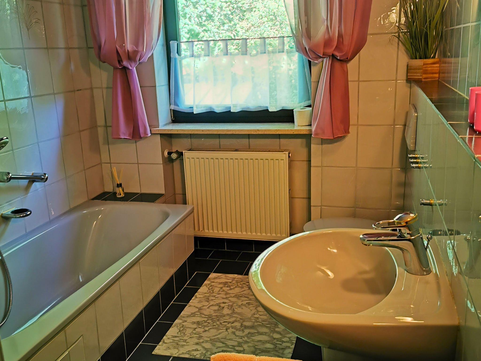 Die Ferienwohnung 1. befindet sich im 1. Stock und bietet ausreichend Platz für 2 Personen (ca. 55 m²). Sie ist ideal für Dienstreisen. Die Wohnung besitzt ein Schlafzimmer mit 2 Einzelbetten und einen kleinen Balkon. Der Wohn- Essbereich bietet eine Schlafcouch, eine Essecke, Kabel-TV und Kachelofen. Das Bad mit Dusche, Badewanne, WC, Bidet und Waschbecken besitzt auch einen Fön. WLAN ist kostenlos. Die kleine gut ausgestattete Küche mit einer Microwelle lädt zum Kochen ein. Gegen ein kleines Endgeld kann auch die Waschmaschine und der Trockner mitbenutzt werden.