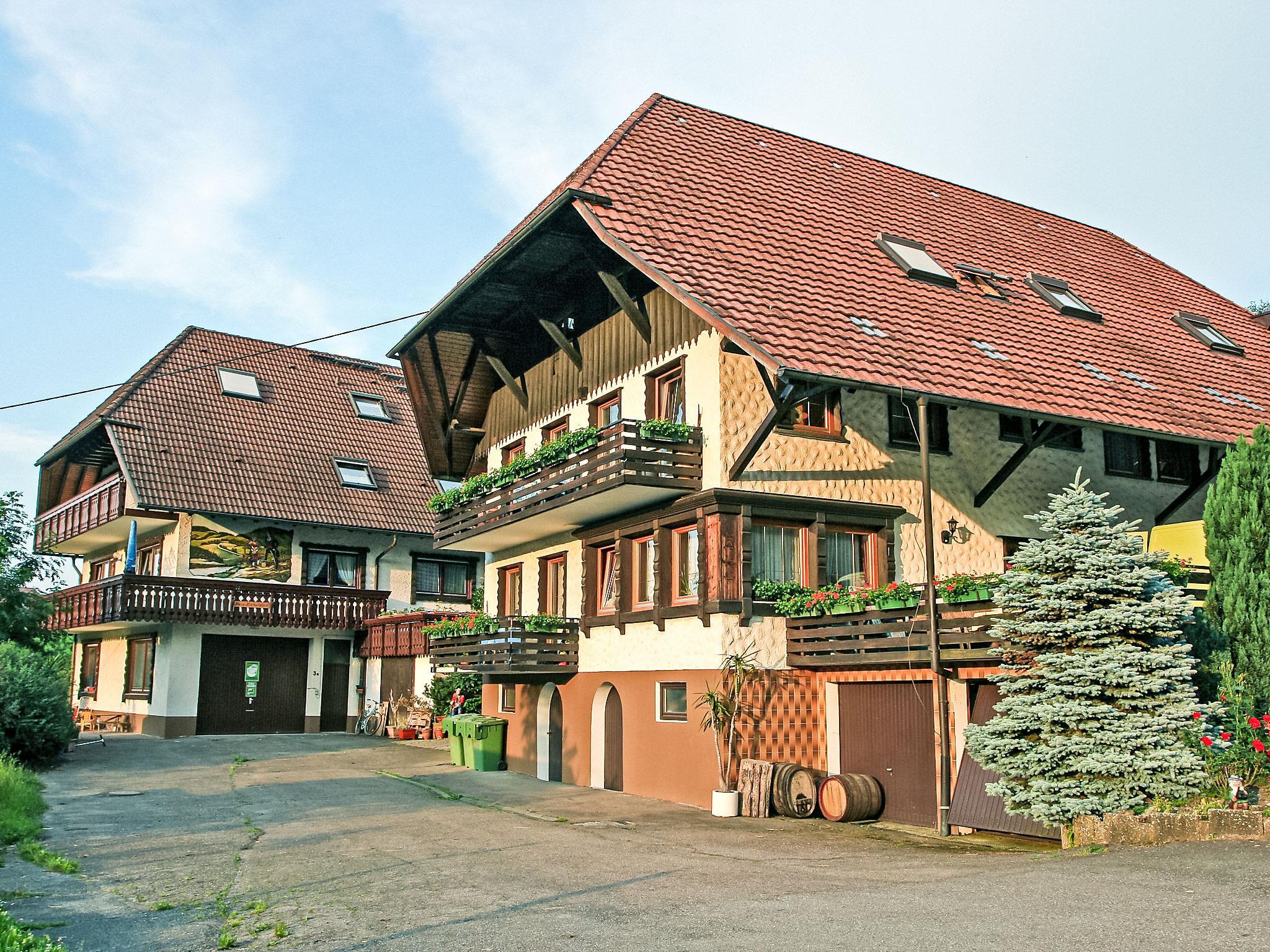 Apartment house "Pension Himmelsbach". In the district of Welschensteinach, on the outskirts, 4 km from the centre of Steinach, in a quiet, sunny, elevated position on a slope, in the countryside. For shared use: property, lawn for sunbathing, swimming pool (10 x 5 m, seasonal availability: 01.Jun. - 30.Sep.). Slide, table tennis, barbecue, children's playground. In the complex: lounge, billiard table, central heating system, washing machine (extra), tumble dryer (for shared use, extra). Stepped path (17 steps) to the house. Parking at the house. Shop 1 km, grocery 4 km, restaurant 1 km, bus stop 100 m, railway station "Steinach" 4 km, outdoor swimming pool 4 km, indoor swimming pool 4 km. Golf course (18 hole) 8 km, tennis 4 km, riding stable 1 km. Nearby attractions: Zeller Keramik 5 km, Altstadt Haslach 8 km, Freilichtmuseum Vogtsbauernhöfe 8 km. Well-known lakes can easily be reached: Mummelsee 35 km. Hiking paths: Kinzigtal 2 km. Use of the shared whirlpool on request. In the adjacent courtyard building, the house owner still runs a small part-time farm with goats.