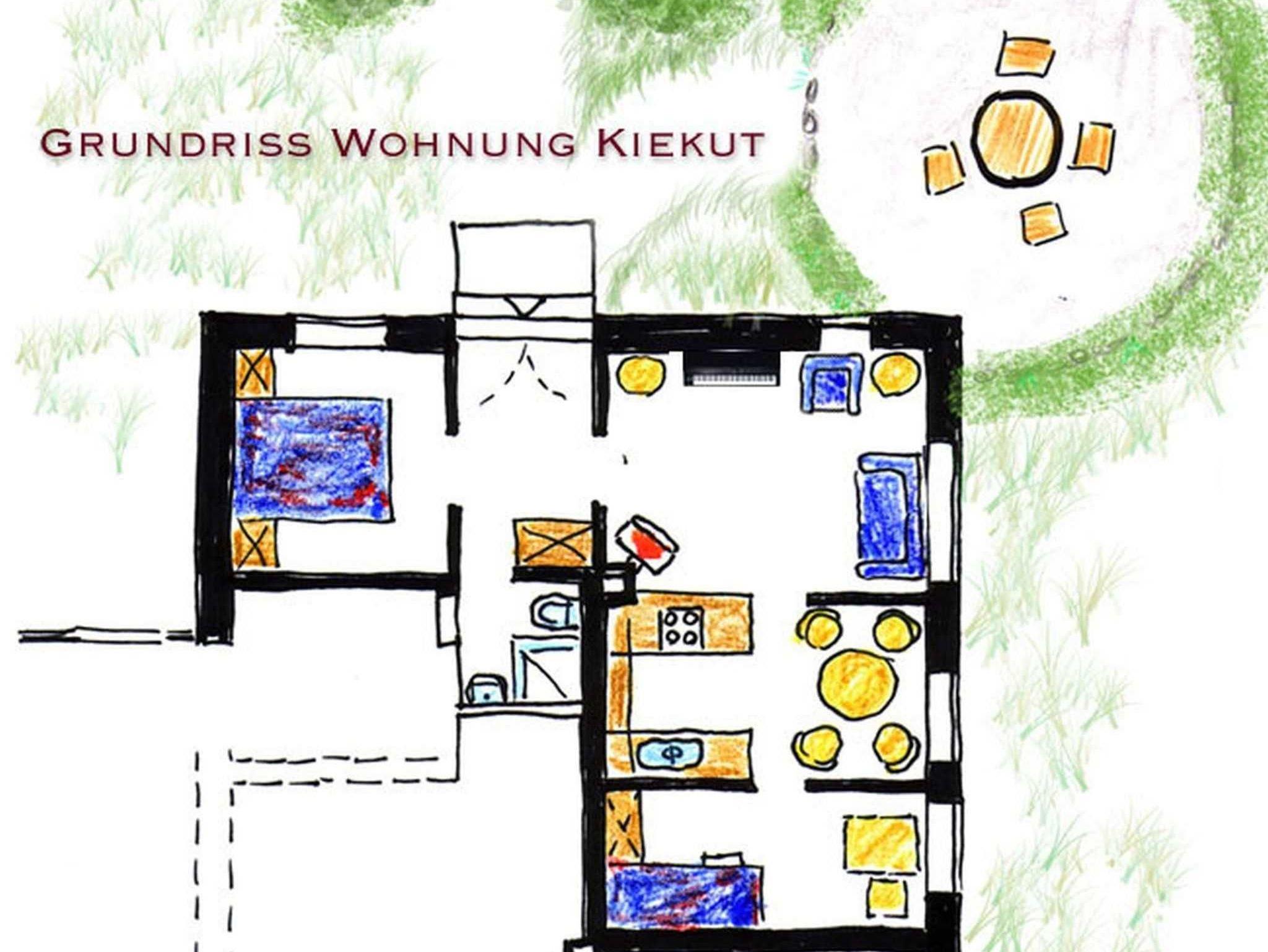 Die Ferienwohnung Kiekut ist stilvoll romantisch mit modernen Elementen eingerichtet. Sie liegt im Erdgeschoss des alten Zollhauses und bietet bis zu 2 Erwachsenen und 2 Kindern bis 14 Jahren viel Wohlfühlkomfort mit einer Fußbodenheizung unter dem Terracottaboden. Ideal für 2 Leute und Hund. Die lichtdurchfluteten Räume laden ein zu gemütlichen und entspannten Stunden vor dem Kamin, abgelagertes Holz liegt einsatzbereit gleich daneben. Das Klavier (Feurich 1929) ist komplett restauriert, wird regelmäßig gestimmt und ist spielbereit. (9 Uhr - 21 Uhr)