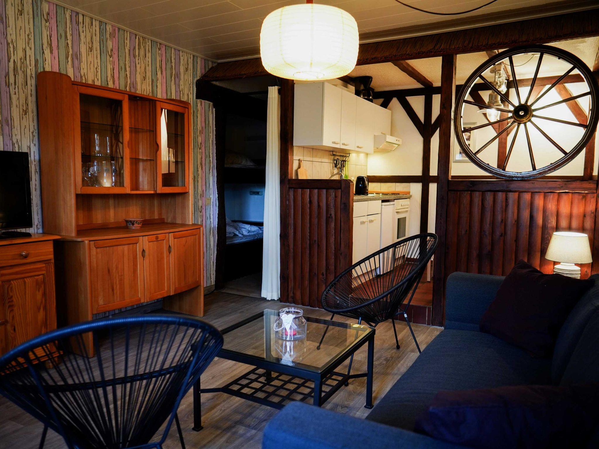 Die 42 qm große Ferienwohnung Reiterstube liegt im Erdgeschoss. Das verarbeitete Holz und das Wagenrad sorgen für eine gemütlich urige Atmosphäre. Die Wohnung verfügt über einen Wohnraum mit Küche und Essecke, ein Elternschlafzimmer mit Doppelbett, einen Etagenalkoven Betten für die Kinder sowie ein Bad mit Dusche und WC. Die eigene Terrasse mit Blick auf den Reitplatz lädt zum Verweilen ein.