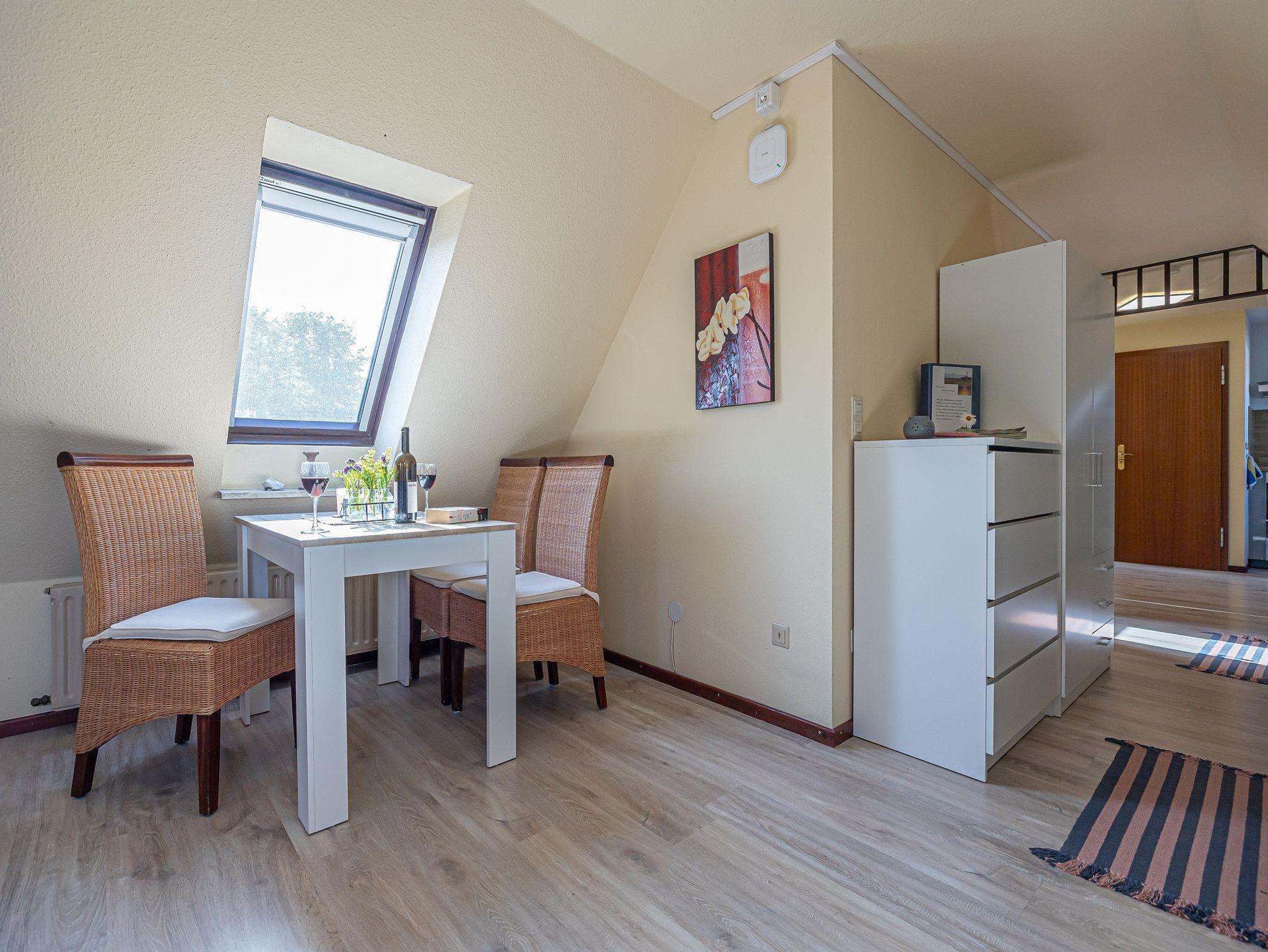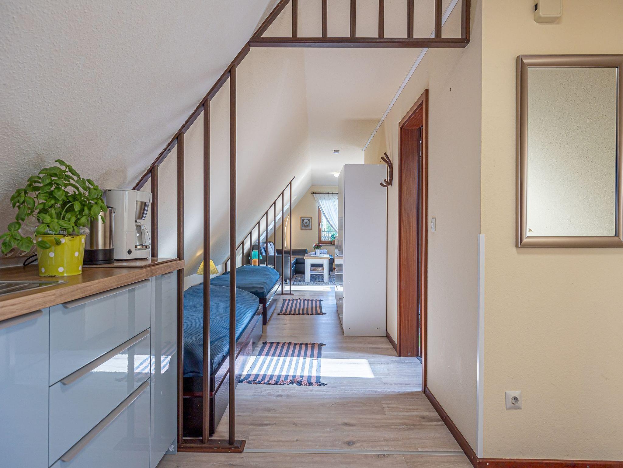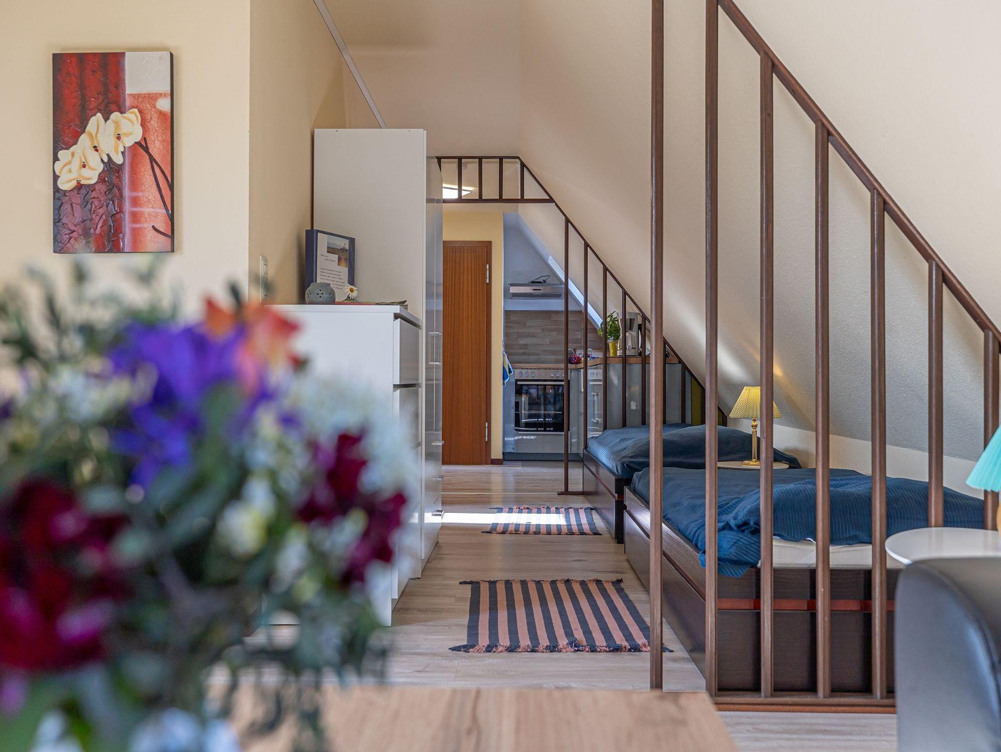 Die kleine helle Wohnung Seestern ist ganz oben im Haus und über eine breite Treppe erreichbar. Gleich beim Betreten sehen Sie rechts einen Essplatz und dahinter steht ein Schreibtisch in einer ruhigen Ecke. Links ist die offene Küche mit Herd und Backofen, Mikrowelle und den anderen üblichen Küchengeräten. Nacheinander stehen zwei Einzelbetten, gegenüber ist die Dusche und WC in einem separaten Raum. Am Ende der Wohnung wird der Raum größer und wenn Sie aus dem Fenster schauen, dann sehen Sie das Meer. Hier befindet sich eine große Couch, die sich auch ausziehen lässt und als zusätzliche Schlafmöglichkeit benutzt werden kann sowie das TV-Gerät. Mit den 5 kleinen Fenstern ist die Wohnung sehr hell und freundlich. Sie ist, außer im Bad, mit Teppich ausgelegt.