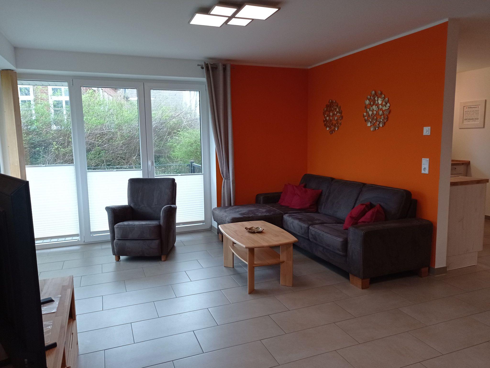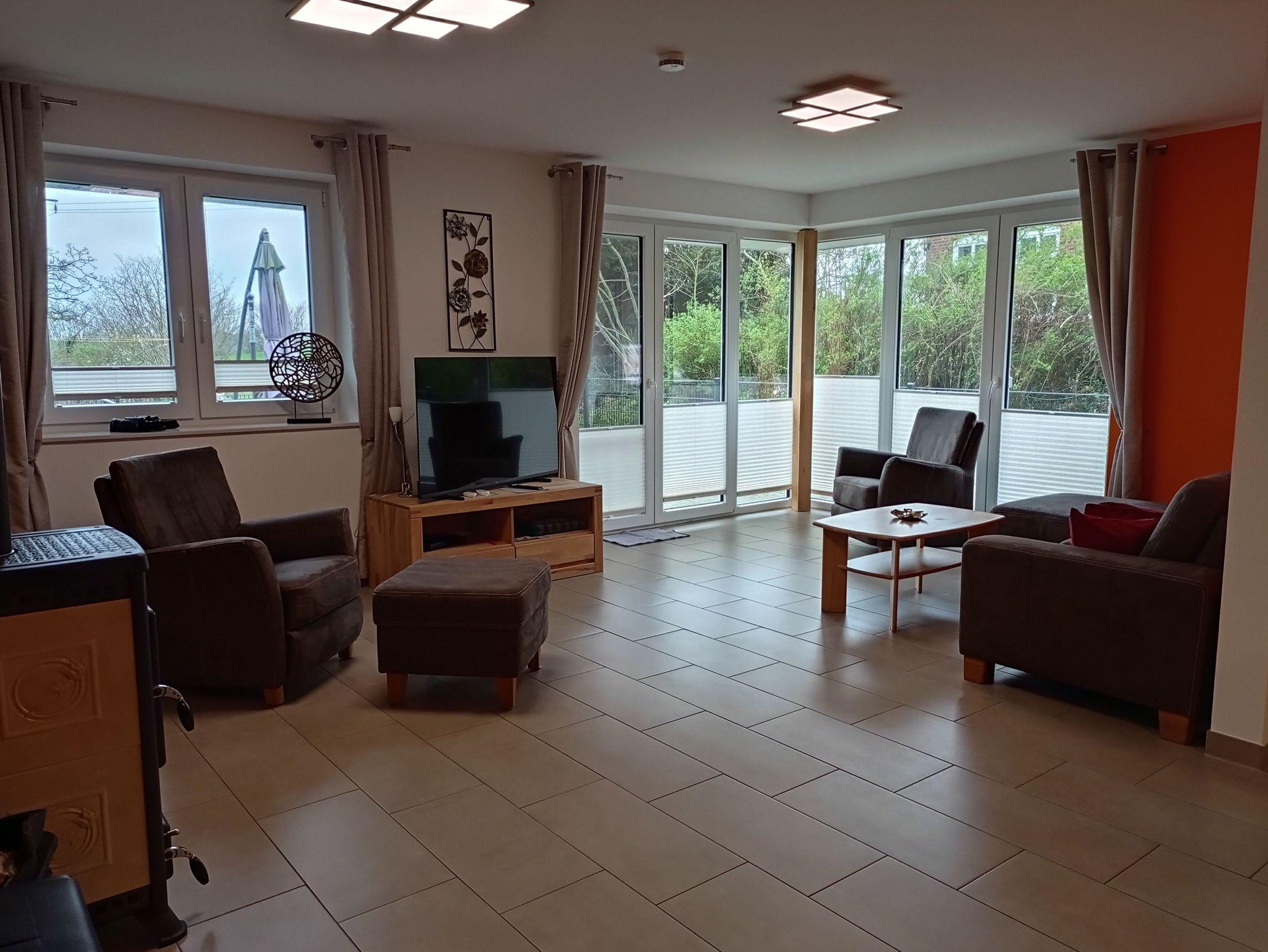 - Offener Wohnbereich mit Kaminofen Essbereich und moderne offenen Küche sowie angrenzender Terrasse in Südwestlage