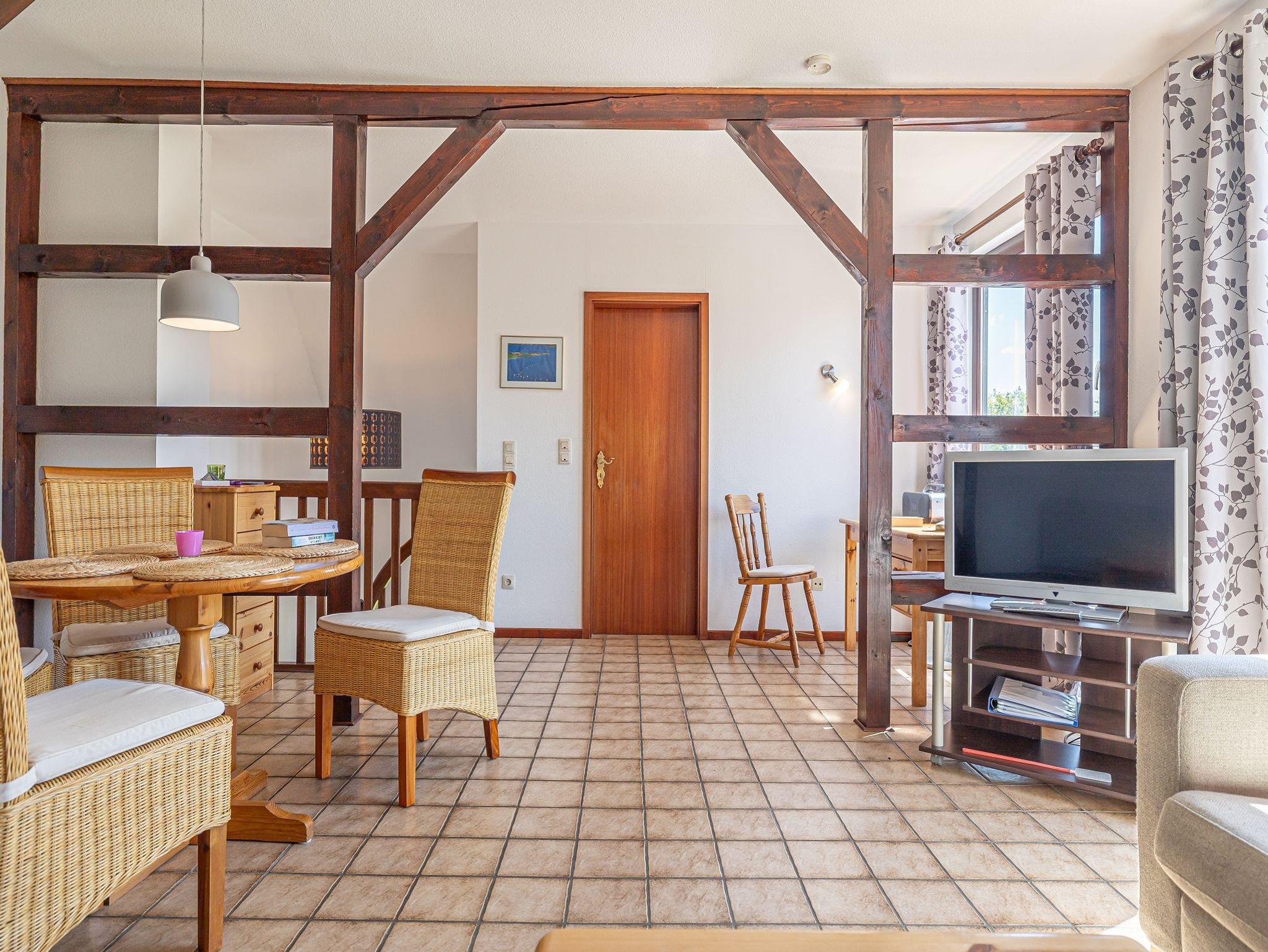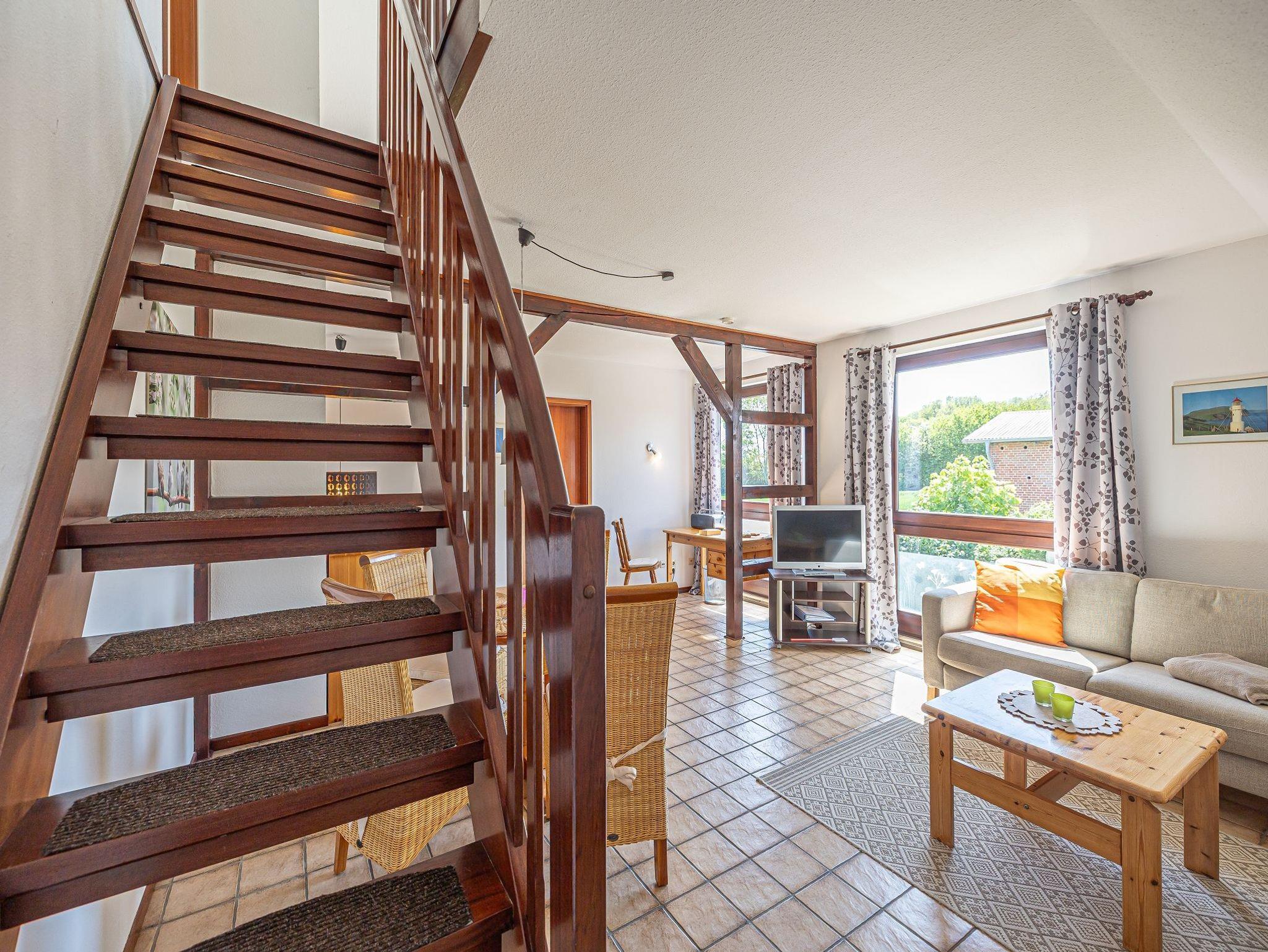 Über eine Treppe geht es in die 1. Etage. Hier ist ein gemütlicher offener Wohnraum mit Essplatz, Couchecke und Fernseher.