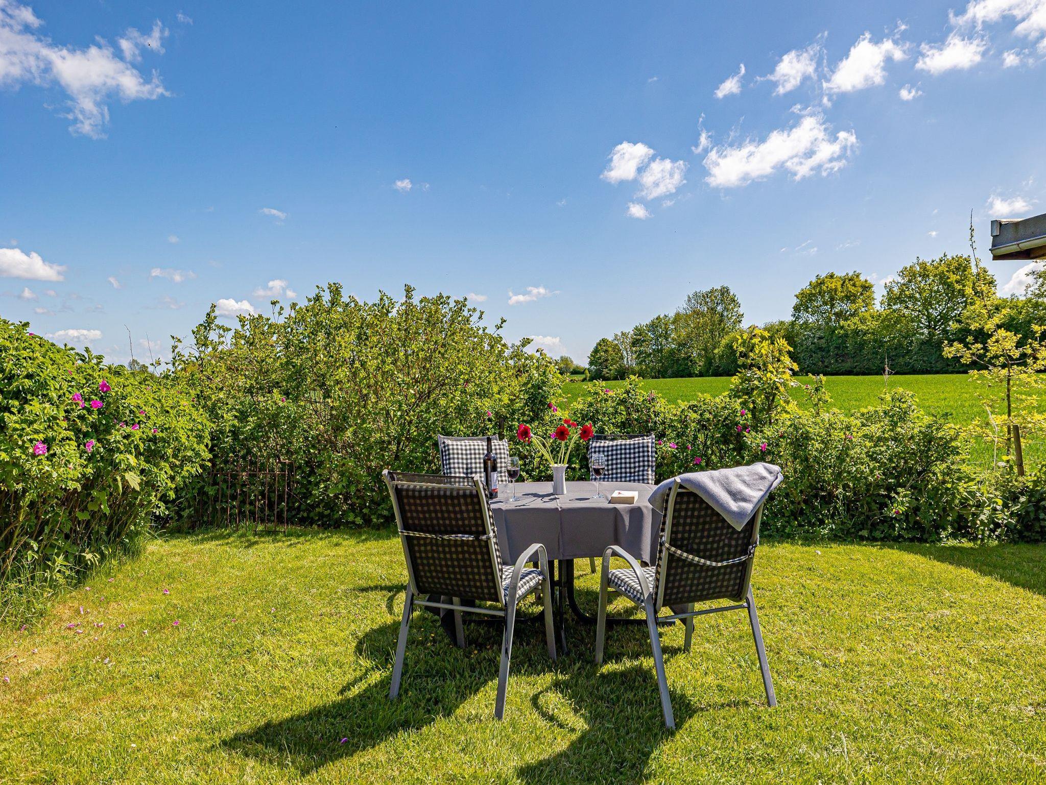 Hinter dem Haus ziehen sich Wiesen und Weiden dahin. Eingegrenzt von den typischen „Knicks“, aus denen morgens und abends Rehe und Fasane zum äsen kommen. Von Ihrer Terrasse aus gut zu beobachten.