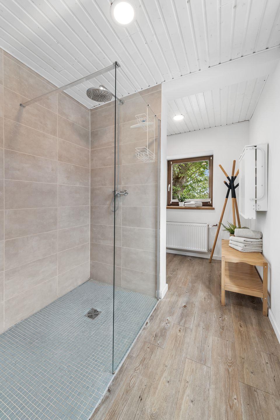 Im Badezimmer ist eine bodengleiche Dusche, ein Waschbecken, ein Spiegel und ein WC vorhanden.