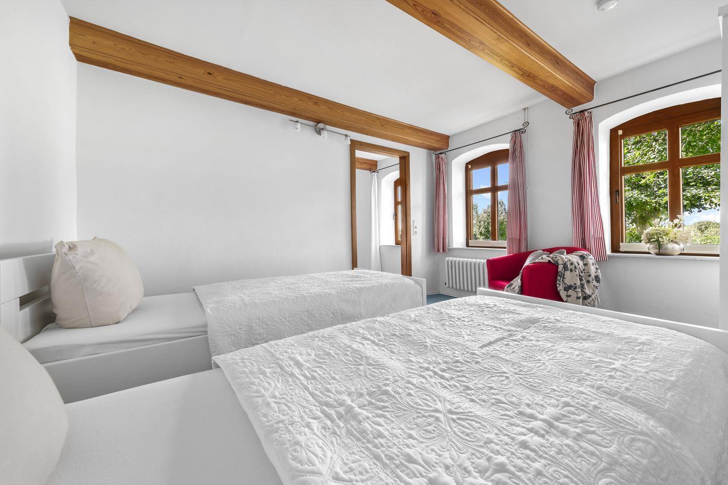Sie haben die Wahl zwischen 2 komfortablen Schlafzimmern. Einmal mit Doppelbett und einmal mit zwei Einzelbetten ausgestattet. Zusätzlich können noch zwei Personen auf dem Schlafsofa im Wohnzimmer untergebracht werden. Aus allen Schlafzimmer können Sie den Blick ins Grüne genießen.