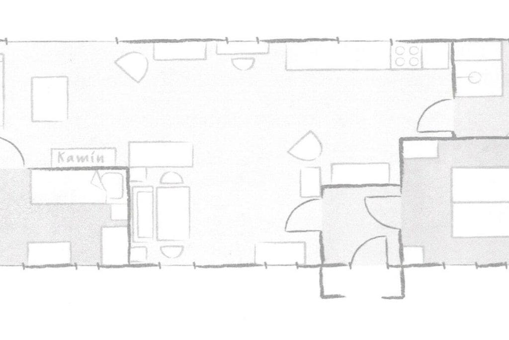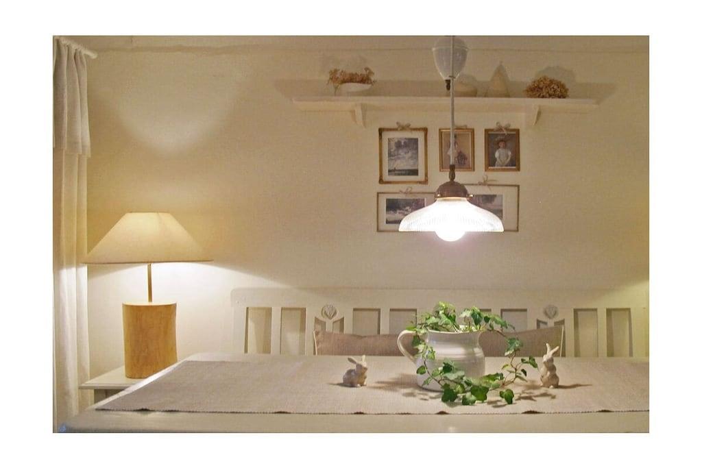 Das Hasenhaus bietet auf 75qm Platz für zu bis 4 Personen. Die individuelle Einrichtung mit vielen liebenswerten Accessoires kombiniert alte, restaurierte Möbel mit modernen Elementen und schafft dadurch eine kuschelige Wohlfühlatmosphäre. Der Wohn– und Essraum mit Kamin und offener Küche ist in Weiß und hellen Pastellfarben gehalten. Die Deckenhöhe in der alten Kate beträgt unter den Balken z.T. weniger als 1,90m. Vom Sofa aus geht der Blick auf die blaue Ostsee, nach Anbruch der Dämmerung wendet man sich dem Kaminfeuer zu und lässt, bei einem Glas Wein, die Eindrücke des Tages auf sich wirken. Die wohnliche Einrichtung jedes der beiden kleinen Schlafzimmer - mit Leinenstoffen, Voilegardinen, Patchworkdecken und schönen Details - ist farblich aufeinander abgestimmt und garantiert erholsamen Schlaf.