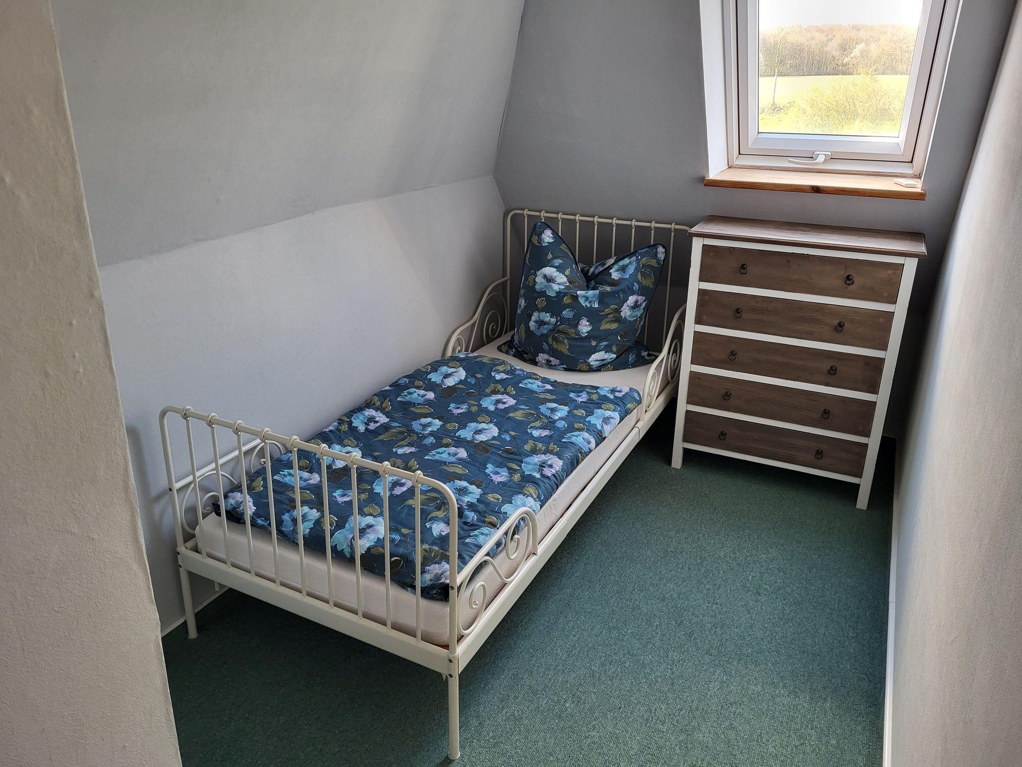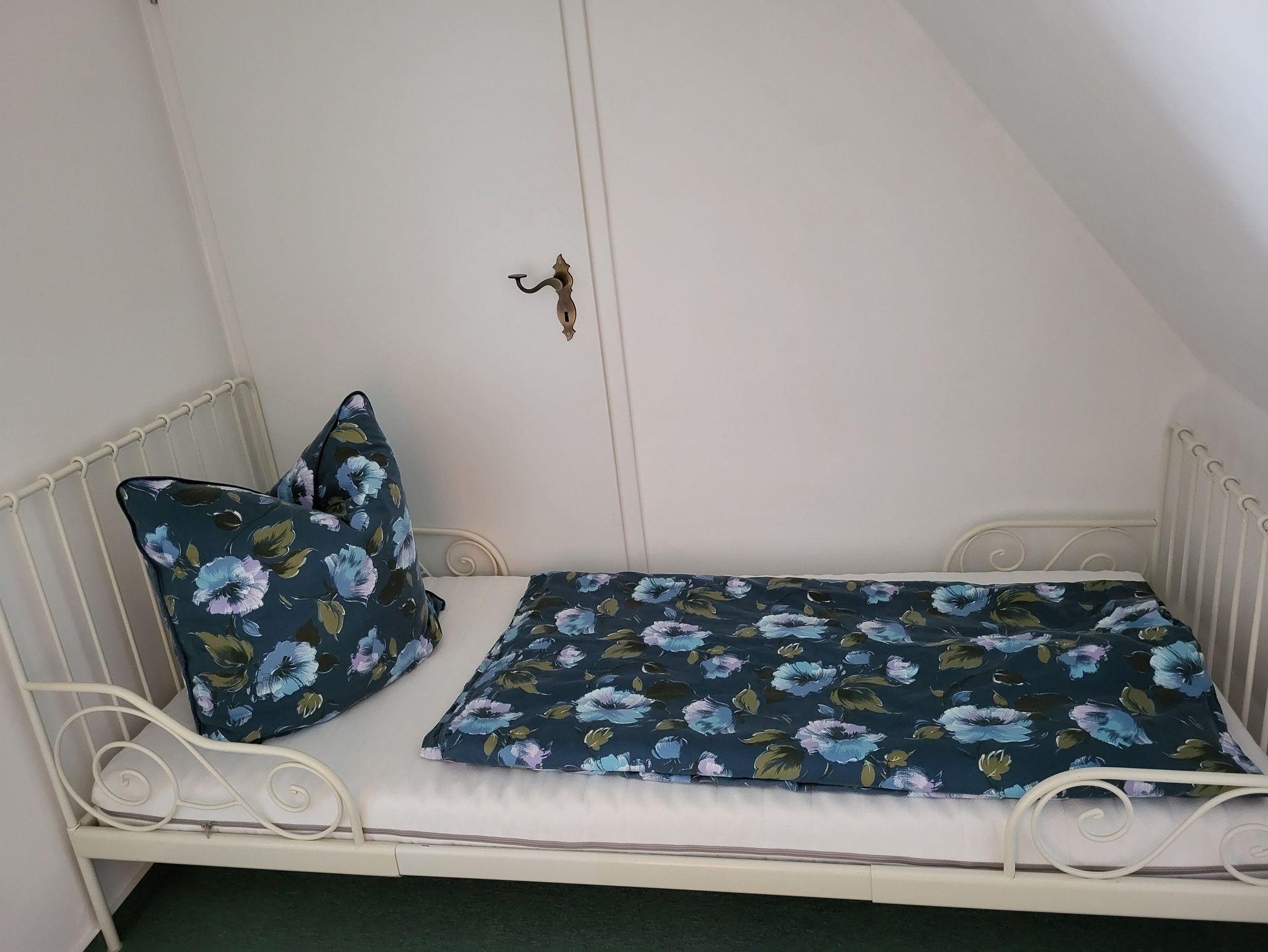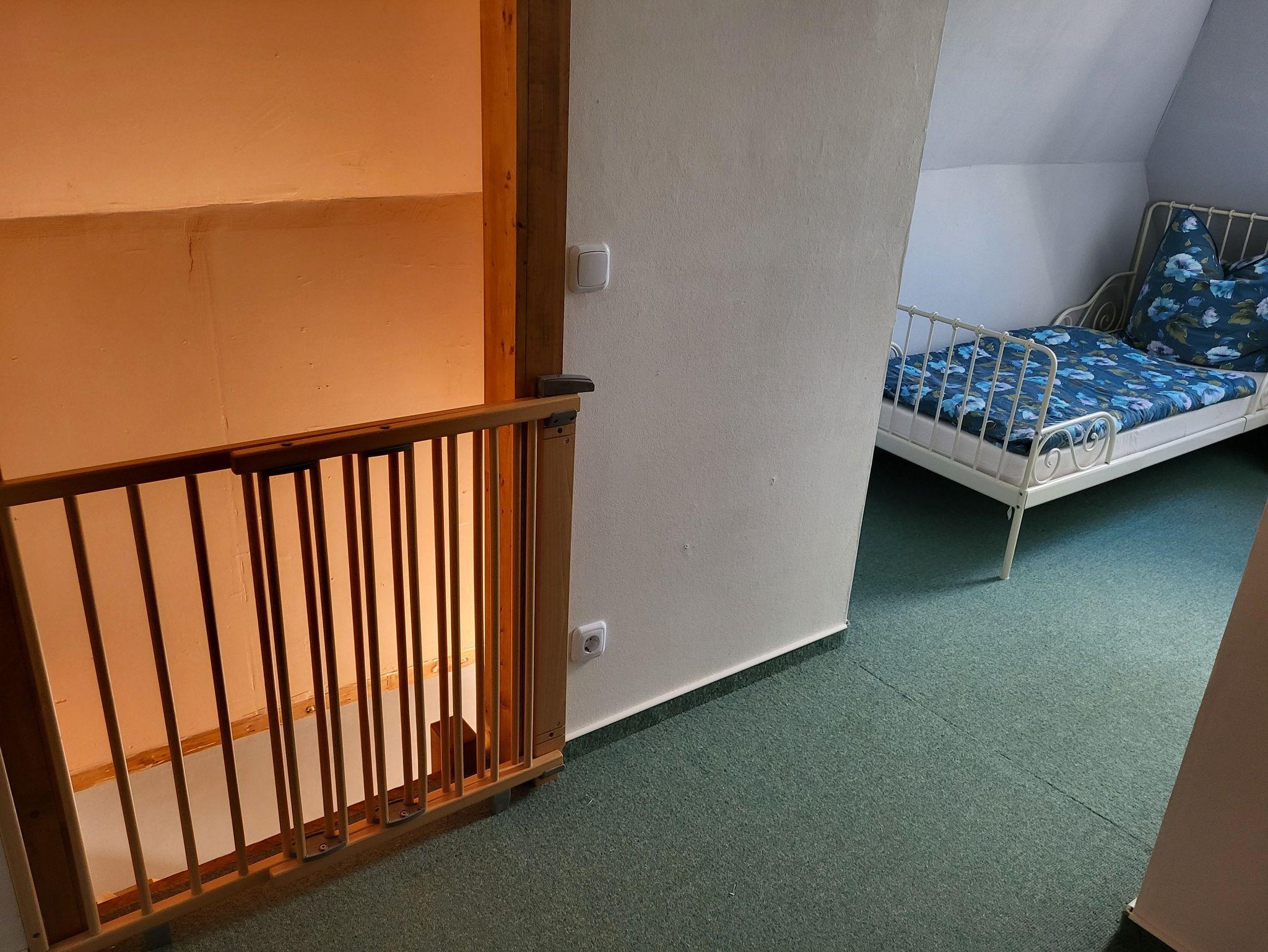 • 1 offenes Schlafzimmer mit 2 Einzelbetten (90x200), für Kleinkinder nicht geeignet da keine Tür vorhanden ist und nur eine Kindersicherung vor der steilen Treppe schützt; Bettwäsche zubuchbar