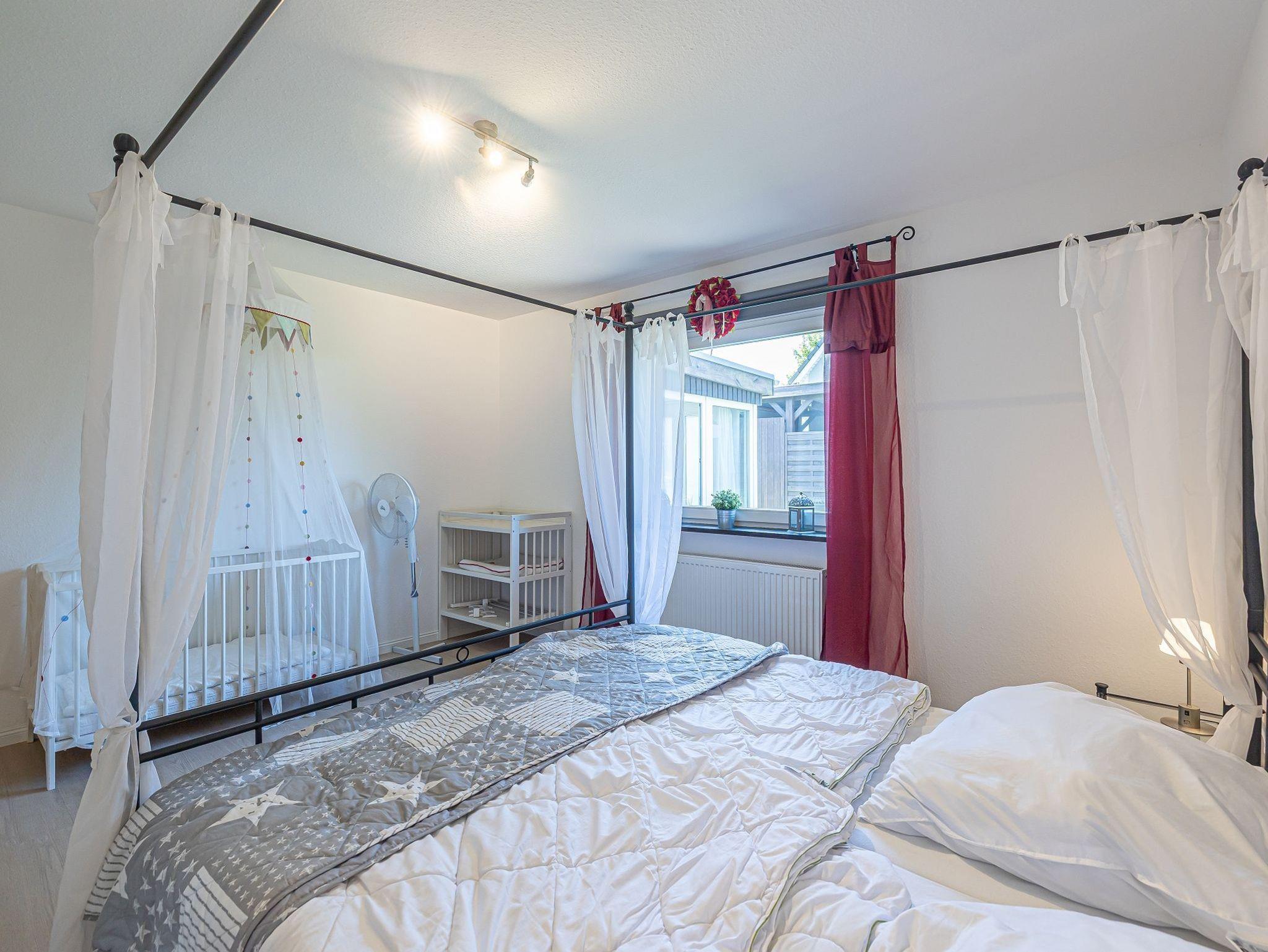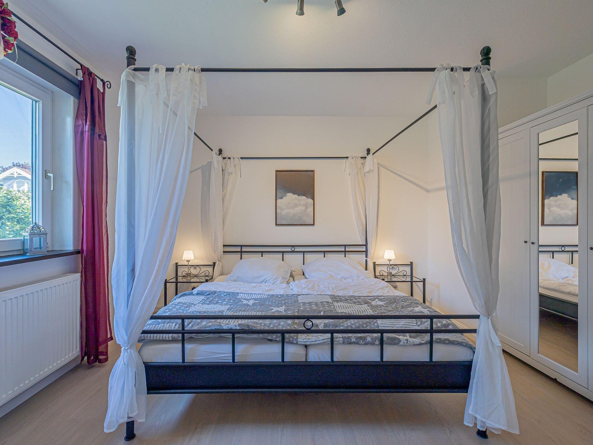 • Schlafzimmer mit Himmelbett (180 x 200), Babybett und Insektenschutz; Bettwäsche zu buchbar