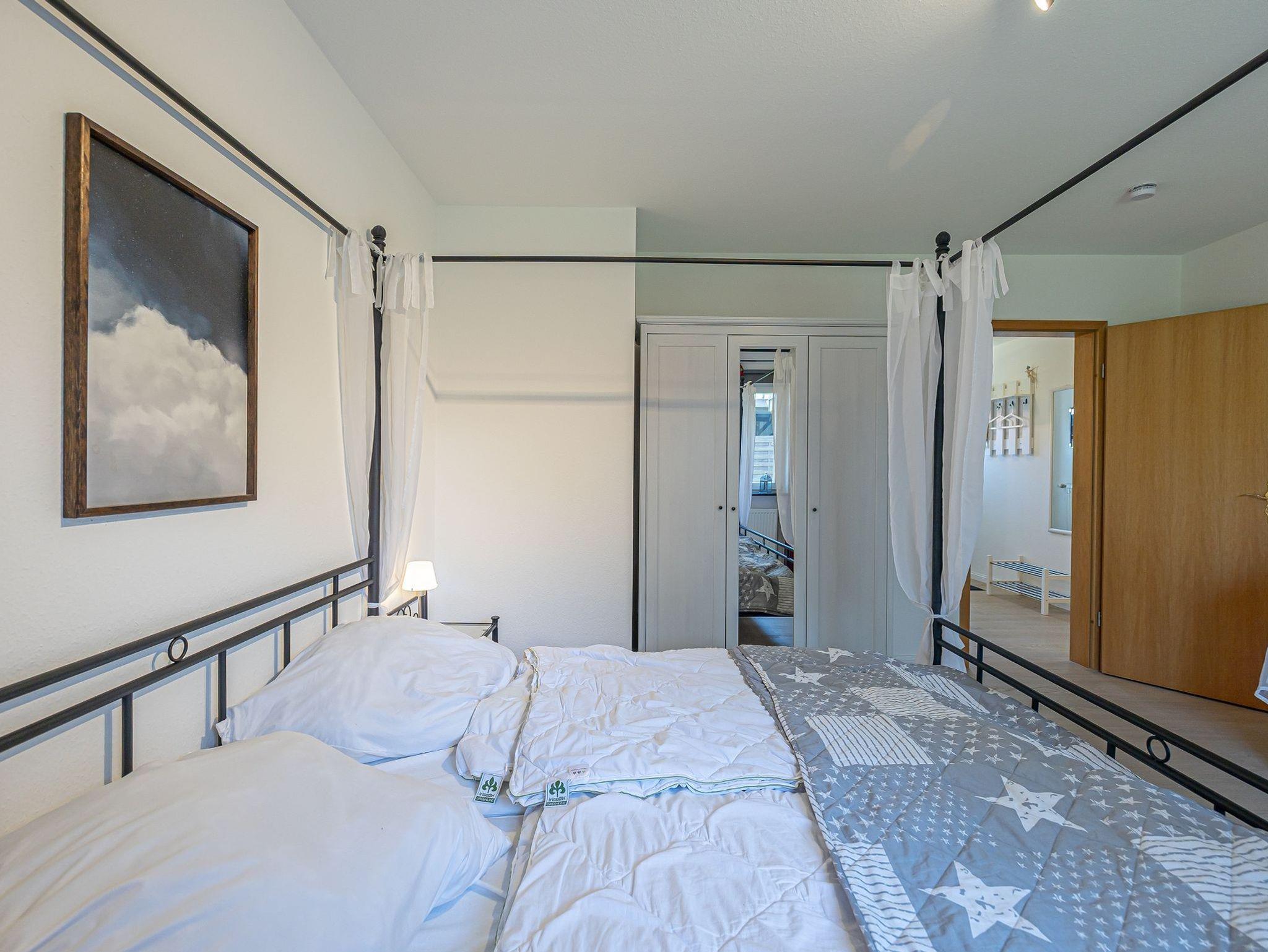 • Schlafzimmer mit Boxspringbett (140 x 200) und Insektenschutz; Bettwäsche zu buchbar