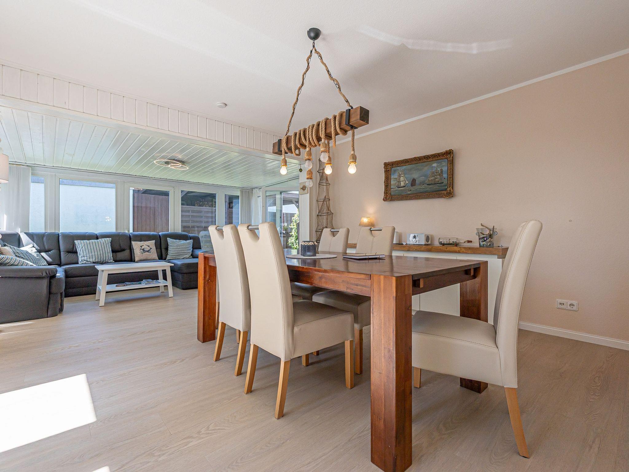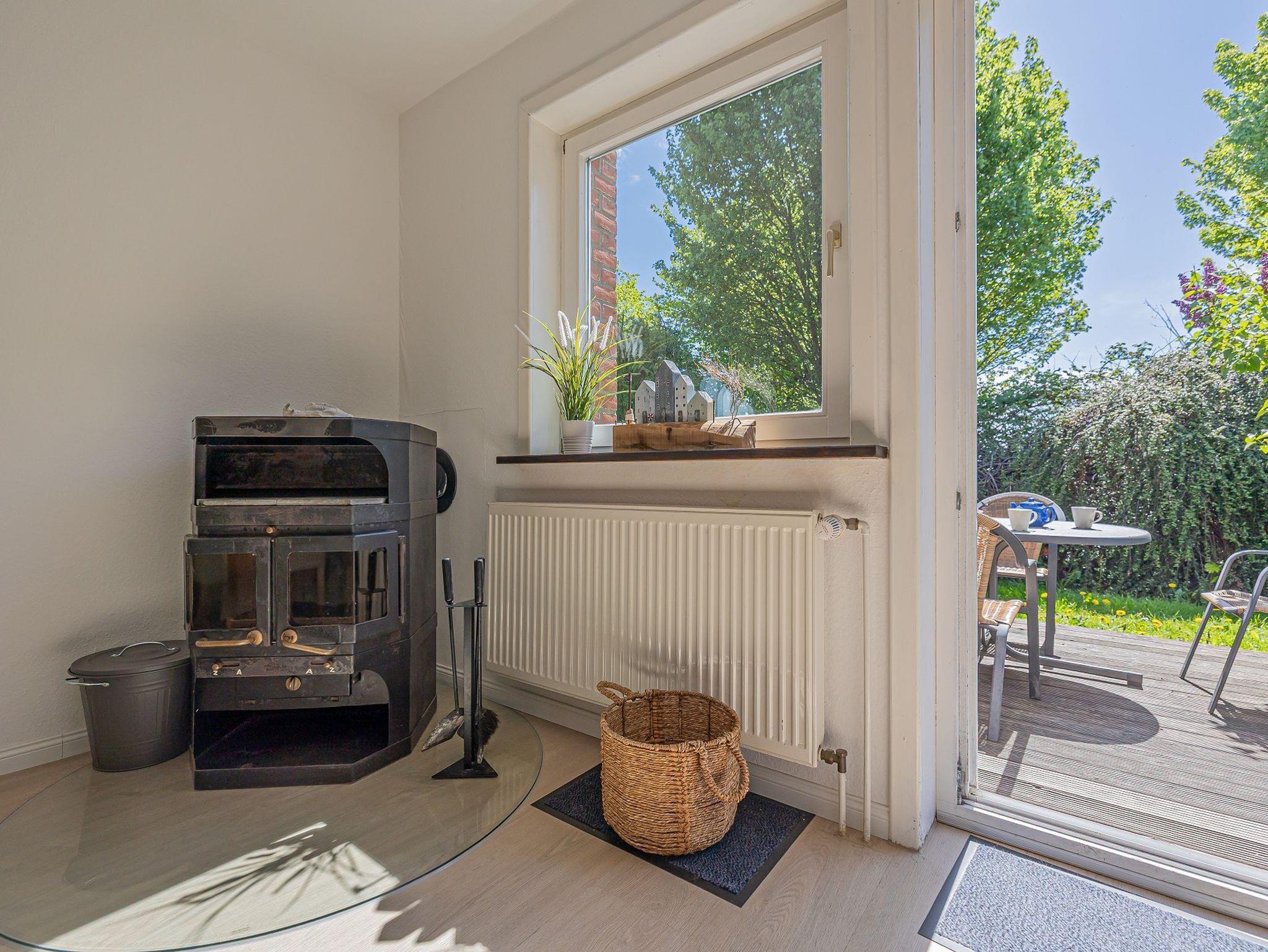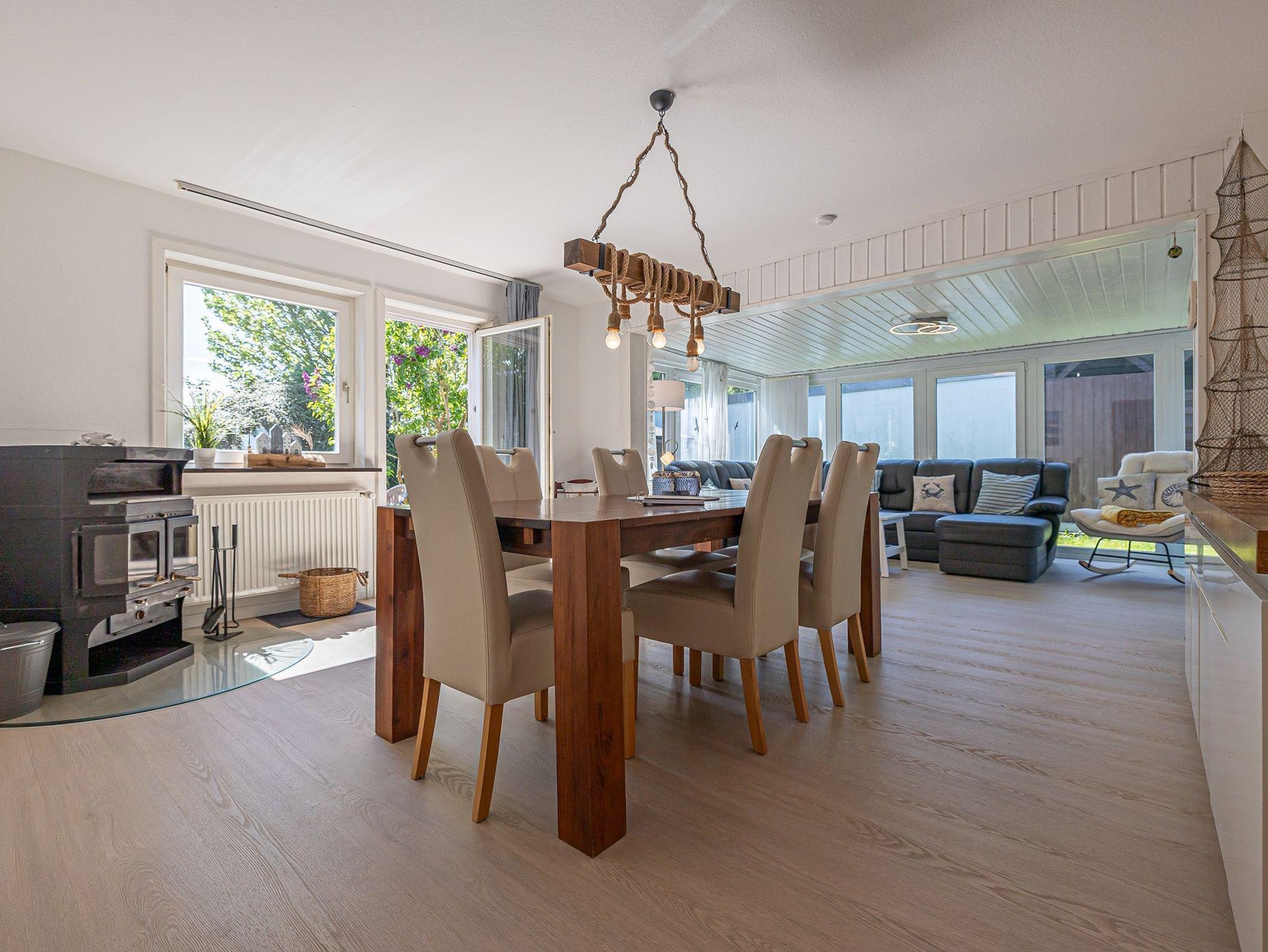 • Essbereich mit Kaminofen und Wohnbereich im offenen Wintergarten mit Schlafsofa, Fußbodenheizung und zwei anliegenden Terrassen;