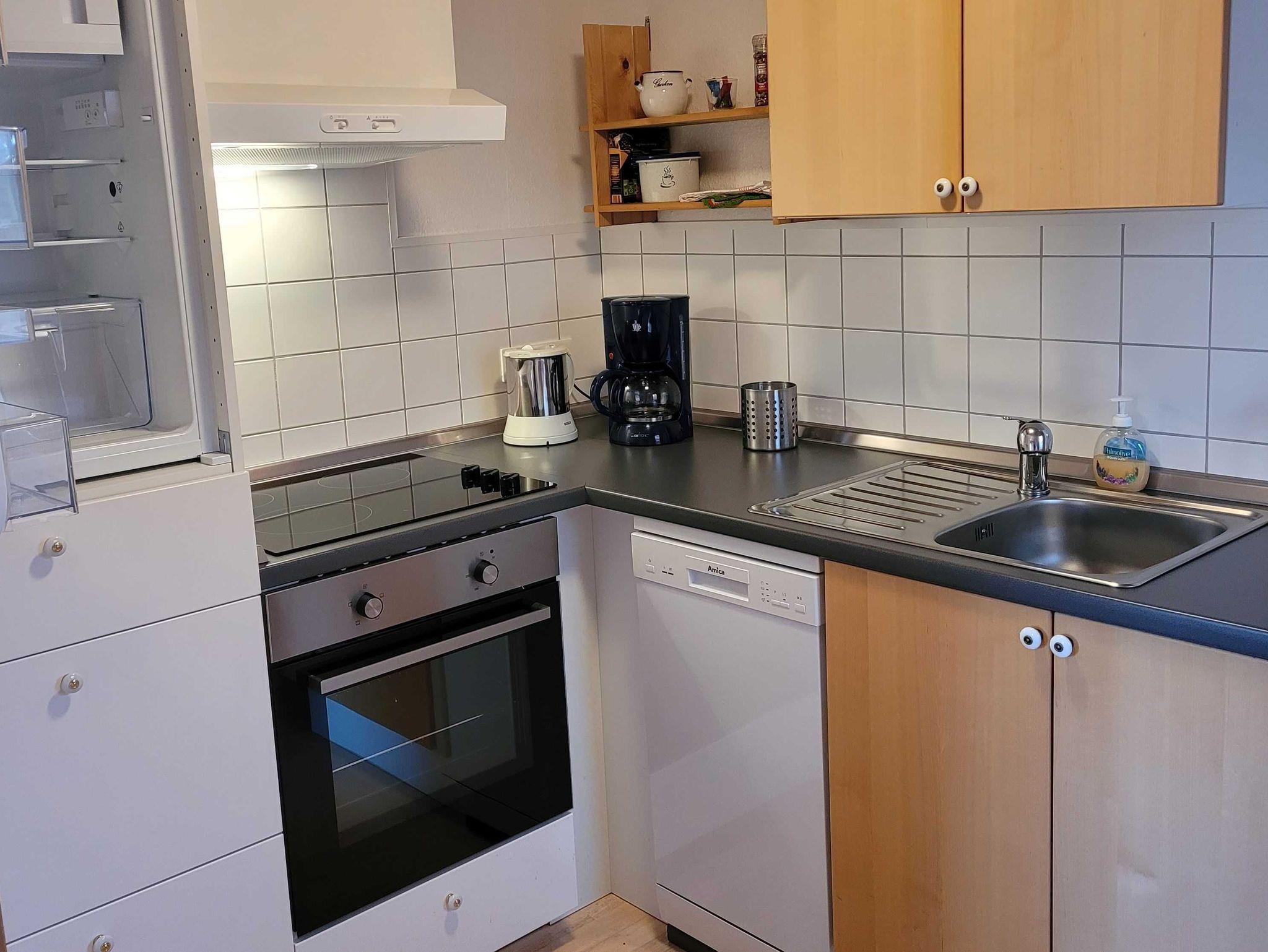 - offene Küche Ceranfeld, Backofen, Spülmaschine, Kaffeemaschine und kleiner Sitzecke