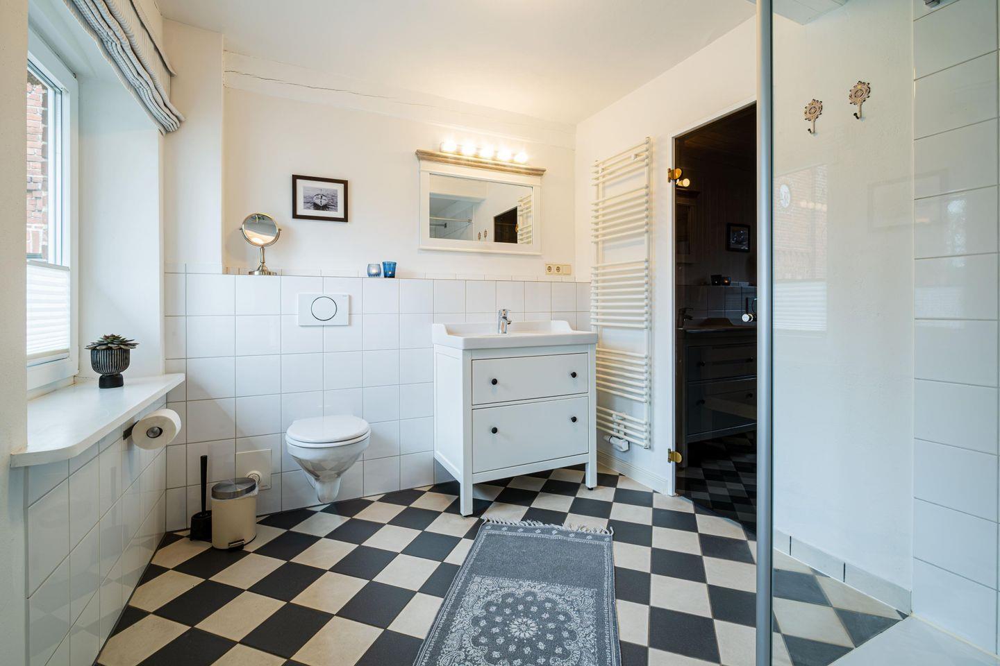 Das große Badezimmer im Erdgeschoss verfügt über Fußbodenheizung, WC, eine große bodentiefe Dusche und eine private Sauna für entspannte Momente. Ein weiteres Duschbad mit WC im Obergeschoss sorgt für zusätzlichen Komfort und Flexibilität.