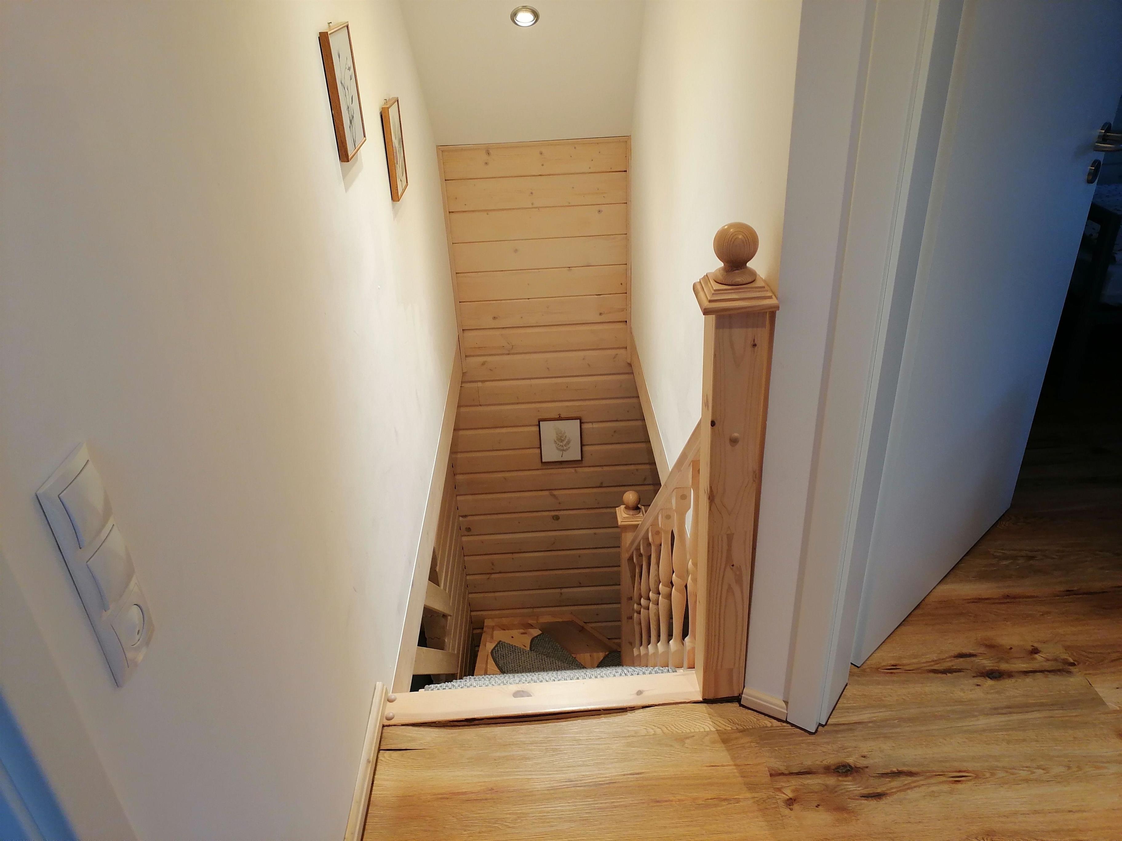 Blockbohlenhaus auf 2 Ebenen. Wohnküche mit Essbereich, 2 Schlafräume, 2 Bäder, Abstellraum, Terrasse, Balkon, Garten, Whirlpool, Carport, TV, Waschmaschine, Radio mit CD, W-Lan.