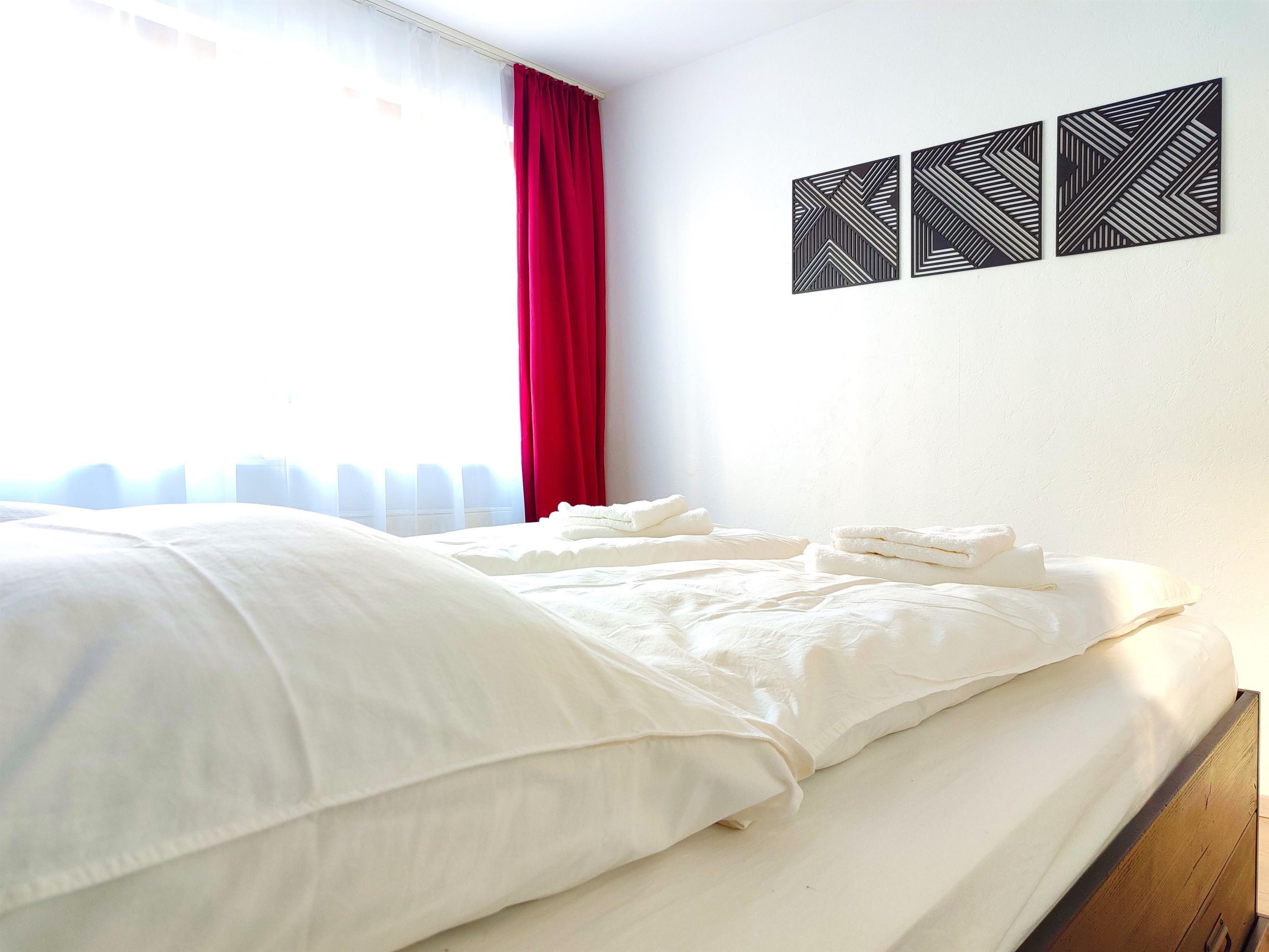 In unserem Apartment erwartet dich ein gemütliches Schlafzimmer mit einem großzügigen 1,60m Bett für erholsame Schlummerträume auf der superbequemen EMMA Matratze. Und falls du Begleitung hast, steht das praktische und platzsparende Klappbett (auf den Bildern ersichtlich), ebenfalls mit der hochwertigen, gemütlichen EMMA Matratze ausgestattet, bereit.