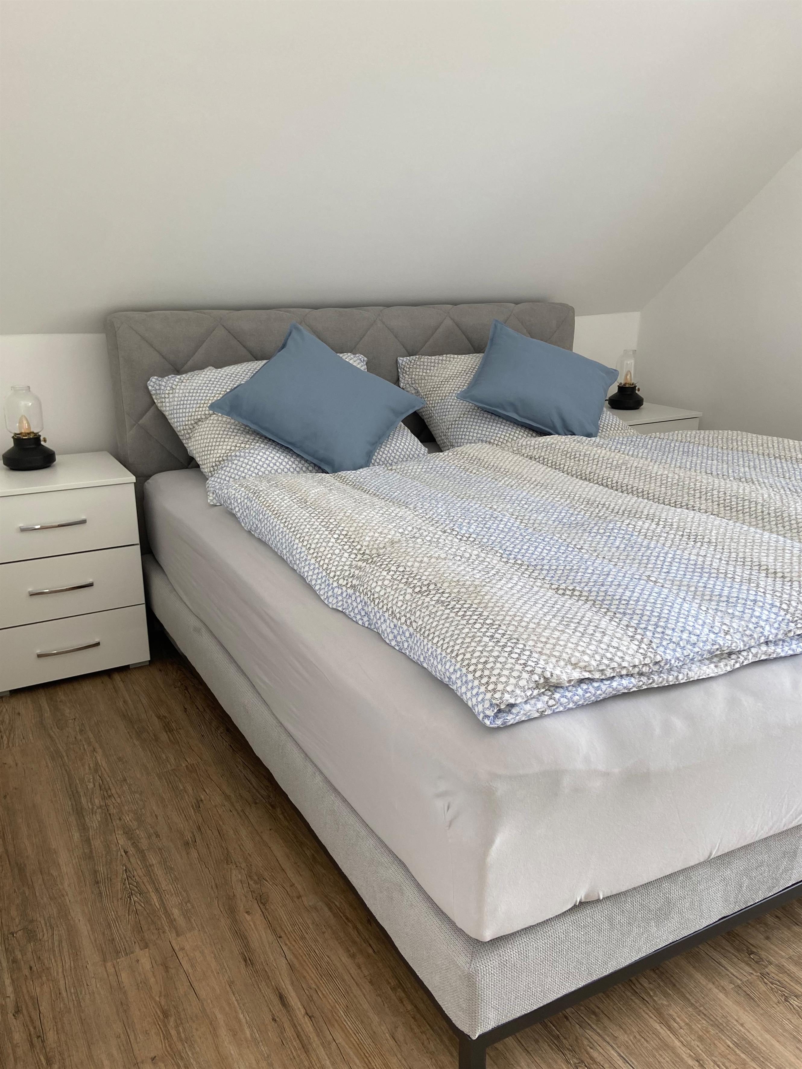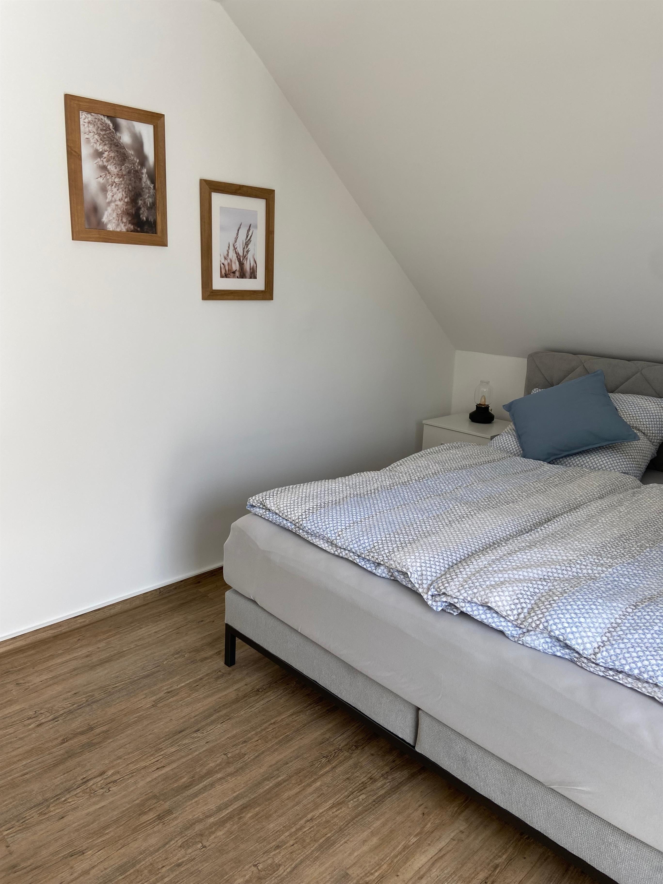 Die 48qm große Ferienwohnung im ersten OG wurde im Jahr 2022 frisch saniert und bietet Platz für bis zu 4 Urlauber. Die Wohnung verfügt über einen geräumigen, lichtdurchfluteten Wohn-/Essbereich mit einer voll ausgestatteten Küchenzeile, Flat-TV, freiem WLAN und freier Telefonie. Es steht ein Sofa zur Verfügung, welches als Bett (140x200) genutzt werden kann. Das behagliche Schlafzimmer wartet mit einem großen Boxspringbett (180x200) auf. Auf Wunsch kann ein Kinderreisebett und ein Hochstuhl bereitgestellt werden (bitte vorher mitteilen). Das moderne Badezimmer verfügt über eine geräumige Dusche und rundet das Wohlfühlpaket gekonnt ab. Saisonal bietet die Wohnung einen Blick auf das Steinhuder Meer.