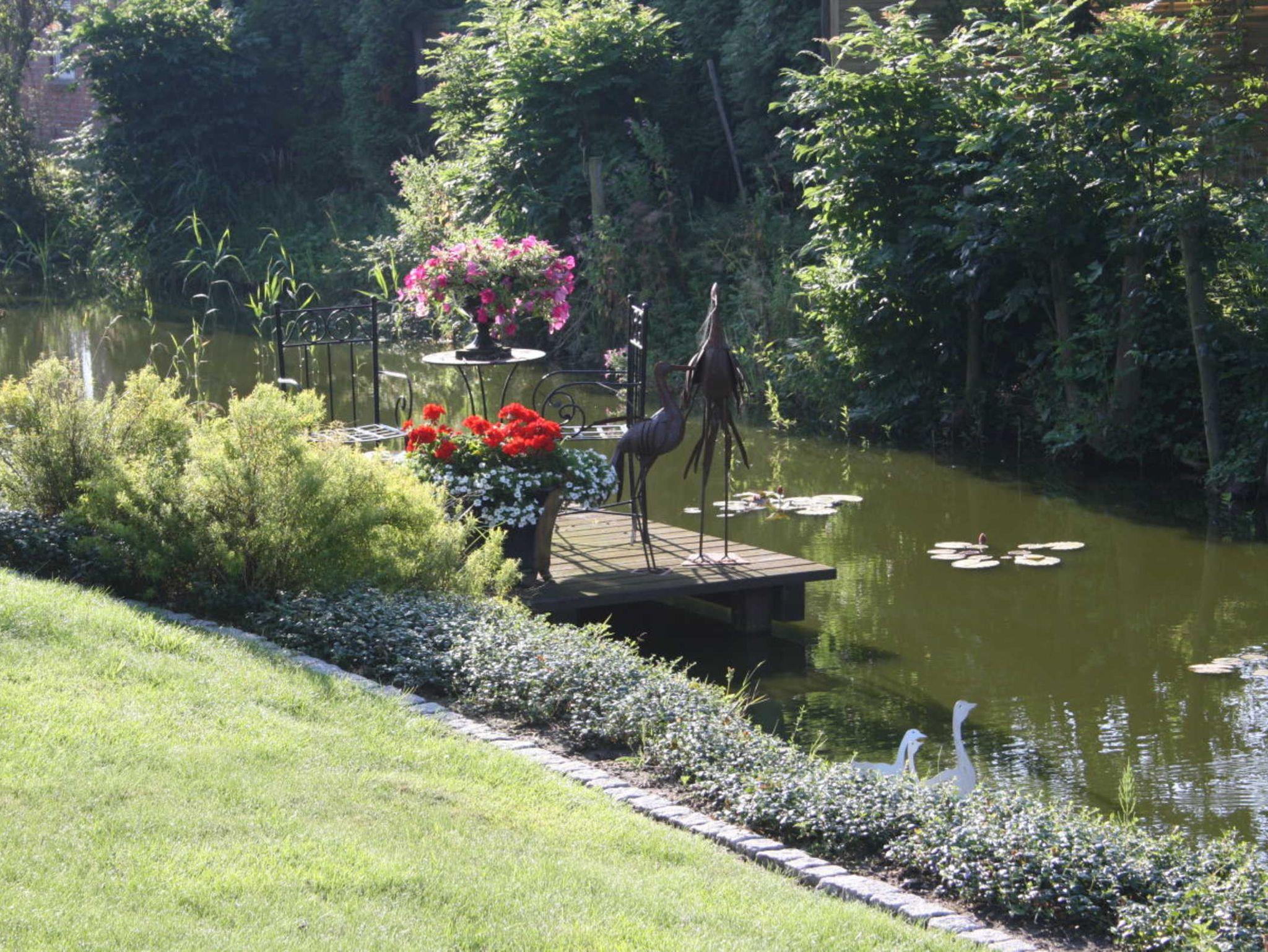 Ein schöner Garten mit Strandkorb und Relexesessel am Wasser lädt zum Ausspannen ein.