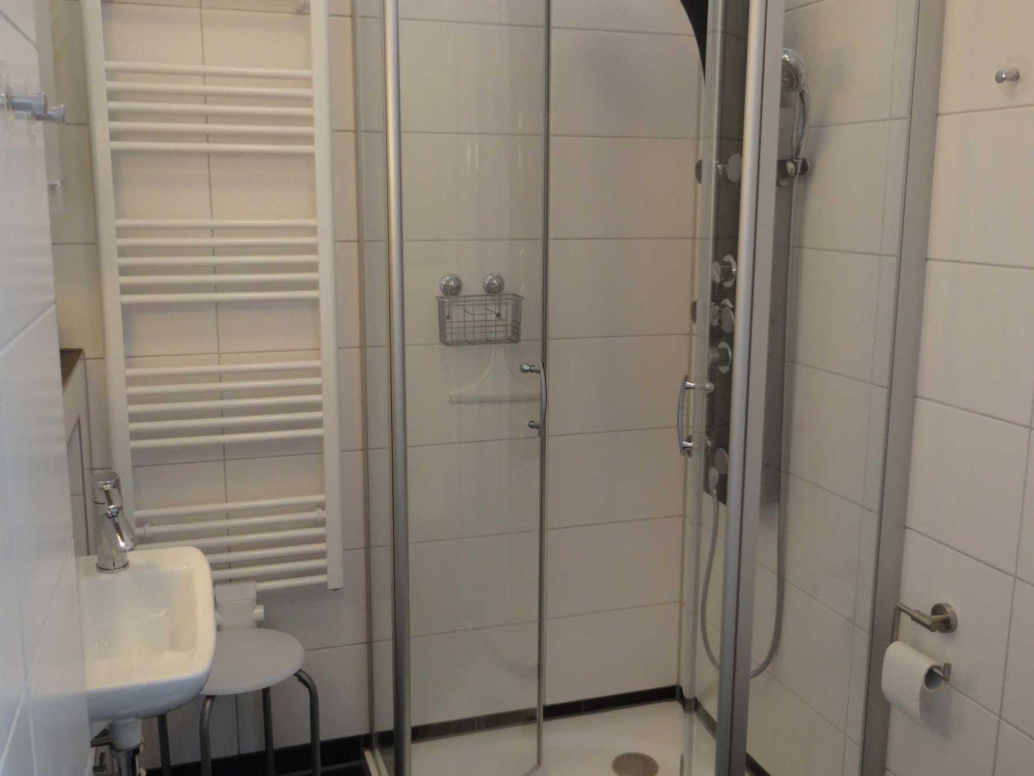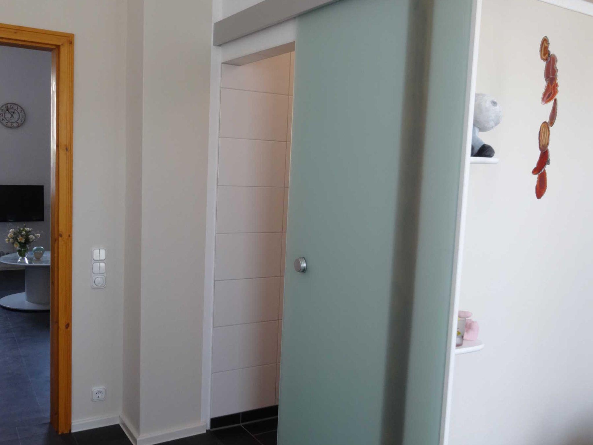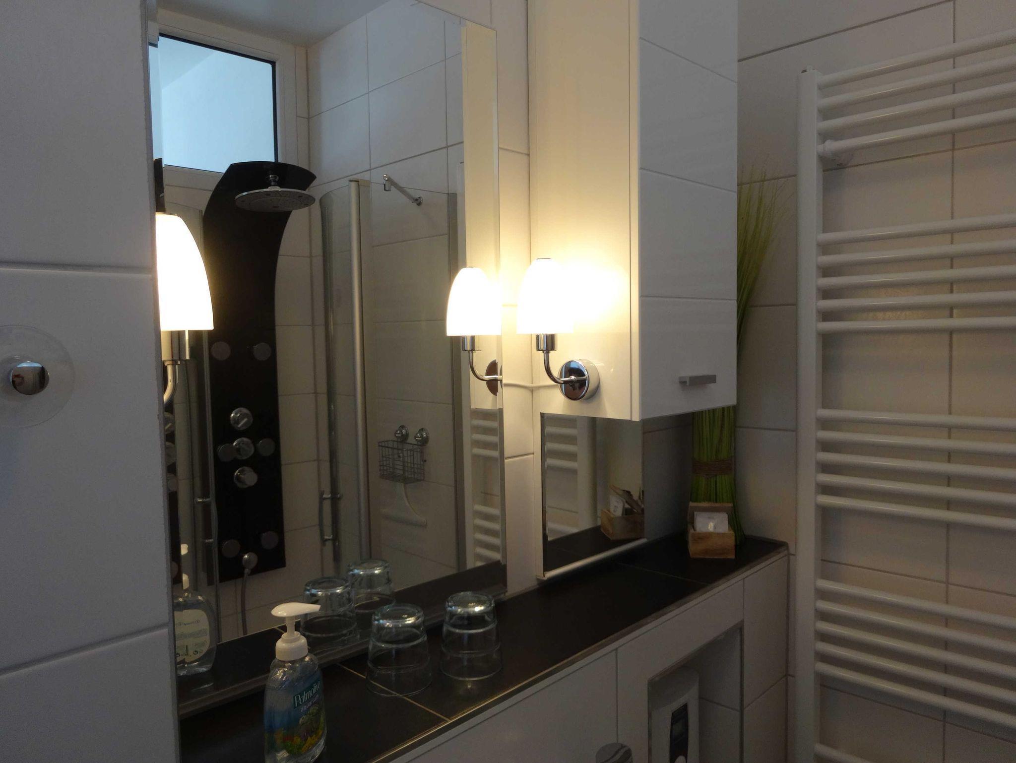 Zum Badezimmer gelangen Sie über die Tür, die zwischen der Garderobe und der Küche ist und dann halten Sie sich bitte gleich links bis Sie die Schiebetür des Badebereichs sehen. Hier hinter können Sie alles entdecken, was Ihren Aufenthalt bei uns angenehmer gestaltet. Ausgehend von einer Wellnessdusche, einem WC und Waschbecken, begrüßt Sie in einem warmen und freundlichen weiß mit grauen Akzenten. Hier finden Sie neben einer Heizung für Ihre Handtücher und auch eine Fußbodenheizung, die Ihnen die Zeit vor und nach dem Duschen wärmetechnisch so angenehm wie möglich gestaltet. Unsere Dusche ergänzt die Lücke zwischen diesen beiden Zeiträumen mit den verschiedenen Einstellungen für den gewünschten Spa-Effekt, die Sie Ihrer Entspannung bestimmt näherbringt. Sollten Sie einmal ein Artikel aus dem Sanitärbereich benötigen, können Sie gerne in den Schlafzimmerschränken nachschauen. Die notwendigsten Artikel, wie Toilettenpapier, sind hier zu finden.
