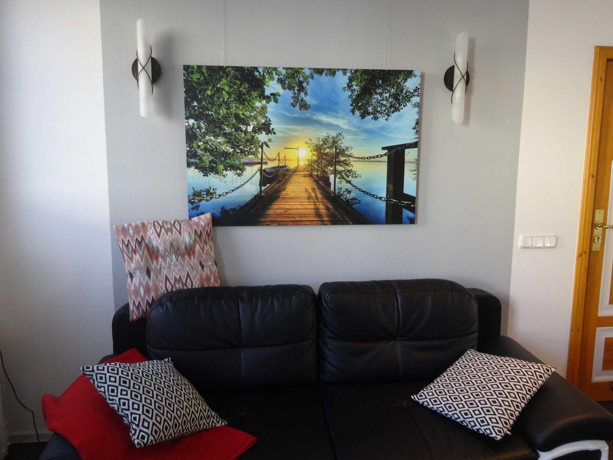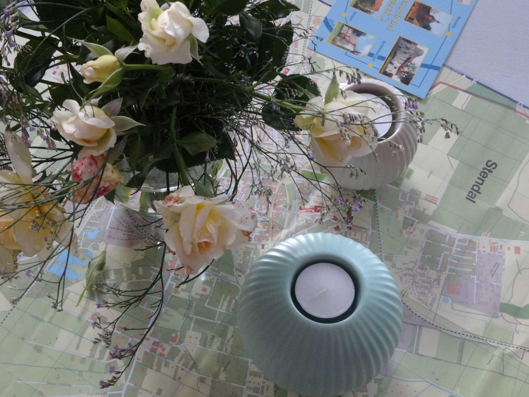 Bei einer weiteren Drehung nach rechts und somit zwischen dem Fernseher und der Wohnungstür befindet sich die sehr bequeme und ausklappbare Couch auf der weitere Gäste der Ferienwohnung oder ein Einschlafen am Abend vor dem Fernseher möglich ist. Und sollten Sie einmal von einer Blumenwiese mit Schmetterlingen träumen, unsere Couchecke bietet Ihnen dazu die entsprechenden Atmosphäre mit seinen Motiven und Bildern an. Ein runder Couchtisch, bestehend aus einer ehemaligen Kabelrolle, hält weitere Informationen zu ihrer Verfügung bereit, wie ein Stadtplan von Stendal, weitere Veranstaltungshinweise der Region und Zeitschriften.