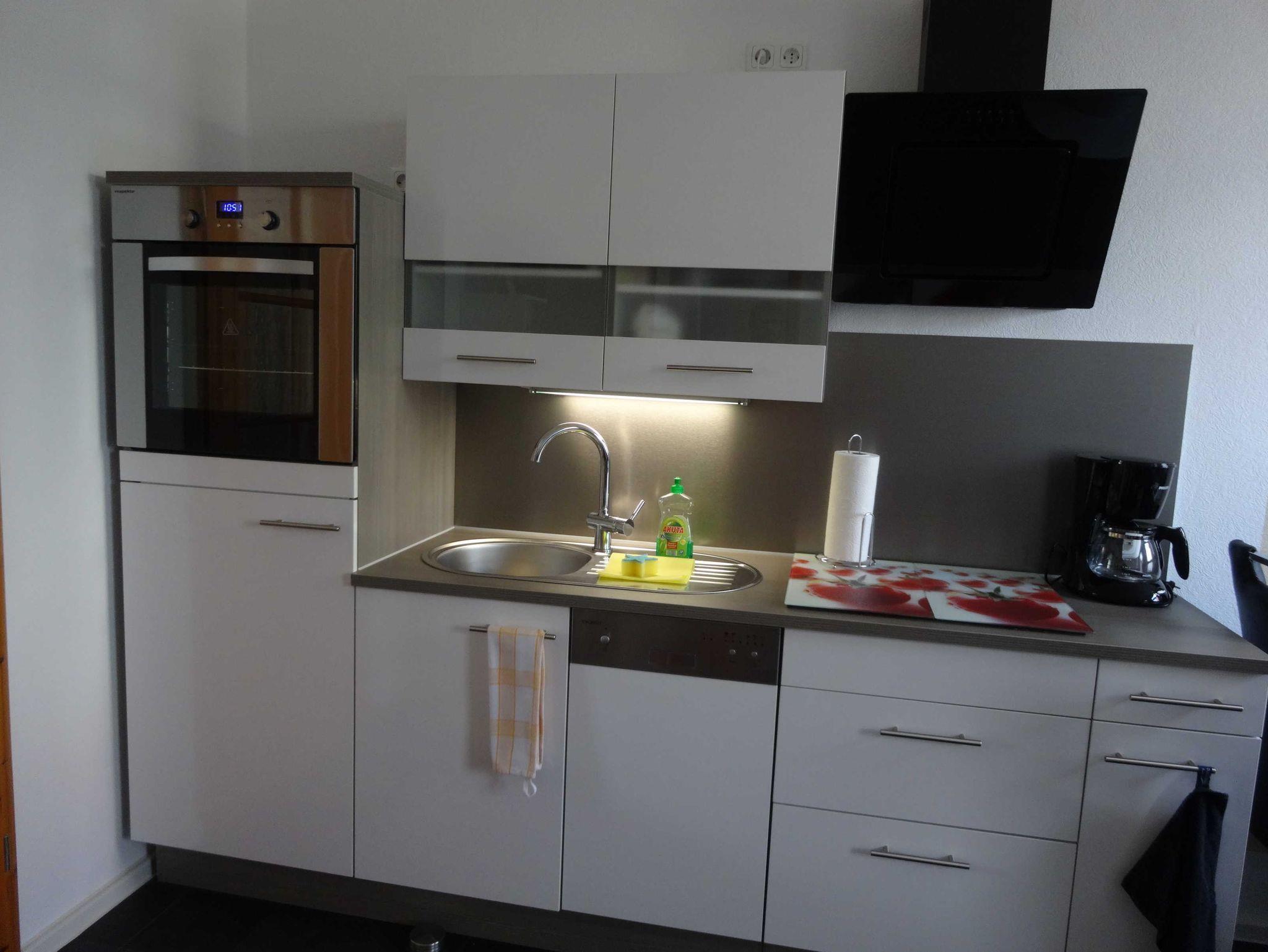Direkt gegenüber der Eingangstür erreichen Sie unsere offene und grausilberne Küche, die mit allen Annehmlichkeiten, wie mit einem Kombischrank aus Backofen auf Augenhöhe und Kühlschrank ausgestattet ist. Dem folgen die Spüle, der Geschirrspüler und der Herd. Unsere Küche verfügt über ausreichendes Geschirr für mehrere Personen und kleinen Elektrogeräten wie Kaffeemaschinen oder Wasserkocher. Sollte Ihnen hier mal etwas auf den Boden fallen, können Sie dies schnell und unkompliziert durch unseren robusten Fußboden entfernen.