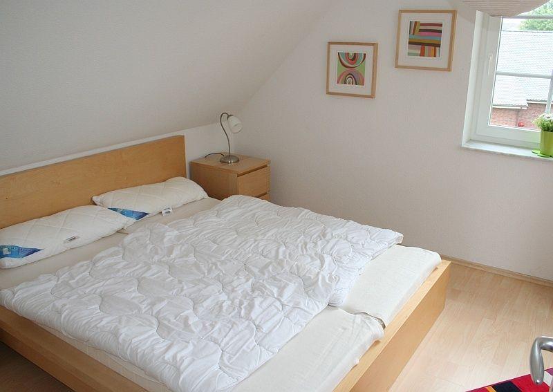 Die drei Schlafzimmer verfügen über je 2 Schlafplätze. Oben in den beiden Schlafzimmer zur Terrasse befindet sich je ein Doppelbett. Das Schlafzimmer im Erdgeschoss hat zwei einzelne Betten mit 0.90 x 2,00 m, die jedoch leicht zusammengeschoben werden können (da sie keinen Außenrahmen haben) und so eine Liegefläche ergeben. In jedem Schlafzimmer befindet sich ein geräumiger Kleiderschrank.