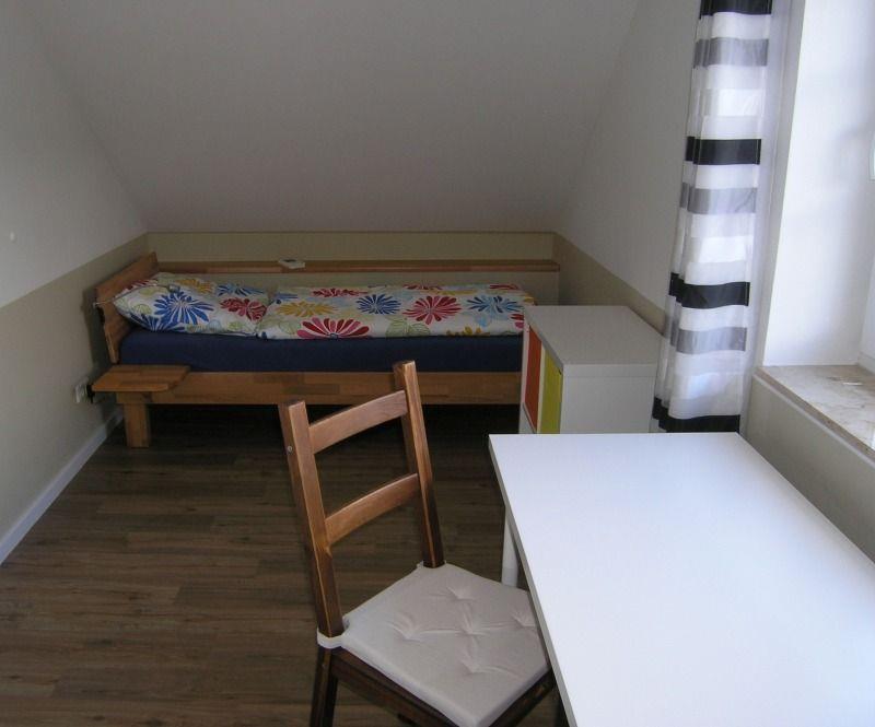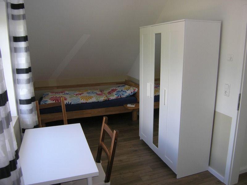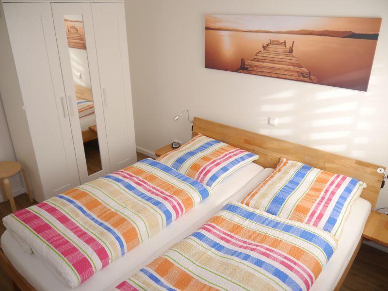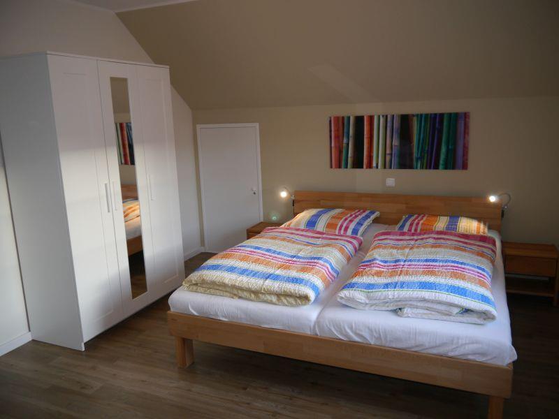 Über eine schöne Holztreppe gelangt man ins Obergeschoß. Das große Schlafzimmer dort hat ein Doppelbett (1,80 x 2,00 m) sowie einen gemütlichen Lesesessel. Hier besteht die Möglichkeit, ein Babybett (im Haus vorhanden) aufzustellen; im weiteren Schlafzimmer oben stehen 2 Einzelbetten (jeweils Breite 0,90 x 2,00 m). In jedem Schlafzimmer befindet sich ein geräumiger Kleiderschrank mit Spiegel.