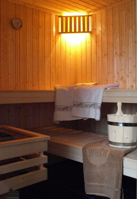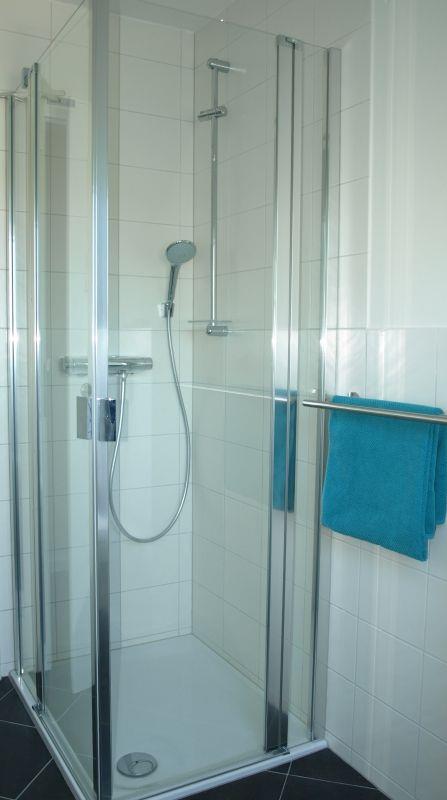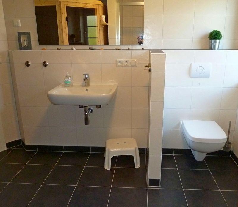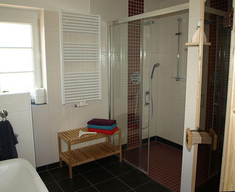 Im unteren Bad befinden sich eine großzügige Sauna und ein sehr großer, bequem begehbarer Duschbereich mit Regendusche (1,00 x 1,60 m).