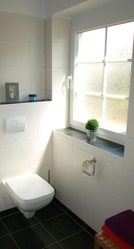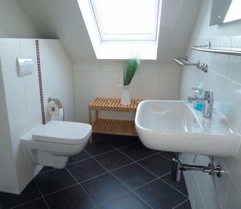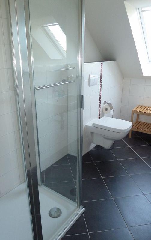 Das Bad im OG verfügt über Dusche und WC sowie genügend Ablagemöglichkeiten