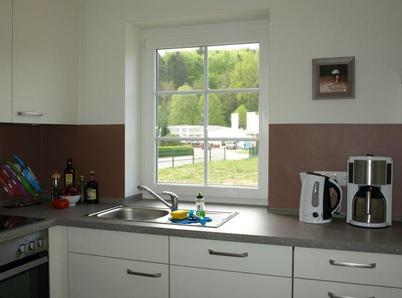 Die Küche ist voll ausgestattet und hält genügend Geschirr vor. Ein Geschirrspüler, ein E-Herd mit Ceranfeld und Backofen mit Multifunktionsbetrieb (Umluft etc.) sowie eine Mikrowelle und ein Kühlschrank mit großem separaten Tiefkühlfach machen die Küche komplett. Eine Kaffeemaschine und ein Wasserkocher sowie ein großer Toaster sind Standard.
