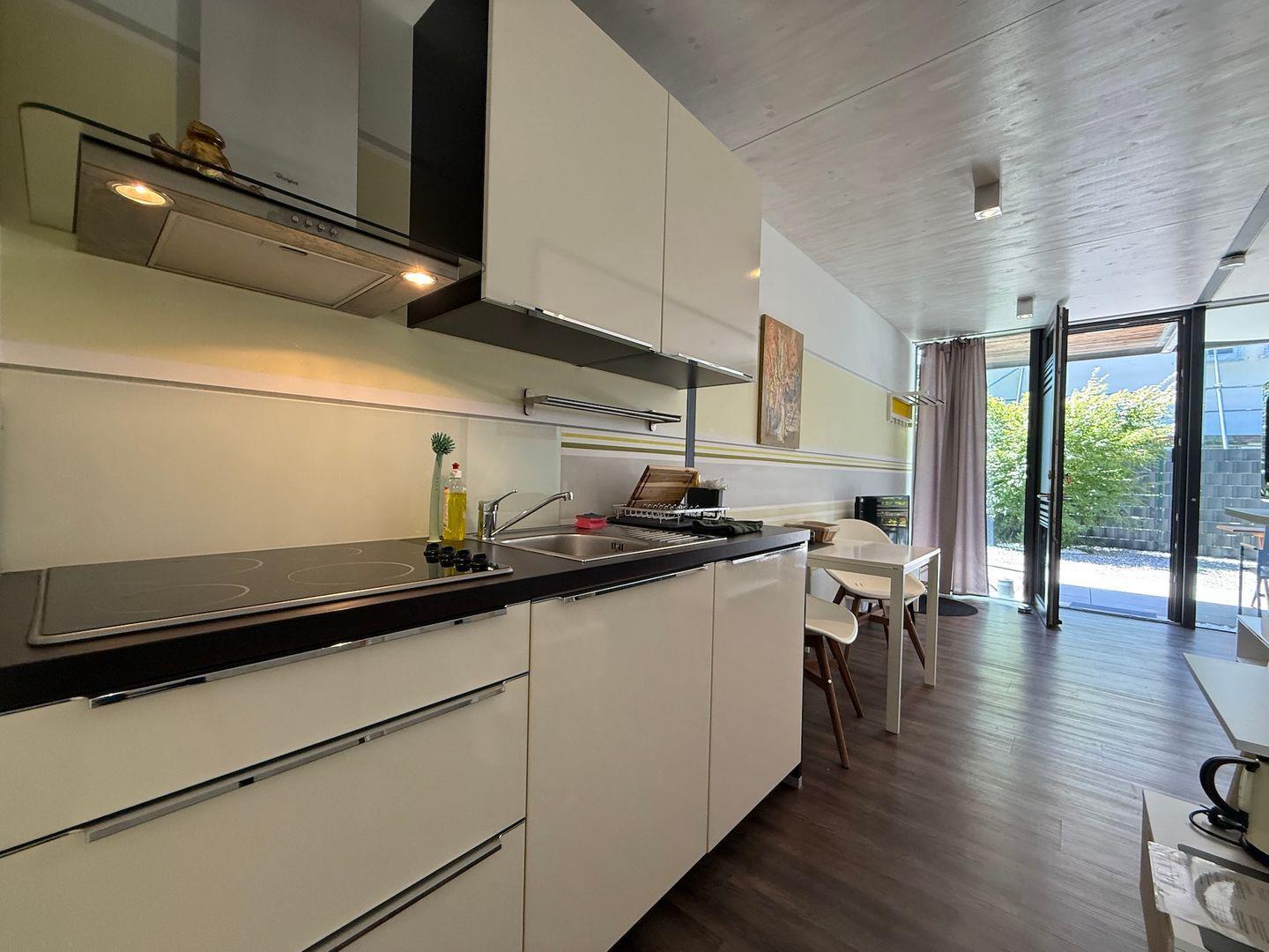 Der helle Wohnbereich überzeugt durch eine geschmackvolle Einrichtung mit komfortabler Sofaecke, Sessel sowie einem großzügigen Essbereich mit Esstisch und Stühlen. Vinylböden im Wohnzimmer und Schlafzimmer sorgen für eine angenehme und pflegeleichte Atmosphäre. Die offene Küche fügt sich harmonisch an das Wohnzimmer an und ist für Ihre Selbstversorgung bestens ausgestattet: Für die Zubereitung von Mahlzeiten stehen Ihnen ein 4-Platten-Herd, eine Mikrowelle, ein Kühlschrank, eine Senseo-Espressomaschine, Wasserkocher, Toaster sowie umfangreiche Küchenutensilien, Geschirr und Besteck zur Verfügung. Geschirrhandtücher sind ebenso vorhanden, sodass für Ihren Komfort gesorgt ist.