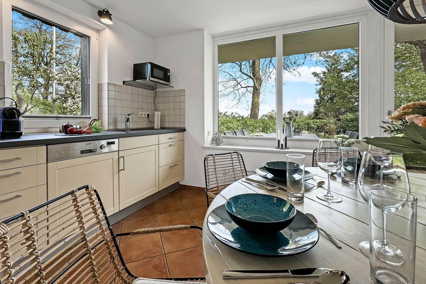 Die untere Etage des Ferienhauses Schleikoppel bildet das Herzstück des Hauses. Der großzügige Wohnzimmerbereich mit Ecksofa und Lesesesseln ist verbunden mit der offenen Küche, die einen Esstisch für 6 Personen bietet. Ein Kaminofen sorgt für Gemütlichkeit an kalten Tagen.