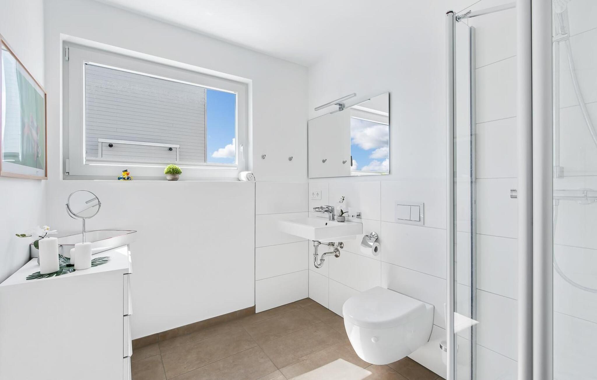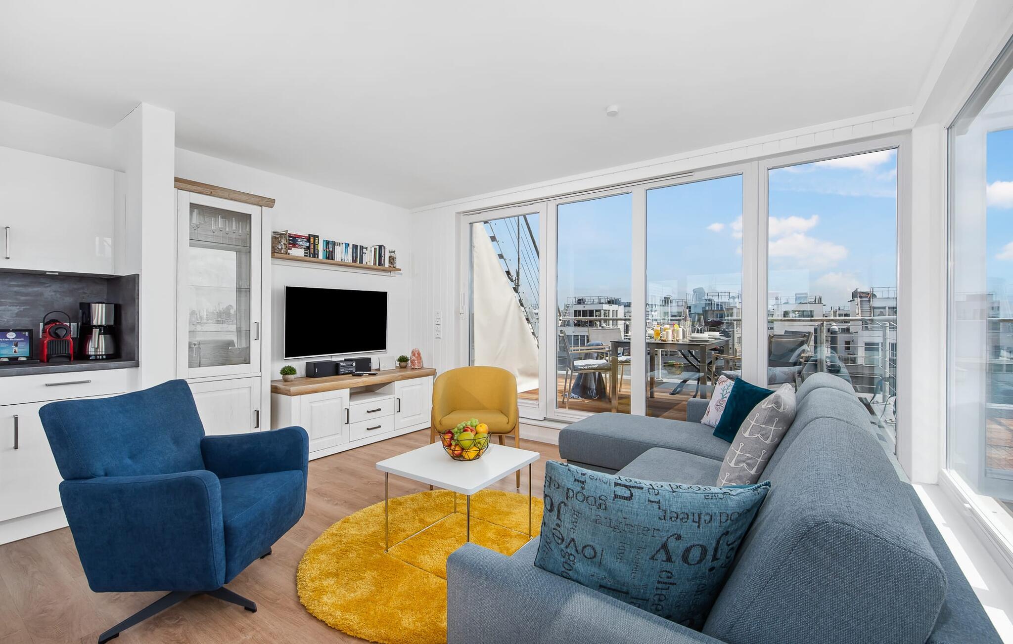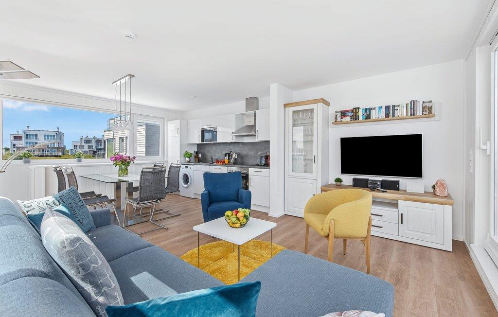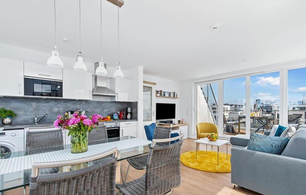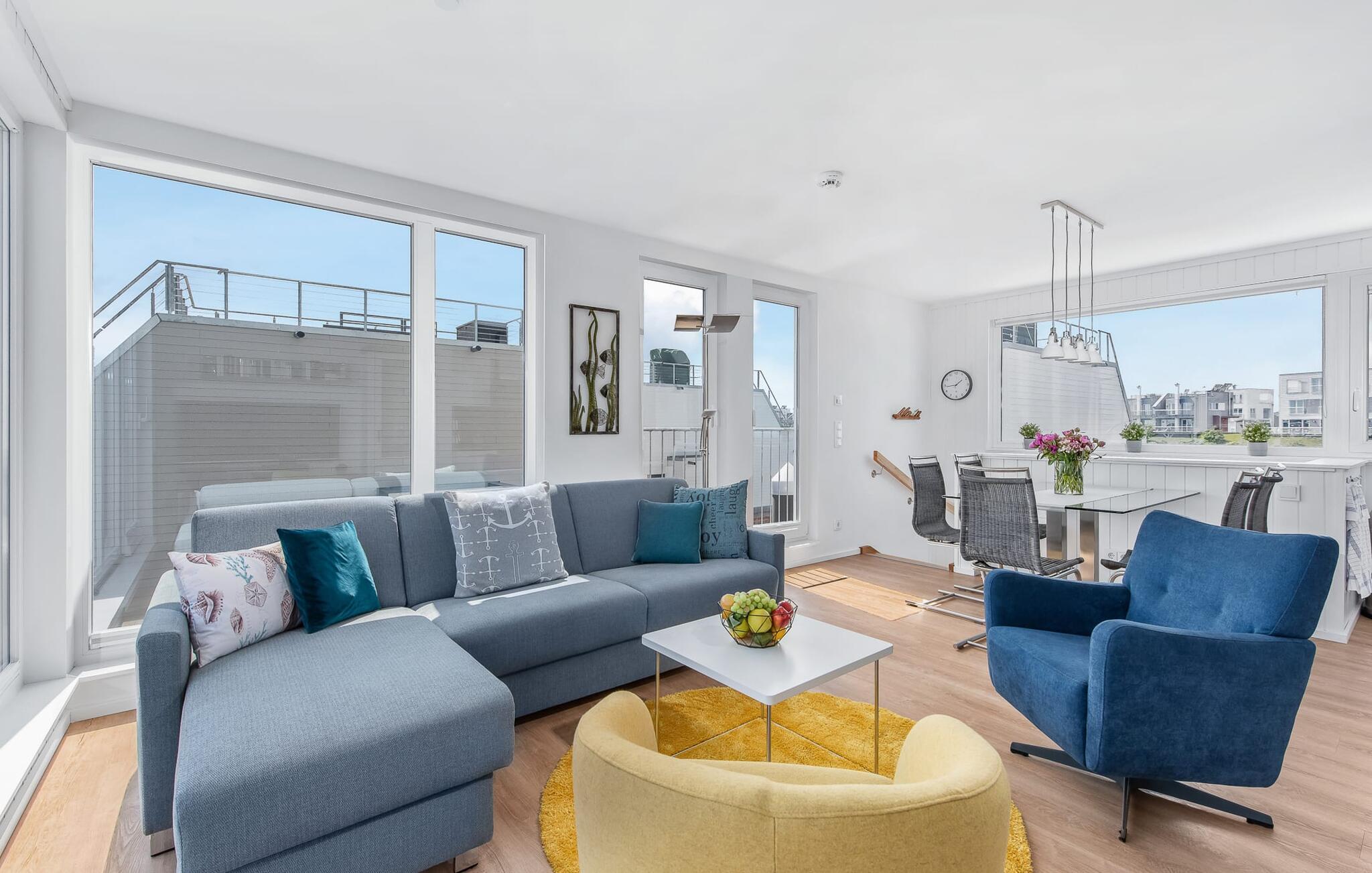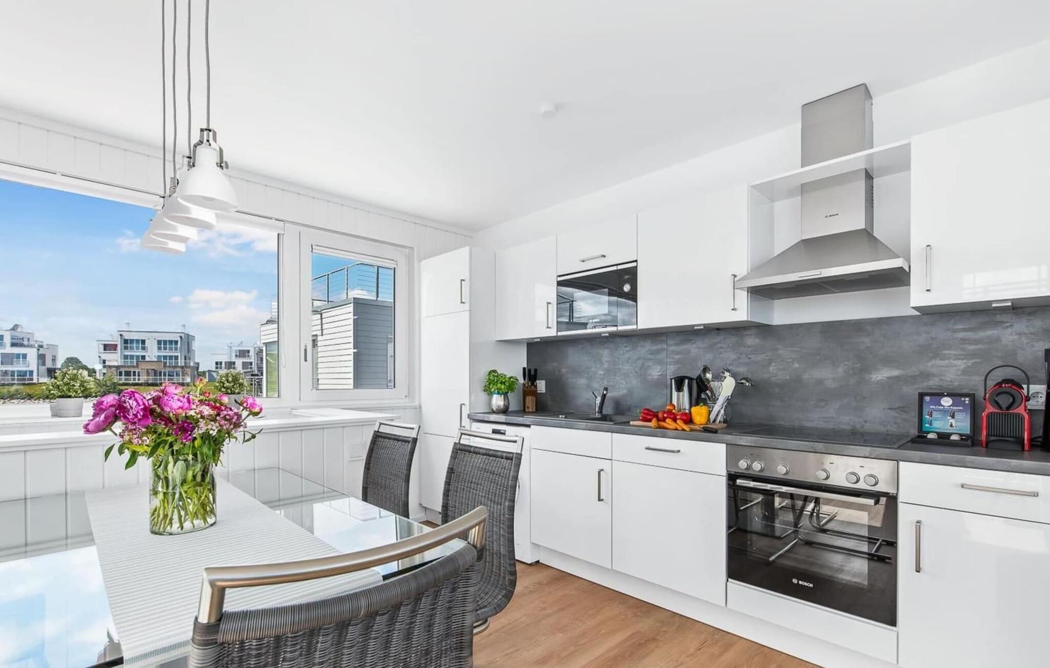 Den lyse og åben planløsning med opholds- og spisestue er placeret på det øverste niveau. Lækre feriemåltider kan tilberedes i det moderne køkken-alrum af høj kvalitet. Mens gulv til loft-vinduer giver en fænomenal udsigt hele vejen rundt, inviterer den tilstødende terrasse jer til at nyde den friske Østersøbrise.