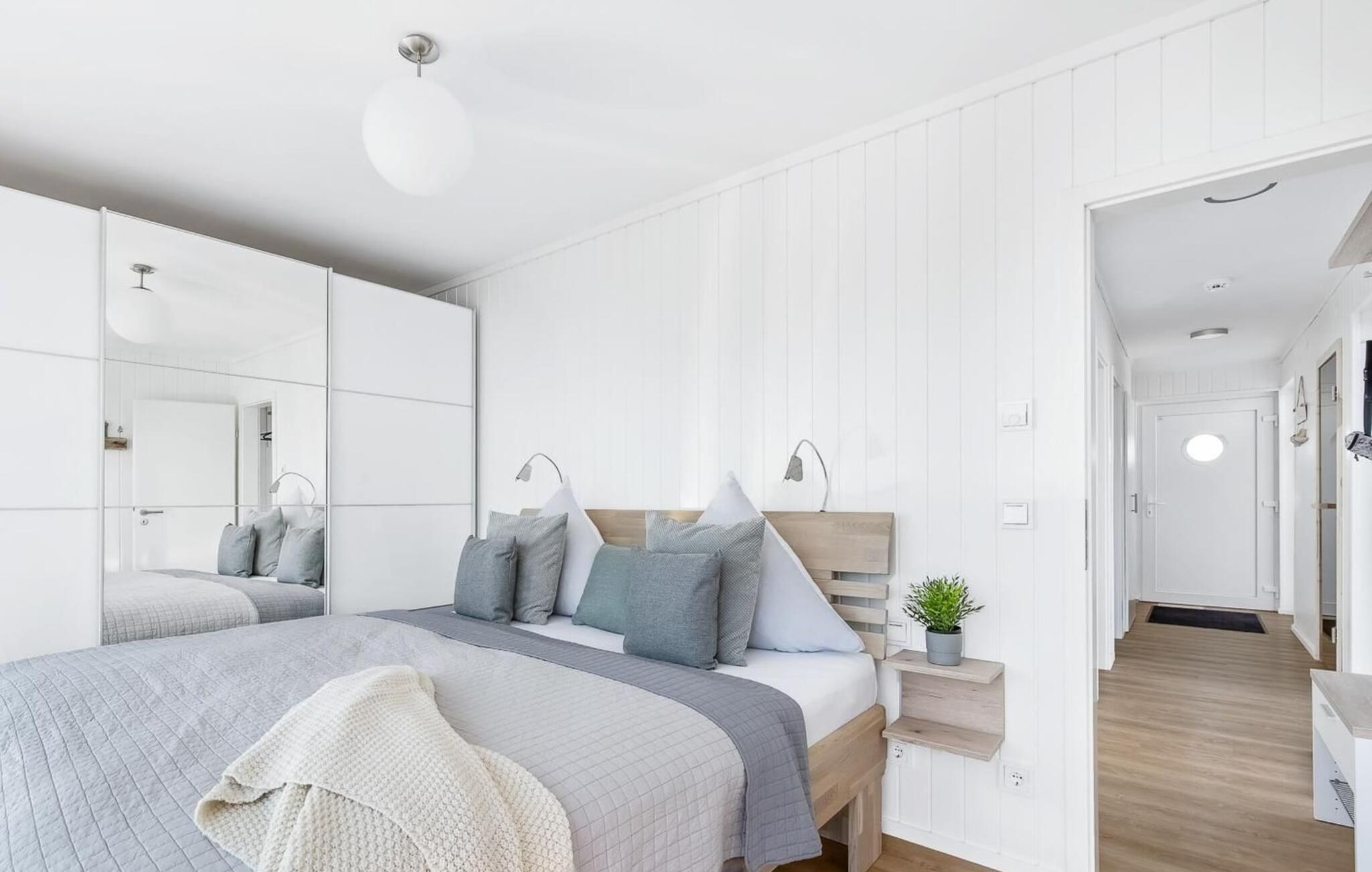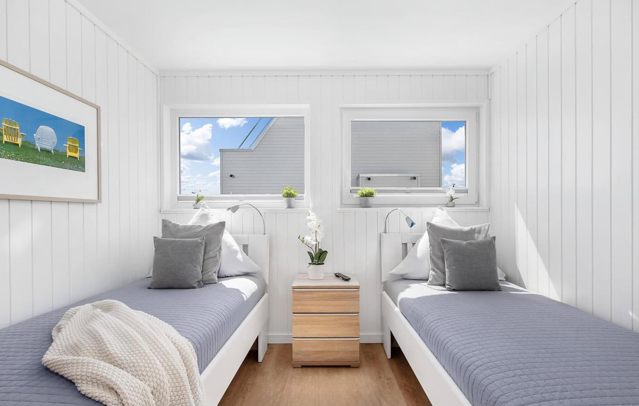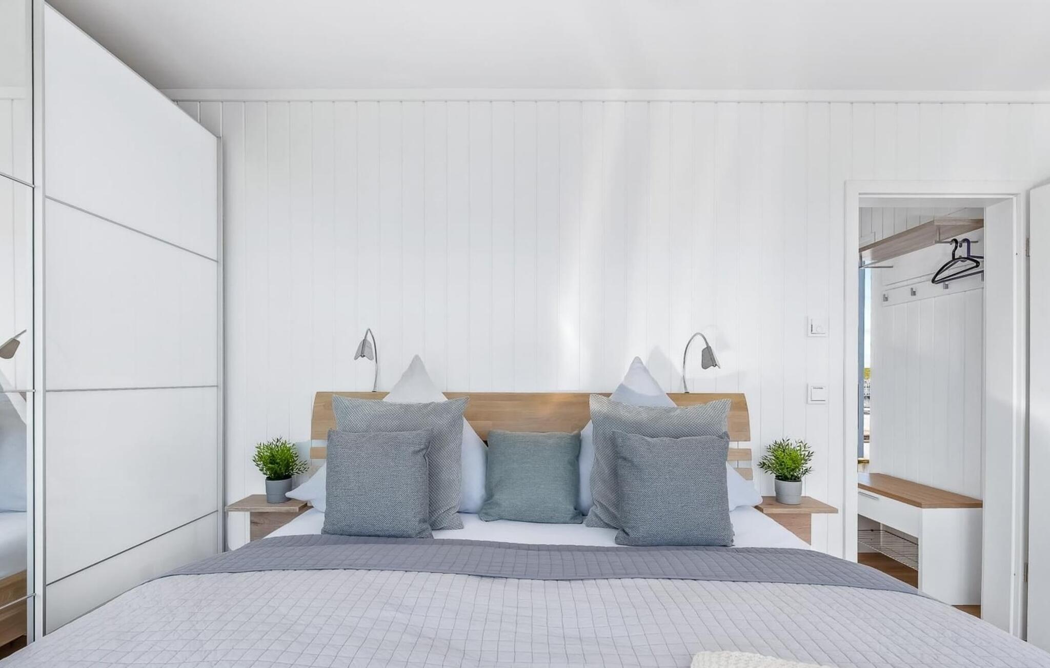 Fra denne terrasse kan I nå den 30 m2 store tagterrasse via en udvendig trappe med sol hele dagen og en panoramaudsigt over lystbådehavnen, Sleien og dens udmunding i Østersøen. Den medfølgende strandstol inviterer jer til at tilbringe hyggelige timer i solen eller læse. Under dæk er sovepladsen i det flydende hus. Det store soveværelse er en oplevelse, for herfra kan gæsterne falde i søvn og vågne op foran den umiddelbare vandkulisse. Gulv-til-loft vinduer og en terrasse i direkte tilknytning til soveværelset gør det muligt at gå rundt i huset. Et andet soveværelse med to enkeltsenge er også på feriehusets laveste niveau.