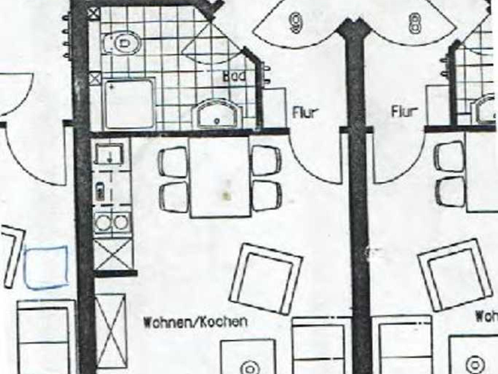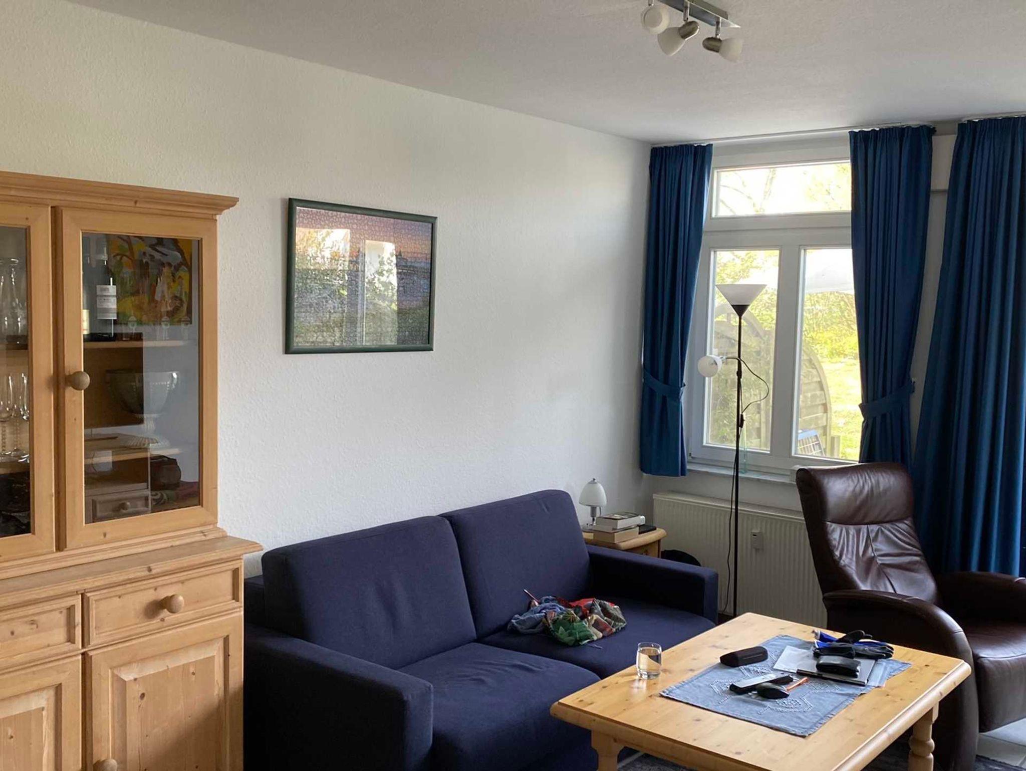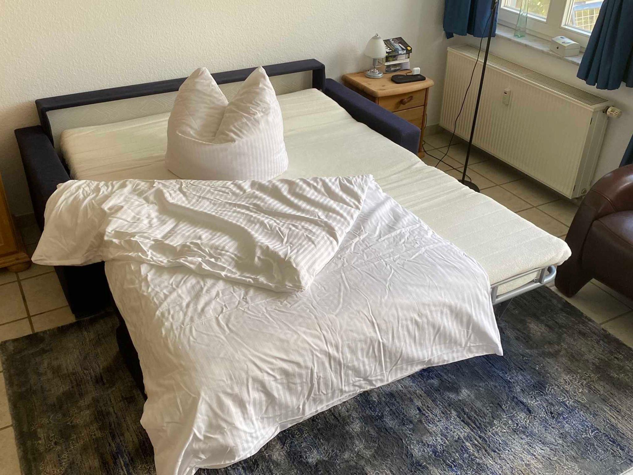 Ferienwohnung 2 Räume, Schlafraum mit Doppelbett, Wohnraum mit neuem Schlafsofa für 2 Personen, Esstisch, Küchenzeile, Sitzgruppe und großer TV-Flachbildschirm, schönes modernes Bad mit Dusche und WC.