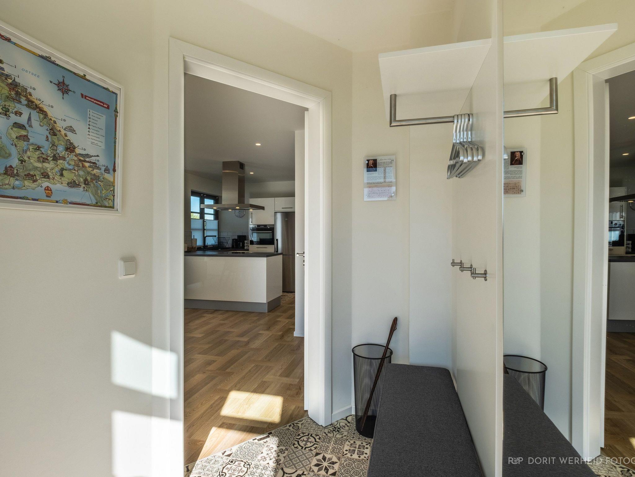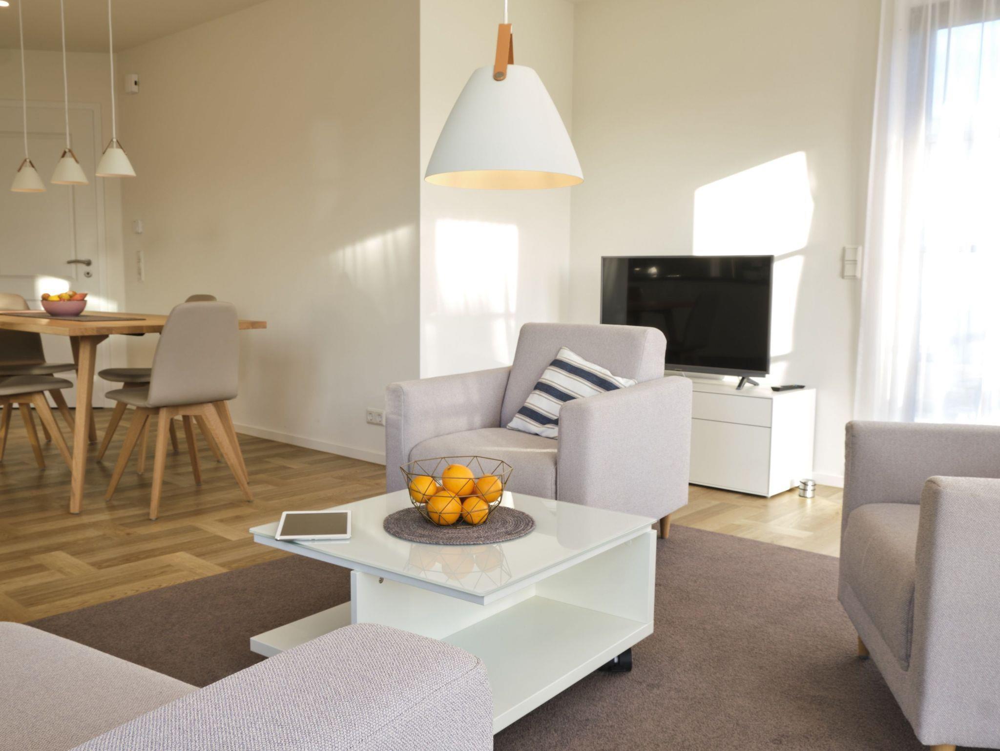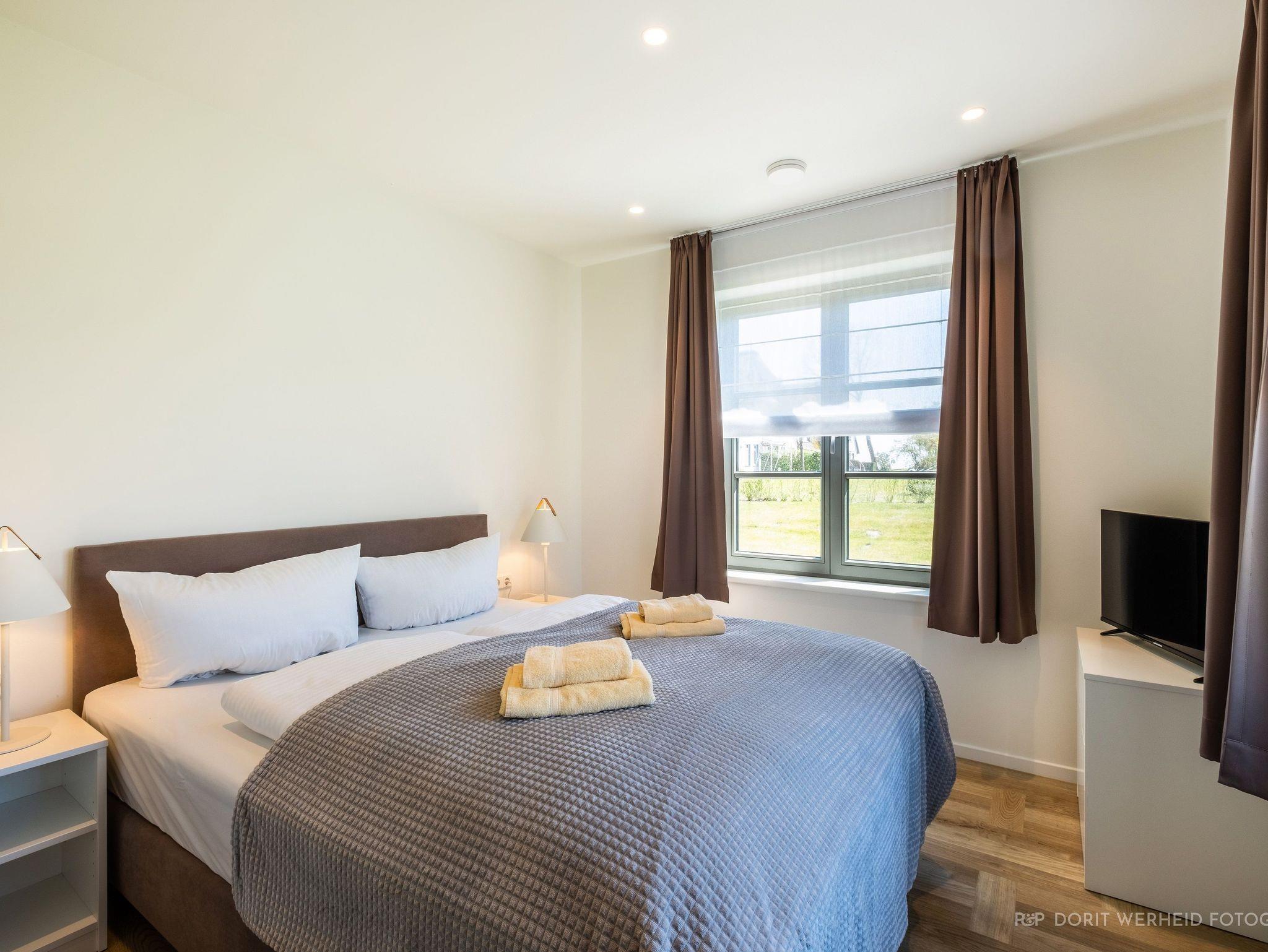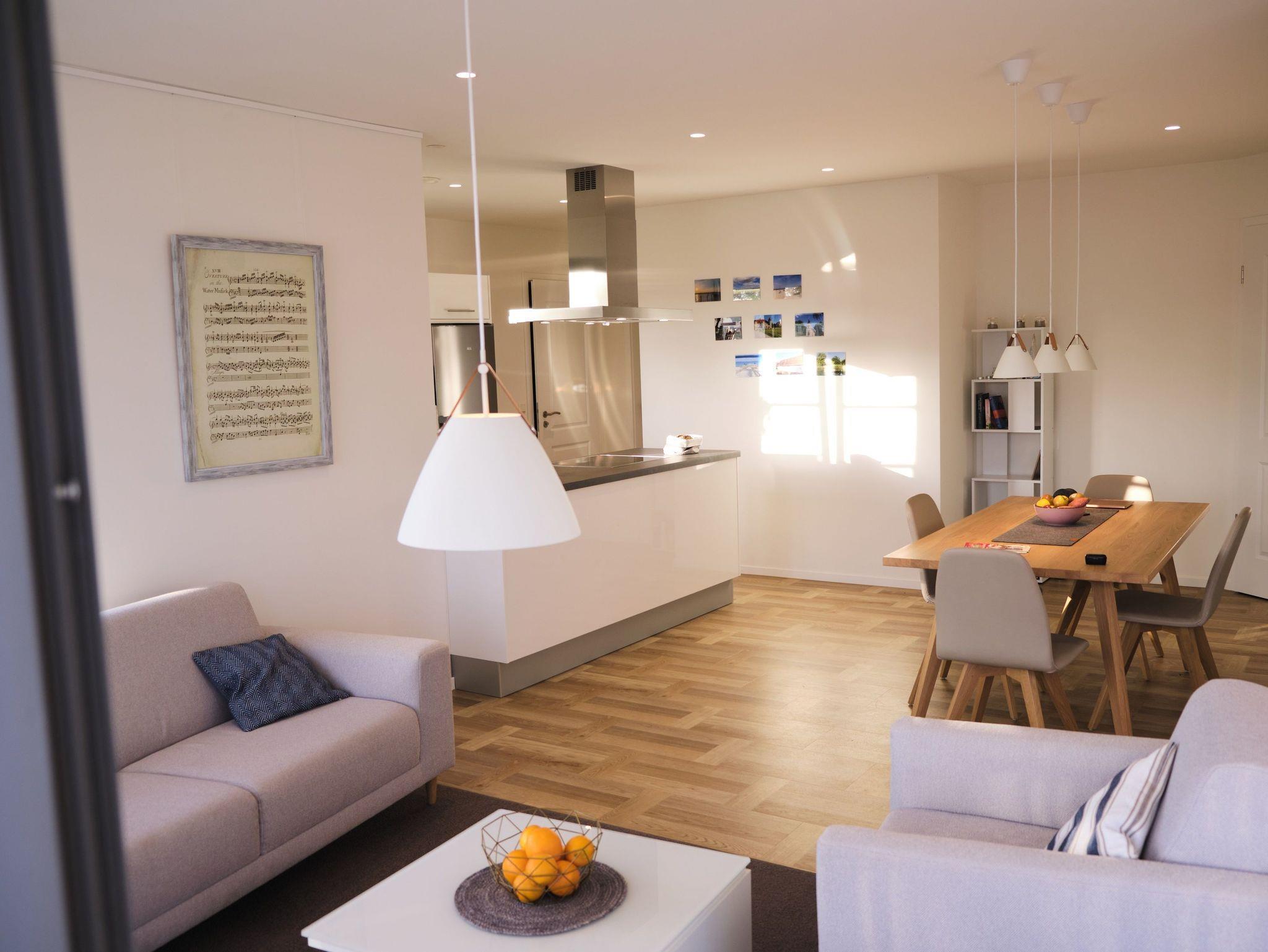 Den ca. 90 m² großen Innenbereich prägt ein schickes skandinavisches Design. Vom Flur abgehend befindet sich rechterhand das Schlafzimmer 1 und linkerhand ein geräumiges Badezimmer mit Badewanne, so dass hier auch im Winter herrlich entspannt werden kann. In den weitläufigen Wohnbereich gelangt man ebenfalls direkt vom Flur. Ess-, Wohnbereich und offene Küche gehen ineinander über, und bieten nicht zuletzt in Kombination mit der bodentief verglasten Terrassenfront in Erkerform auch von innen einen weiten Blick in die offene Landschaft und prägen so ein außergewöhnliches, gemütliches Raumgefühl. Eine helle und moderne Ausstattung, mit u.a. Rolf Benz Sitzmöbeln, runden das Wohlfühl-Ambiente ab. Das zweite Bad schließt direkt an das Hauptschlafzimmer (Schlafzimmer 2) an und ist mit einer bodentiefen Dusche mit Glasabtrennung bestückt. Beide Schlafzimmer verfügen über ein Doppelbett. Bei allen Betten handelt es sich um Boxspringbetten. Im Wohnzimmer, sowie im Schlafzimmer 1 befindet sich jeweils ein Flachbildschirm. Es gibt ein Babybeistellbett und ein Kinderbett bei Bedarf.