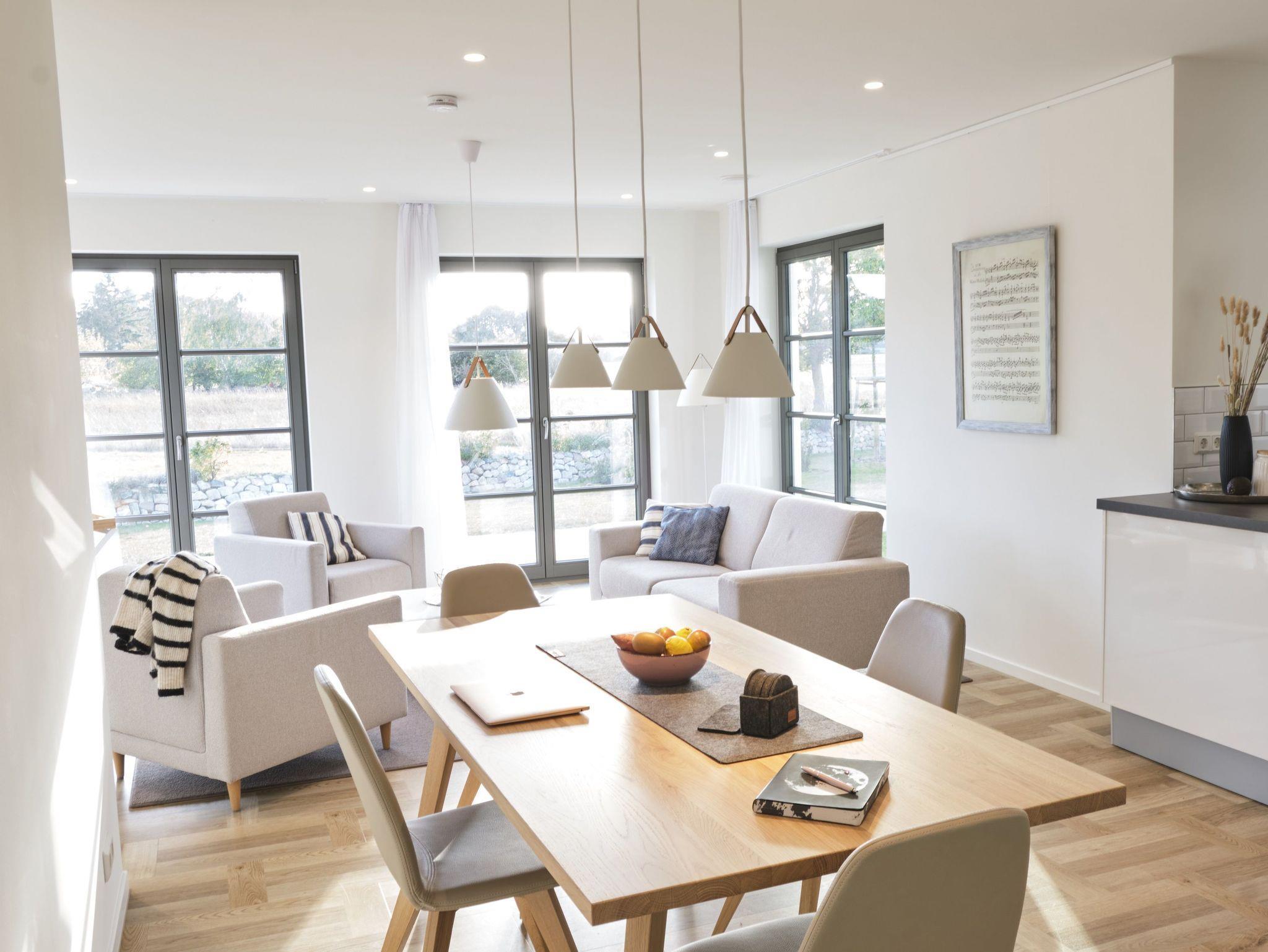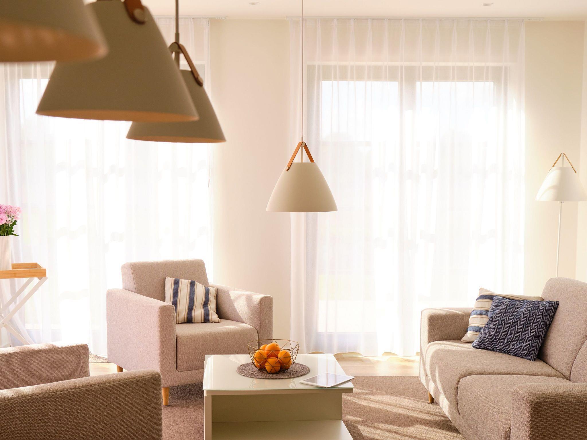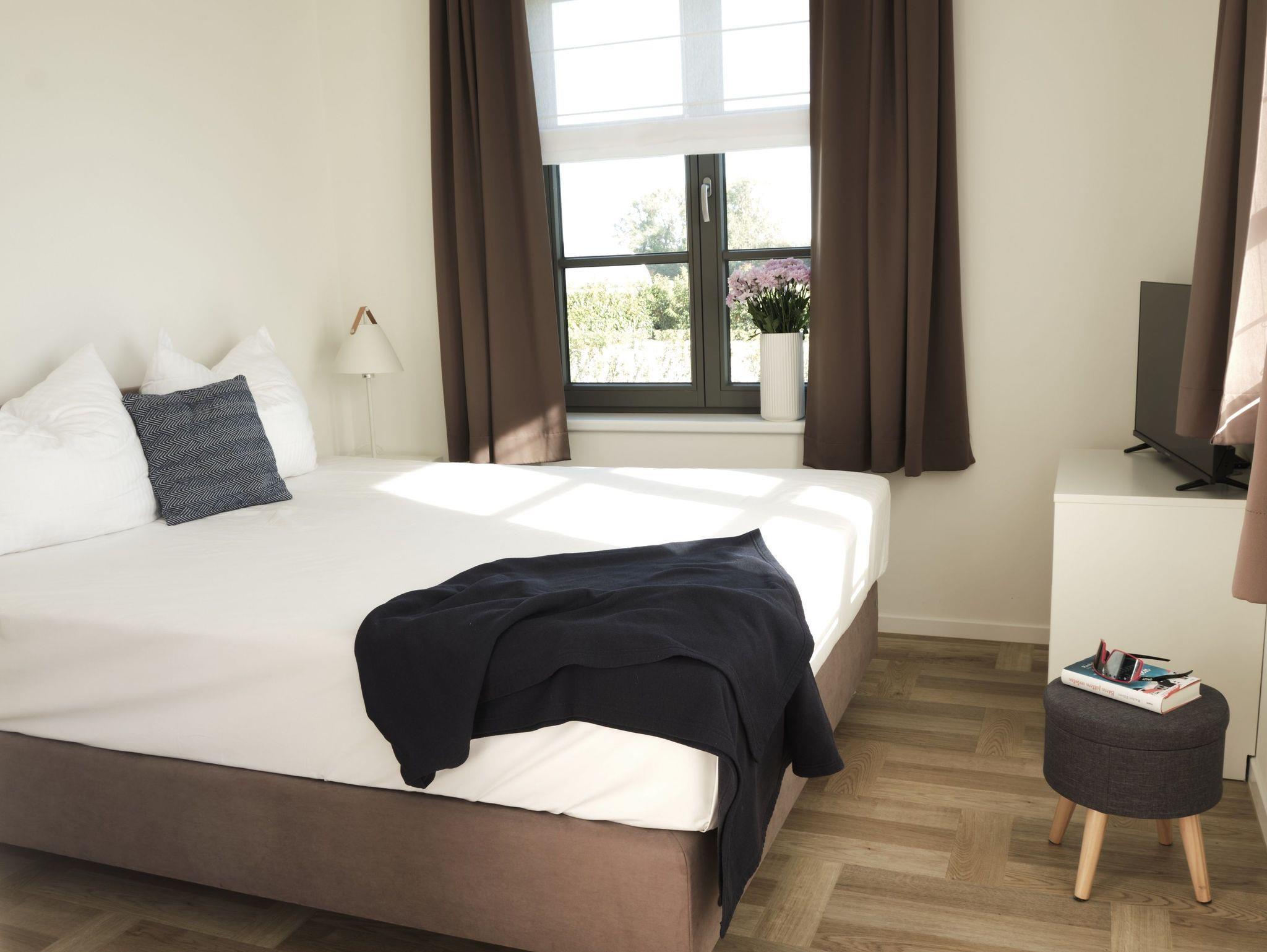 Den ca. 90 m² großen Innenbereich prägt ein schickes skandinavisches Design. Vom Flur abgehend befindet sich rechterhand das Schlafzimmer 1 und linkerhand ein geräumiges Badezimmer mit Badewanne, so dass hier auch im Winter herrlich entspannt werden kann. In den weitläufigen Wohnbereich gelangt man ebenfalls direkt vom Flur. Ess-, Wohnbereich und offene Küche gehen ineinander über, und bieten nicht zuletzt in Kombination mit der bodentief verglasten Terrassenfront in Erkerform auch von innen einen weiten Blick in die offene Landschaft und prägen so ein außergewöhnliches, gemütliches Raumgefühl. Eine helle und moderne Ausstattung, mit u.a. Rolf Benz Sitzmöbeln, runden das Wohlfühl-Ambiente ab. Das zweite Bad schließt direkt an das Hauptschlafzimmer (Schlafzimmer 2) an und ist mit einer bodentiefen Dusche mit Glasabtrennung bestückt. Beide Schlafzimmer verfügen über ein Doppelbett. Bei allen Betten handelt es sich um Boxspringbetten. Im Wohnzimmer, sowie im Schlafzimmer 1 befindet sich jeweils ein Flachbildschirm. Es gibt ein Babybeistellbett und ein Kinderbett bei Bedarf.