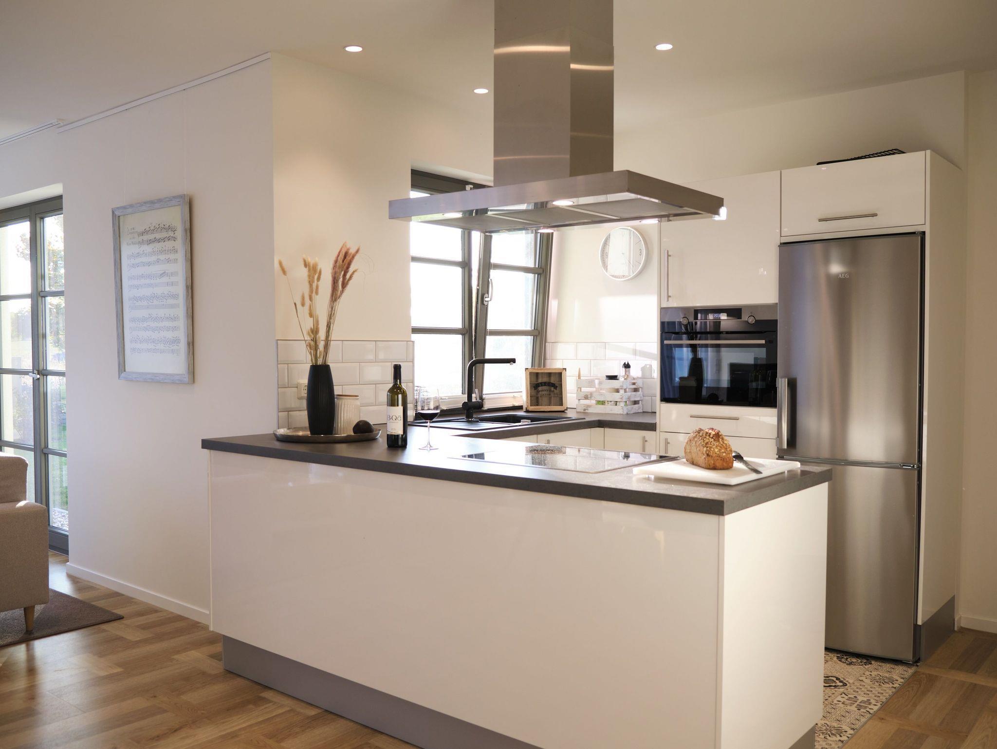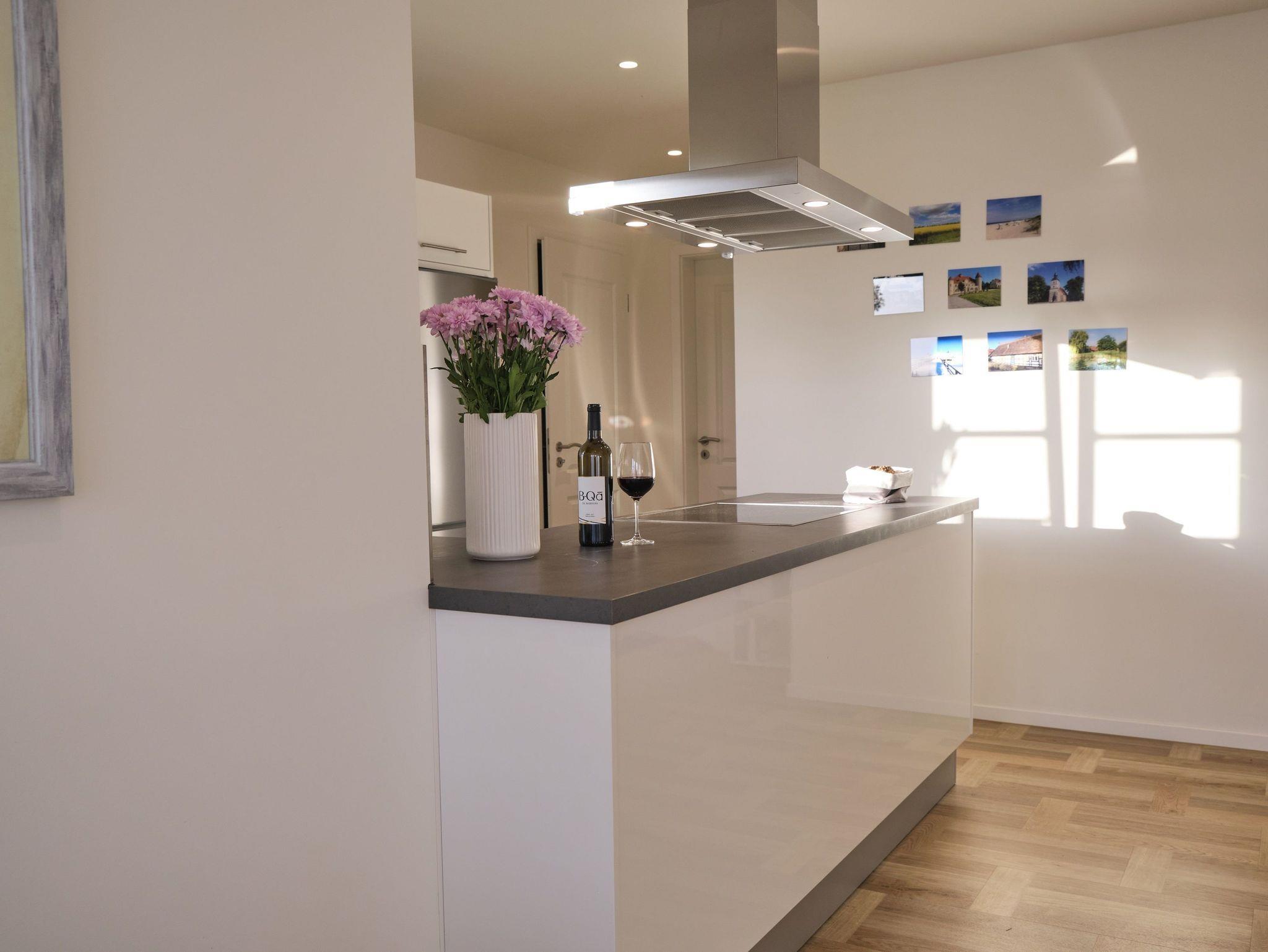Die Küche ist mit hochwertigen AEG Induktionskochfeld, kleinem Backofen mit Mikrowellenfunktion, Spülmaschine und einem großen Kühlschrank mit separatem Gefrierabteil, sowie Küchenkleingeräten von Krups (Kaffeemaschine, Toaster, Wasserkocher) und Severin (Handrührgerät) ausgestattet. Im Hauswirtschaftsraum, der von der Küche abgeht, befindet sich eine Waschmaschine, Bügelgerät und Bügelbrett, sowie genügend Stauraum für Vorräte und Koffer.