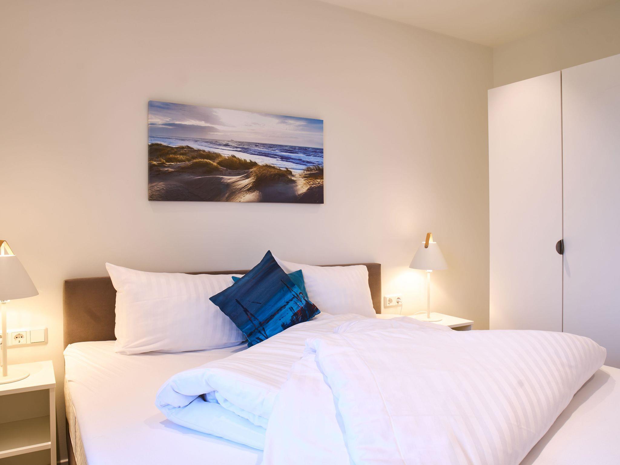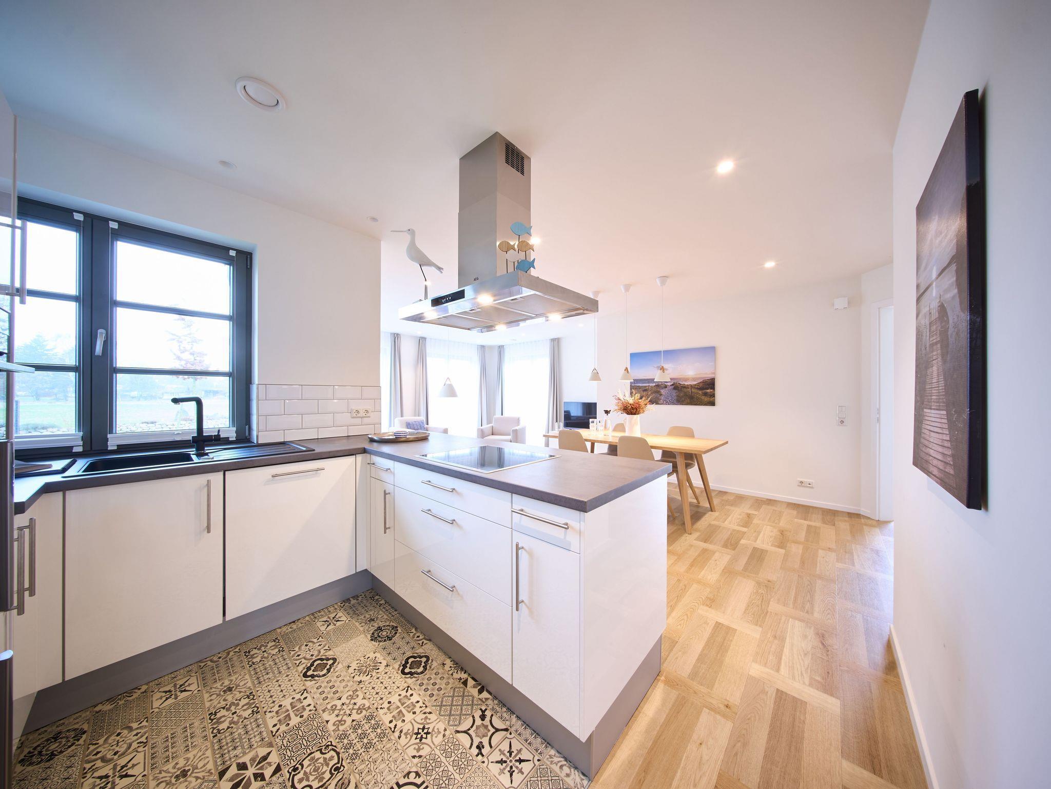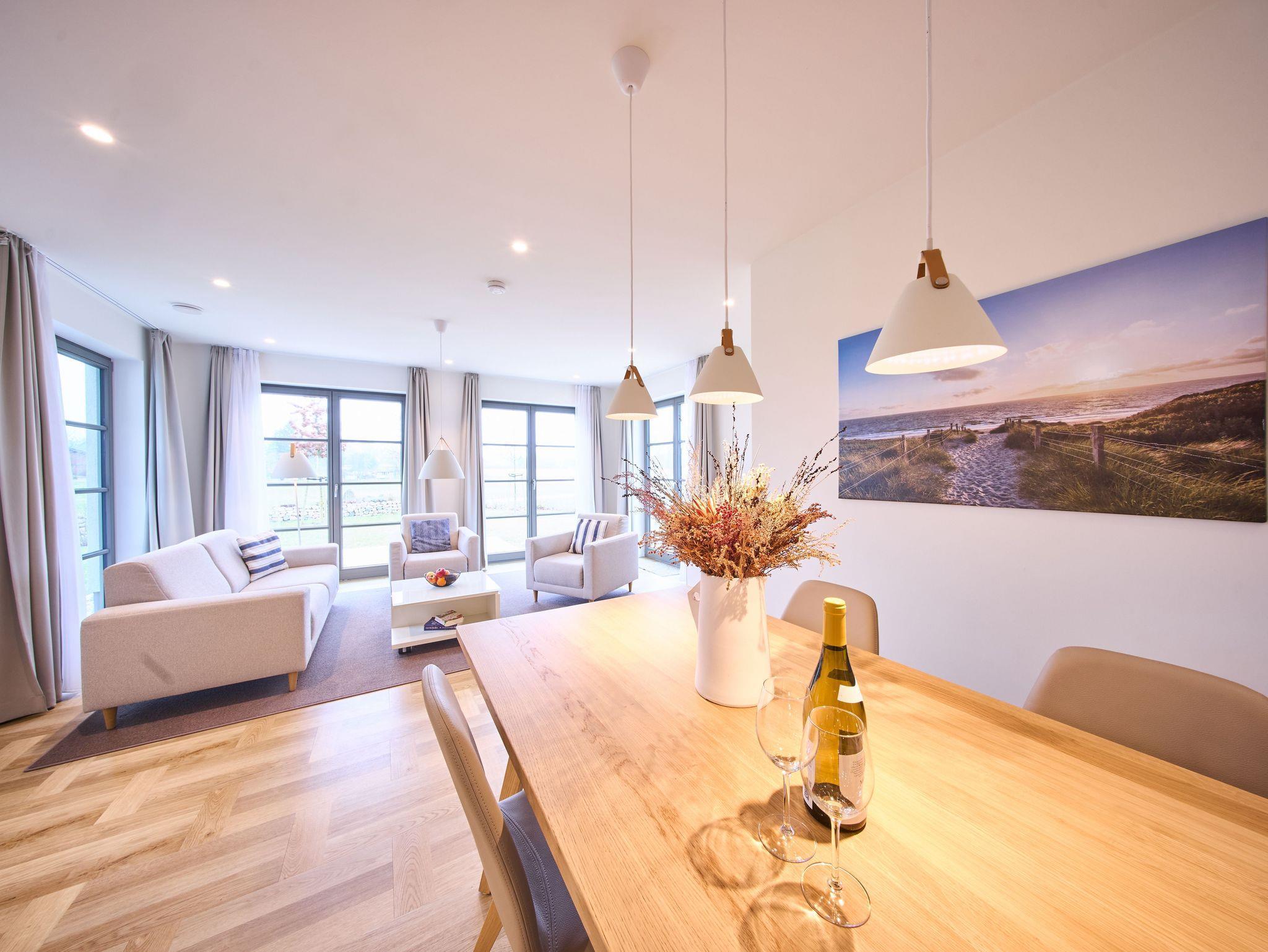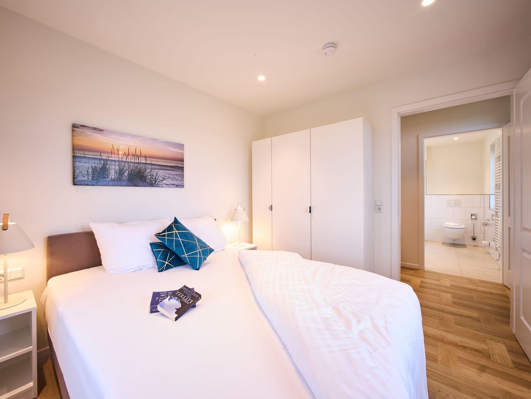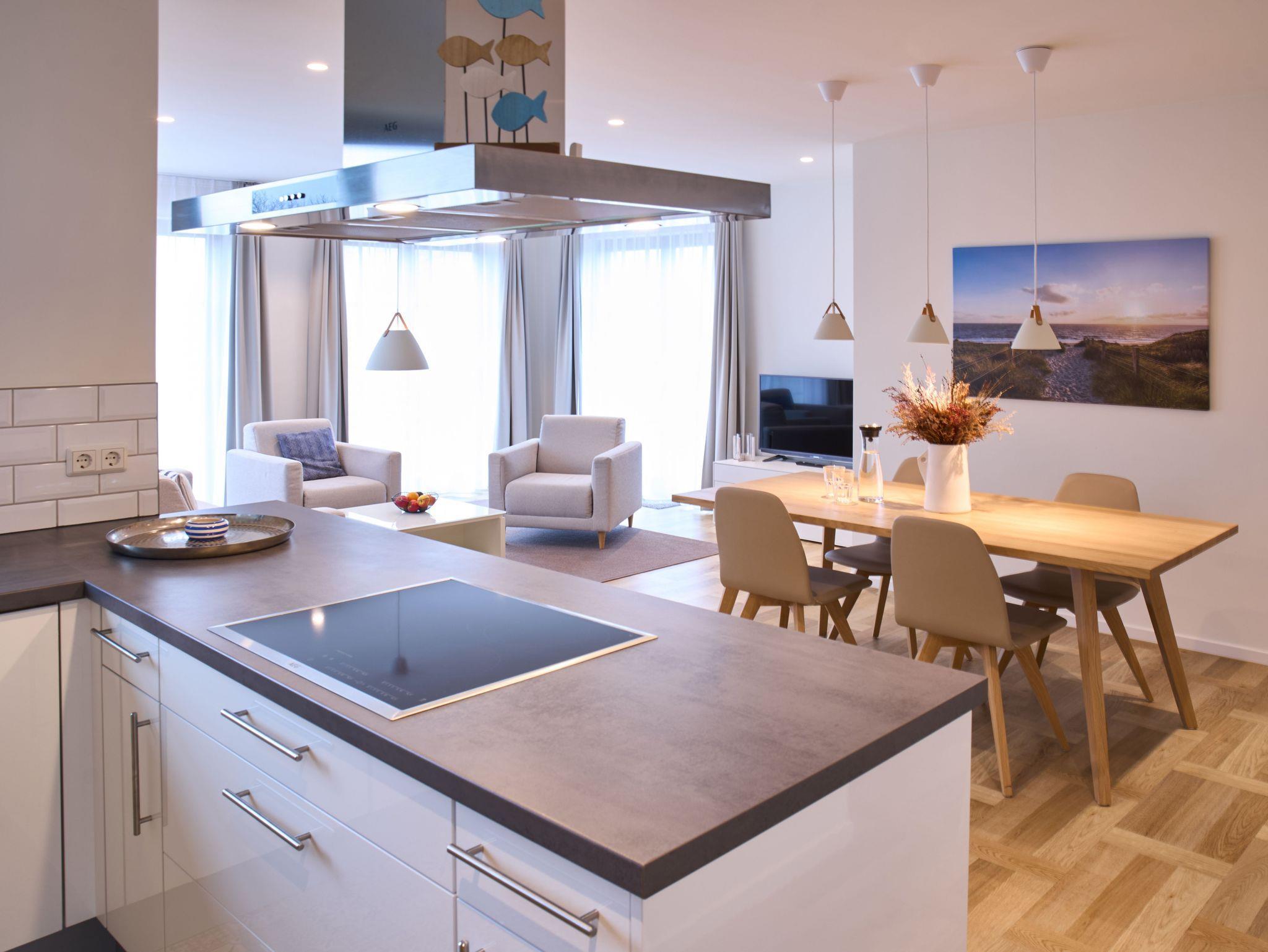 Die Wohnung ist hochwertig ausgestattet. Sie verfügt über eine komplett eingerichtete Einbauküche mit Spülmaschine, Mikrowelle, Induktionsherd und einen großen Kühlschrank mit separatem Gefrierabteil sowie Wasserkocher, Kaffeemaschine und Toaster. Ebenfalls verfügt die Wohnung über eine Waschmaschine. Der Wohn-Essraum mit offener Küche ist lichtdurchflutet und im Erscheinungsbild sehr freundlich und gemütlich mit modernen Möbeln eingerichtet. Vom Wohnzimmer aus gelangt man auf die beiden Terrassen, die in den großen Garten ragen. Ein großzügiges Tageslichtbad ist mit einer Duschbadewanne ausgestattet. Das zweite, zum Hauptschlafzimmer gehörende Bad ist innenliegend en suite und mit einer bodentiefen Dusche mit Glaswänden ausgestattet. Das Hauptschlafzimmer verfügt über ein größeres Doppelbett (200 x 180 cm) und das zweite Schlafzimmer über ein kleineres Doppelbett (200 x 160 cm). Bei allen Betten handelt es sich um Boxspringbetten. Im Wohnzimmer sowie im Hauptschlafzimmer befindet sich jeweils ein Flachbildschirm. Kinderreisebett sowie Hochstuhl können nach Verfügbarkeit bei der Verwalterin telefonisch bestellt werden. W-Lan ist nach den örtlichen Gegebenheiten verfügbar. In dieser Wohnung darf gern ein Hund mitgebracht werden.