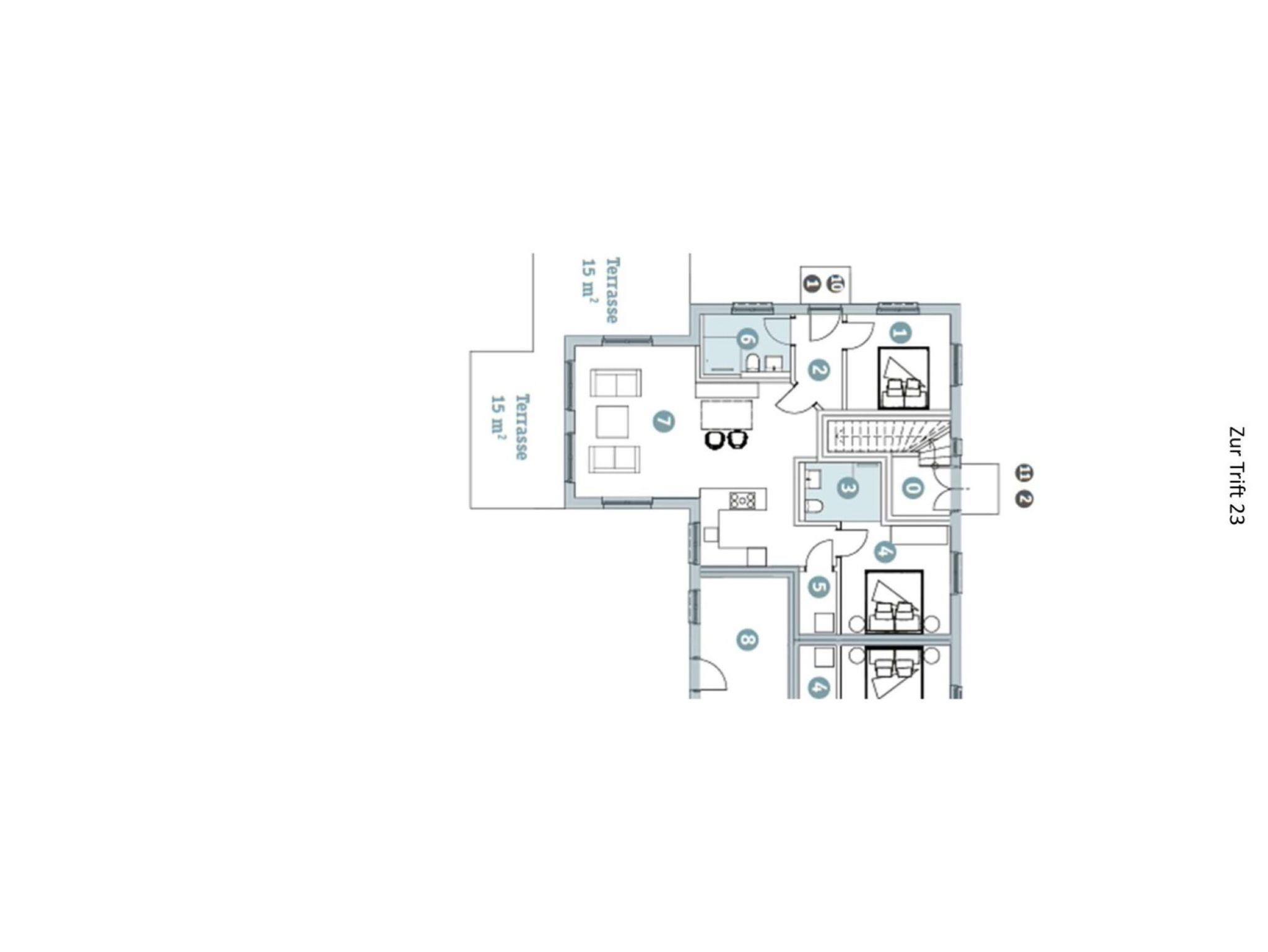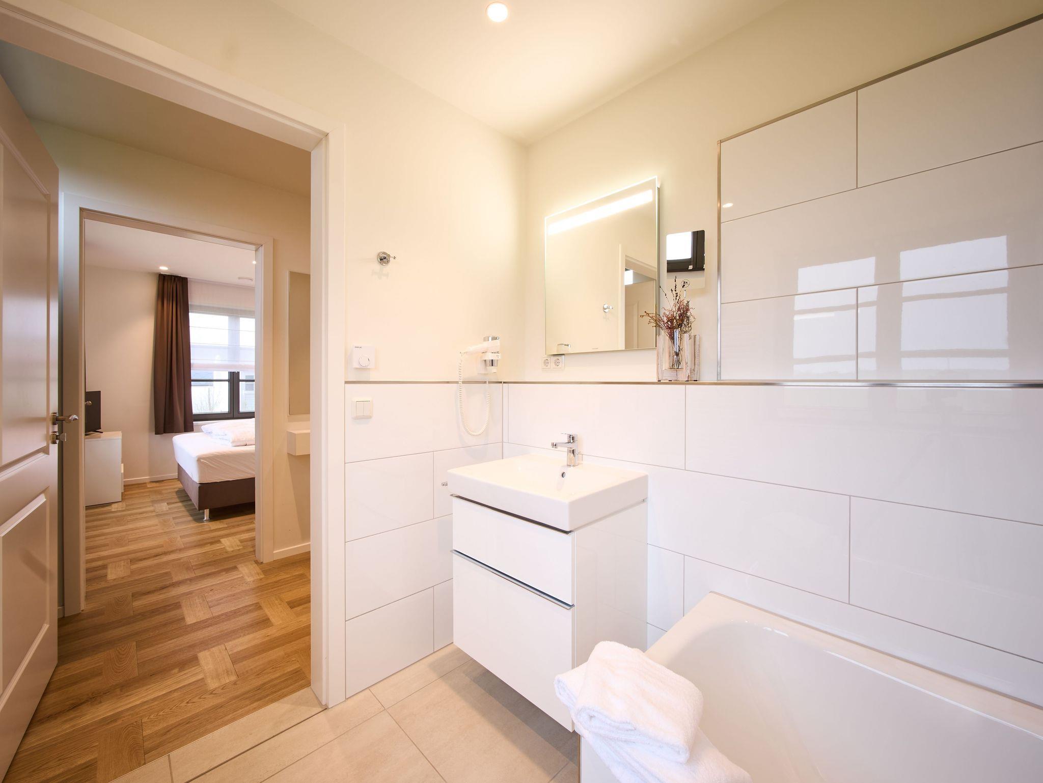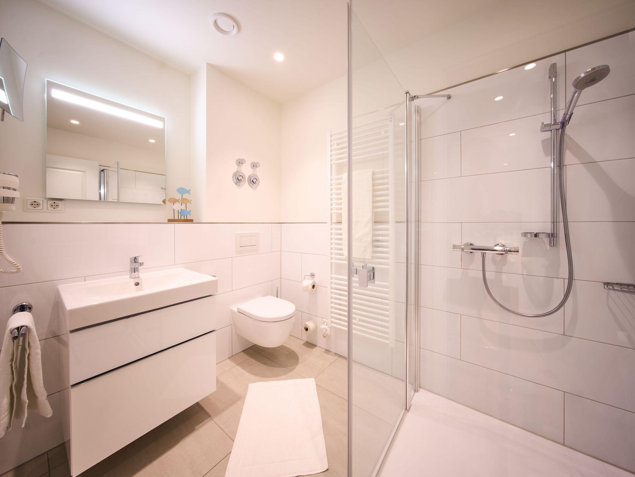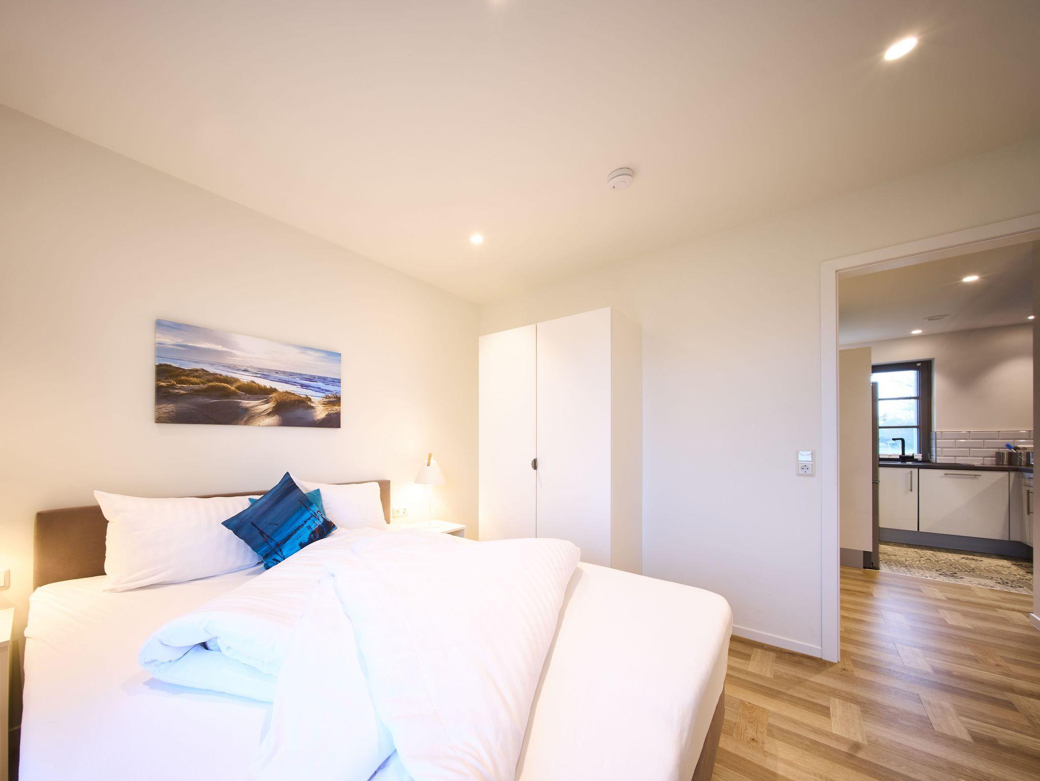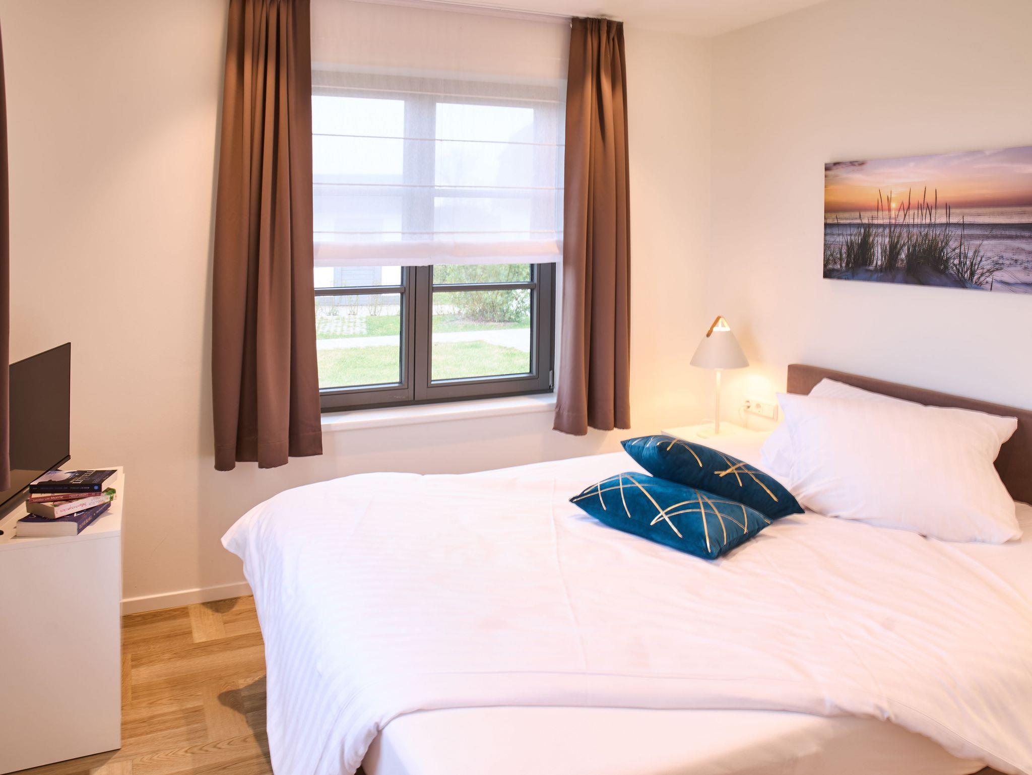 Die Wohnung ist hochwertig ausgestattet. Sie verfügt über eine komplett eingerichtete Einbauküche mit Spülmaschine, Mikrowelle, Induktionsherd und einen großen Kühlschrank mit separatem Gefrierabteil sowie Wasserkocher, Kaffeemaschine und Toaster. Ebenfalls verfügt die Wohnung über eine Waschmaschine. Der Wohn-Essraum mit offener Küche ist lichtdurchflutet und im Erscheinungsbild sehr freundlich und gemütlich mit modernen Möbeln eingerichtet. Vom Wohnzimmer aus gelangt man auf die beiden Terrassen, die in den großen Garten ragen. Ein großzügiges Tageslichtbad ist mit einer Duschbadewanne ausgestattet. Das zweite, zum Hauptschlafzimmer gehörende Bad ist innenliegend en suite und mit einer bodentiefen Dusche mit Glaswänden ausgestattet. Das Hauptschlafzimmer verfügt über ein größeres Doppelbett (200 x 180 cm) und das zweite Schlafzimmer über ein kleineres Doppelbett (200 x 160 cm). Bei allen Betten handelt es sich um Boxspringbetten. Im Wohnzimmer sowie im Hauptschlafzimmer befindet sich jeweils ein Flachbildschirm. Kinderreisebett sowie Hochstuhl können nach Verfügbarkeit bei der Verwalterin telefonisch bestellt werden. W-Lan ist nach den örtlichen Gegebenheiten verfügbar. In dieser Wohnung darf gern ein Hund mitgebracht werden.