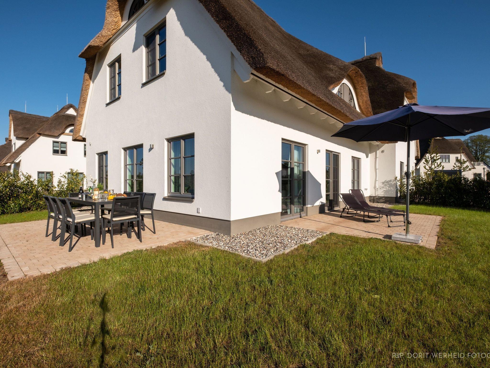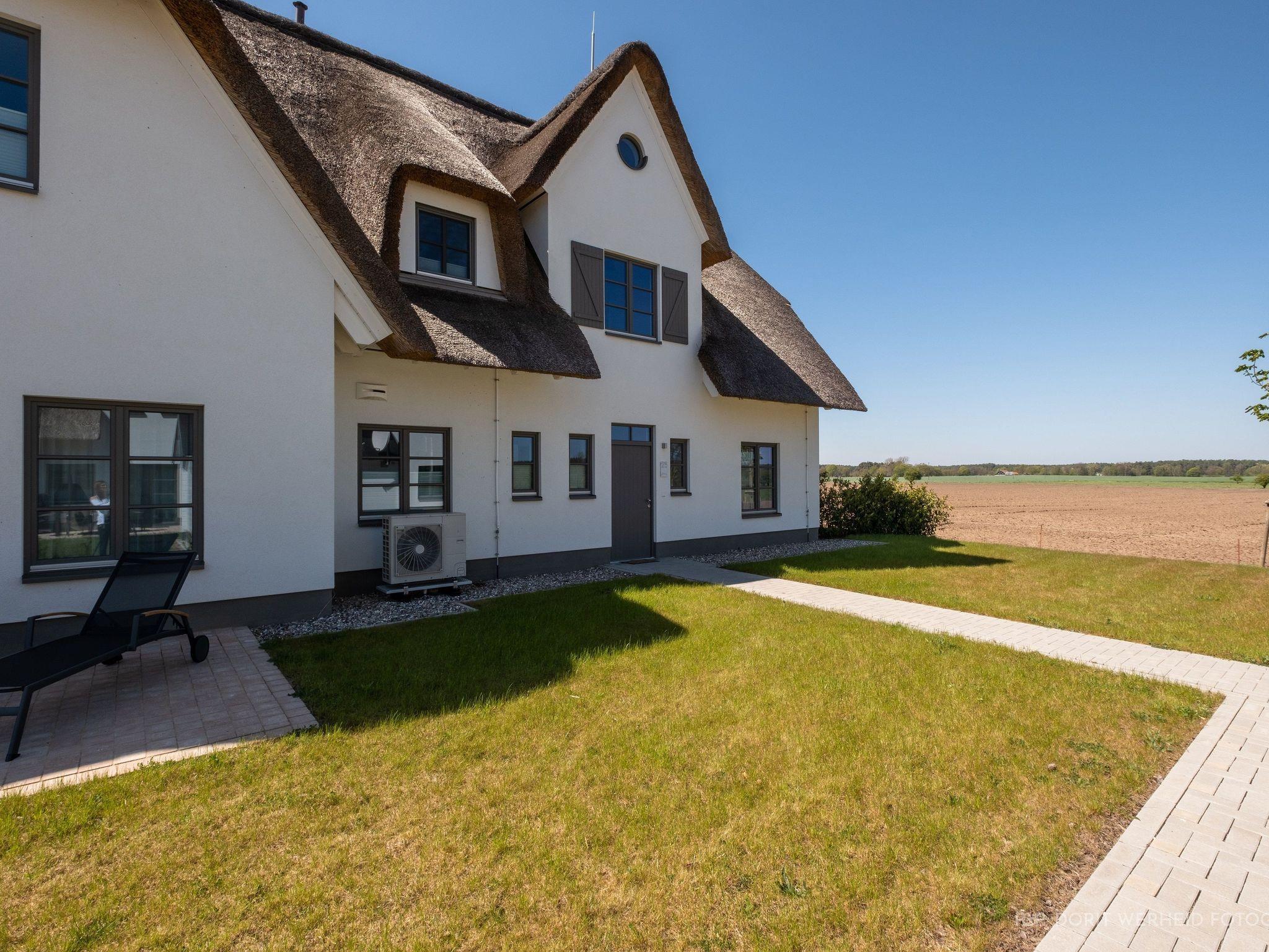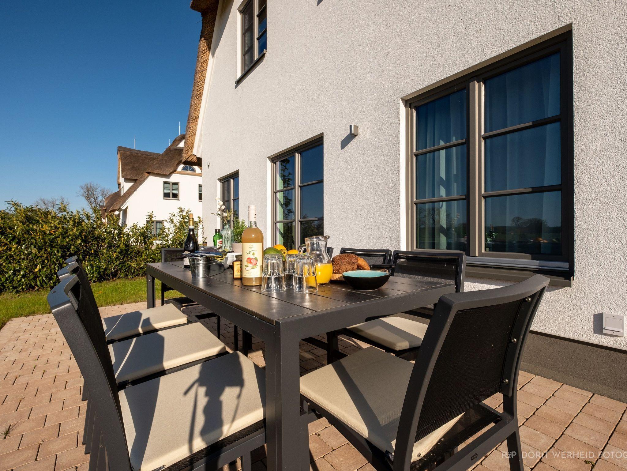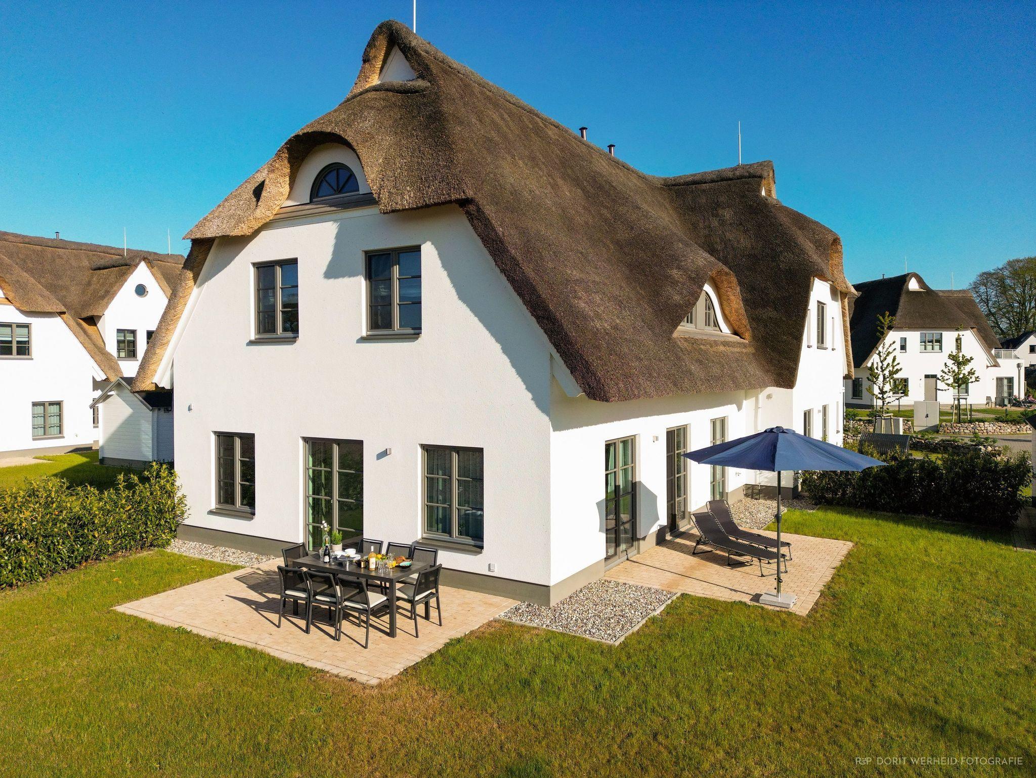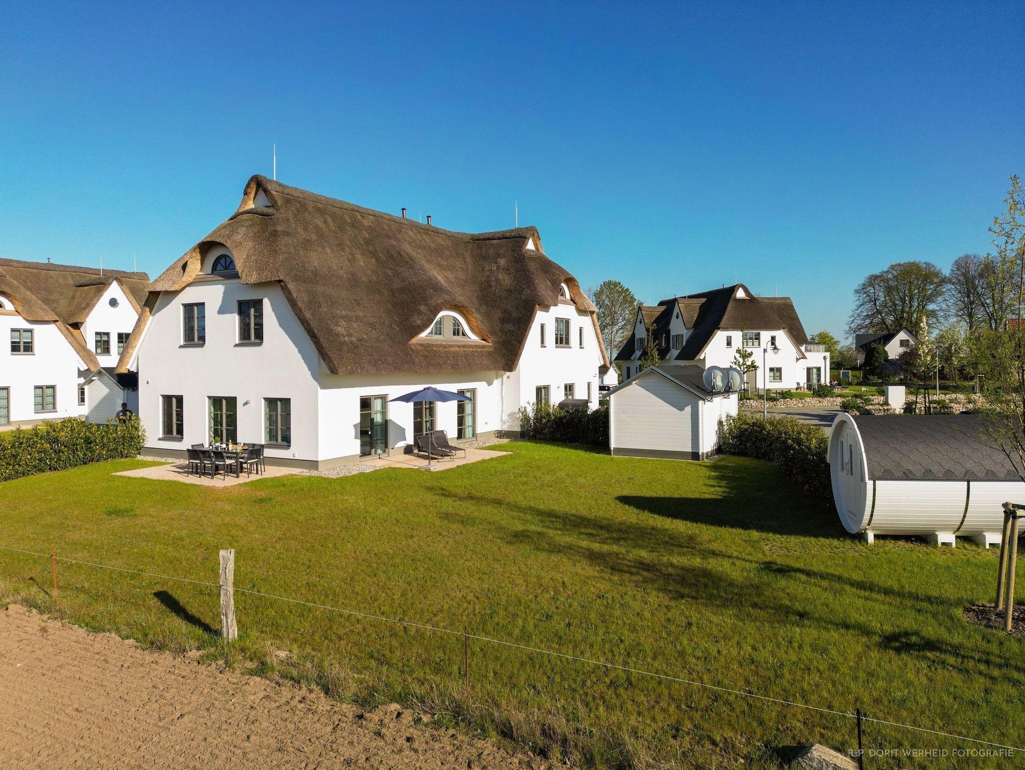Das Reetdachhaus ist hochwertig ausgestattet. Es verfügt über eine komplett eingerichtete Einbauküche mit Spülmaschine, Mikrowelle, Induktionsherd und großem Kühlschrank mit separatem Gefrierabteil sowie Kaffeemaschine, Wasserkocher und Toaster. Ebenfalls verfügt das Ferienhaus über eine Waschmaschine. Der Wohnraum ist aufgeteilt in einen Küchen- und Essbereich, sowie in einen hellen und modernen Wohnbereich. Vor dem Haus befinden sich zwei Terrassen, von denen Sie einen herrlichen Blick ins Grüne genießen können. Das Ferienhaus bietet insgesamt 4 Schlafzimmer und drei Bäder, die jeweils mit einer Dusche ausgestattet sind. Ein Schlafzimmer und Badezimmer befinden sich im Erdgeschoß und sind jeweils vom Flur erreichbar. Im Obergeschoß befindet sich ein Schlafzimmer mit „Bad en suite“ sowie zwei weitere Schlafzimmer und ein Badezimmer die vom Flur aus erreichbar sind. Bei allen Betten handelt es sich um Boxspringbetten. Kinderreisebett sowie Hochstuhl können bestellt werden. Saunahandtücher sind nicht im Preis vorhanden und können gegen Gebühr bei der Verwalterin dazugebucht werden.