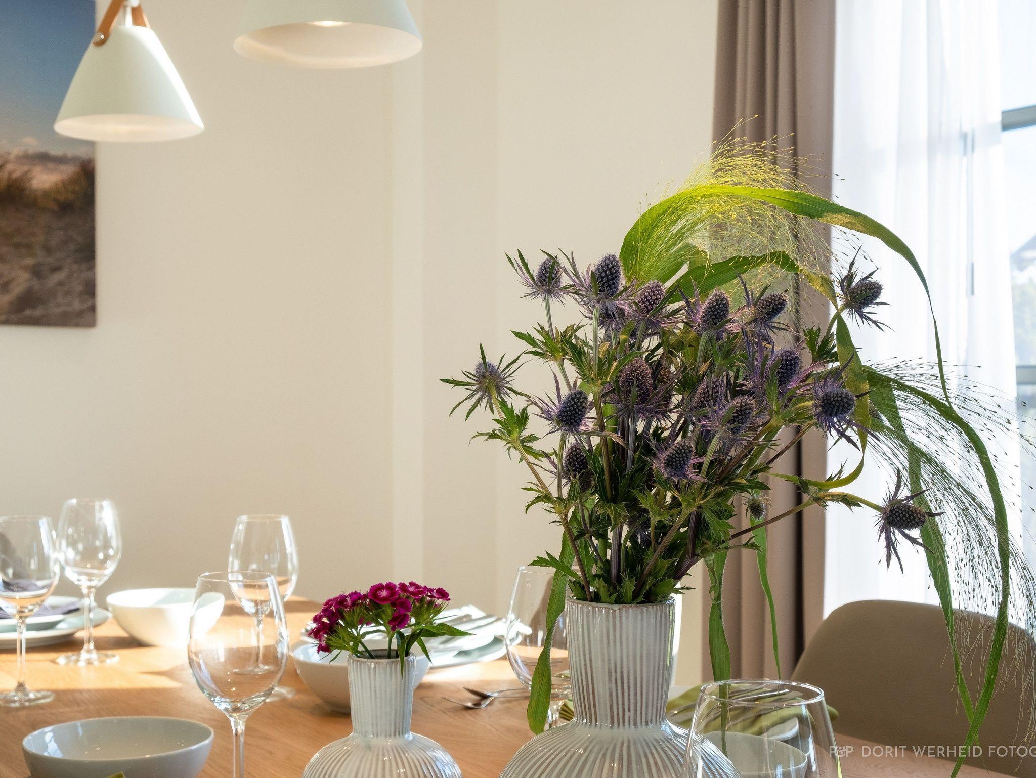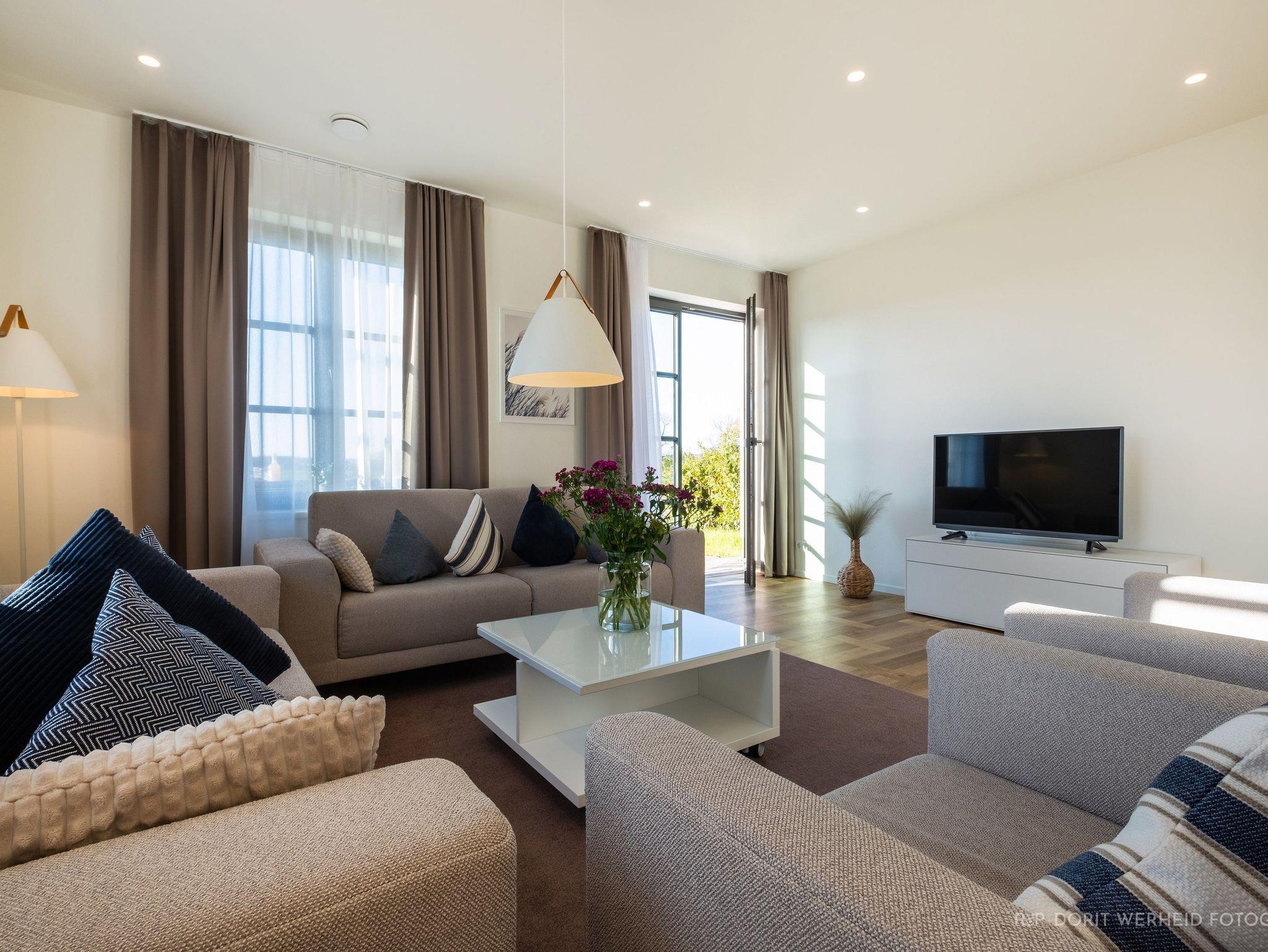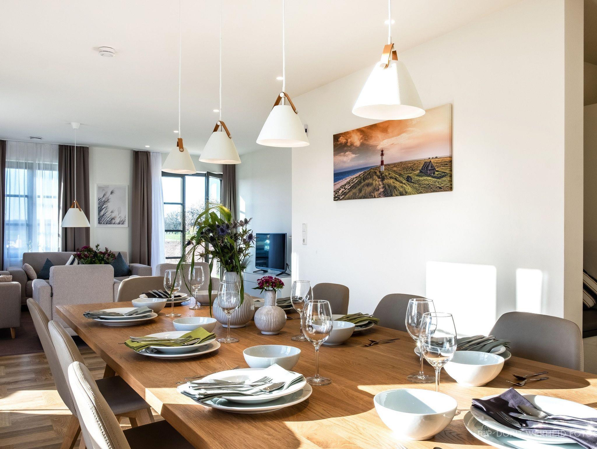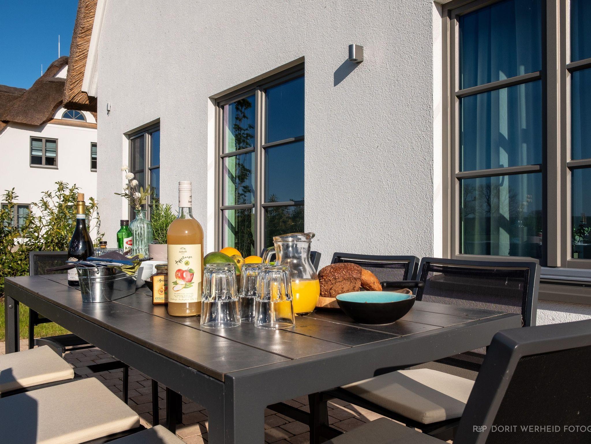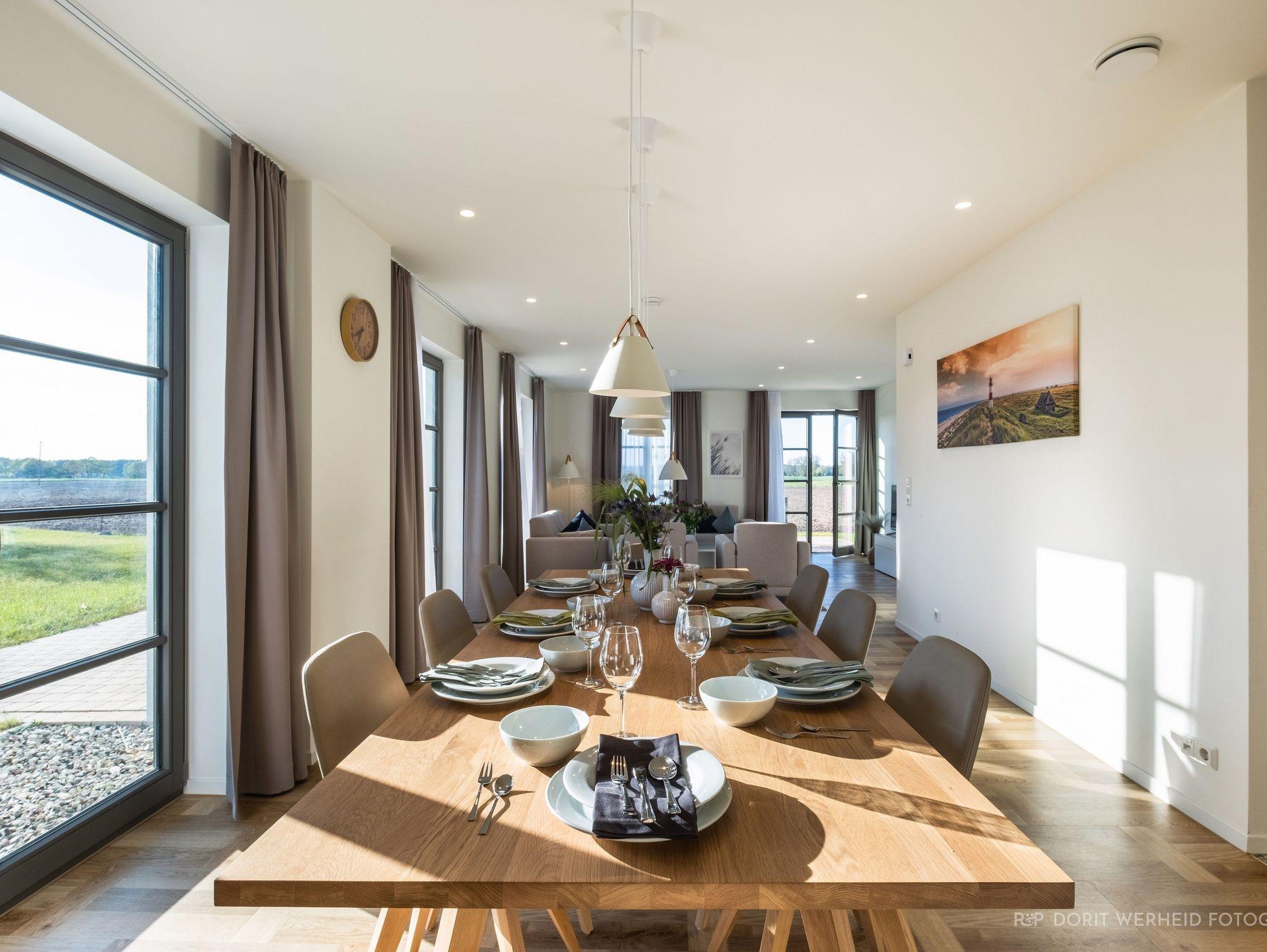 Das Reetdachhaus ist hochwertig ausgestattet. Es verfügt über eine komplett eingerichtete Einbauküche mit Spülmaschine, Mikrowelle, Induktionsherd und großem Kühlschrank mit separatem Gefrierabteil sowie Kaffeemaschine, Wasserkocher und Toaster. Ebenfalls verfügt das Ferienhaus über eine Waschmaschine. Der Wohnraum ist aufgeteilt in einen Küchen- und Essbereich, sowie in einen hellen und modernen Wohnbereich. Vor dem Haus befinden sich zwei Terrassen, von denen Sie einen herrlichen Blick ins Grüne genießen können. Das Ferienhaus bietet insgesamt 4 Schlafzimmer und drei Bäder, die jeweils mit einer Dusche ausgestattet sind. Ein Schlafzimmer und Badezimmer befinden sich im Erdgeschoß und sind jeweils vom Flur erreichbar. Im Obergeschoß befindet sich ein Schlafzimmer mit „Bad en suite“ sowie zwei weitere Schlafzimmer und ein Badezimmer die vom Flur aus erreichbar sind. Bei allen Betten handelt es sich um Boxspringbetten. Kinderreisebett sowie Hochstuhl können bestellt werden. Saunahandtücher sind nicht im Preis vorhanden und können gegen Gebühr bei der Verwalterin dazugebucht werden.