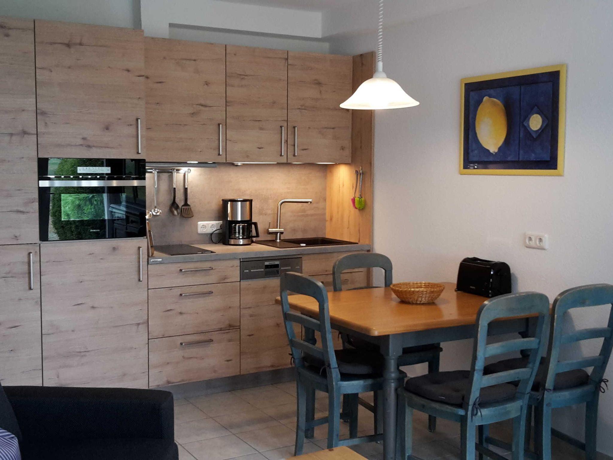 Die Küche ist ausgestattet mit einem modernen Backofen mit Mikrowellenfunktion, einem 2-Platten-Induktionskochfeld, Geschirrspüler, Kühlschrank inkl. Gefrierfach, Toaster, Wasserkocher und Kaffeemaschine.